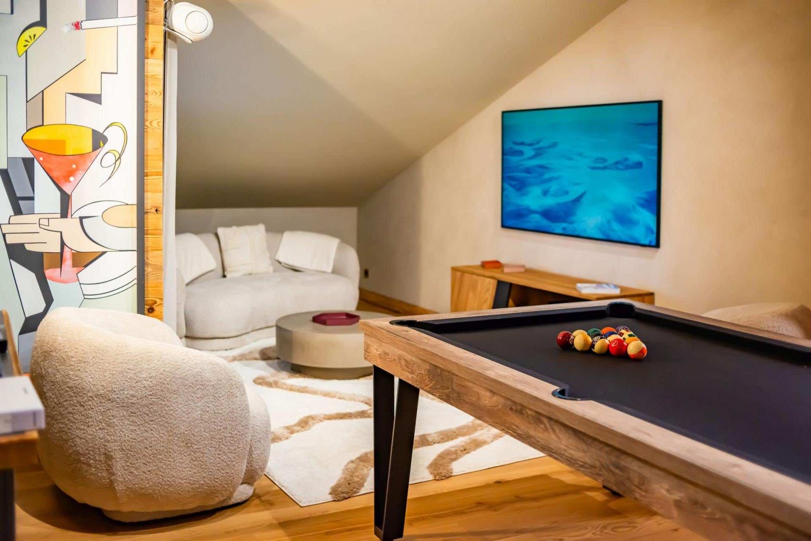 For entertainment and socialising, Chalet Sneg includes a separate TV lounge and games room equipped with a pool table that can also be converted into a meeting table with a projector screen, making the chalet suitable for both leisure groups and corporate retreats. Additional features such as a wine cellar and comfortable entertainment spaces further enhance the chalet’s inviting and sociable atmosphere.