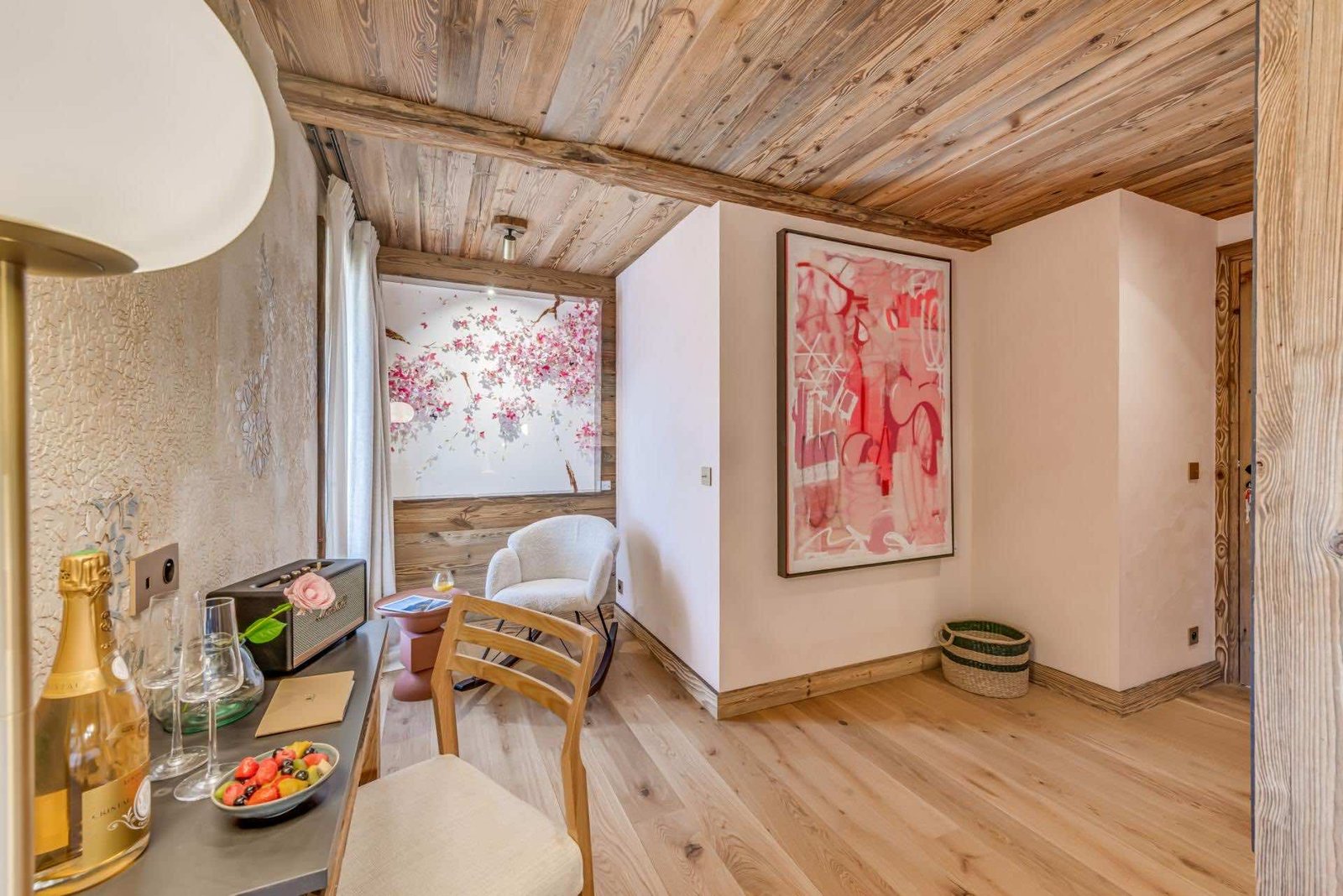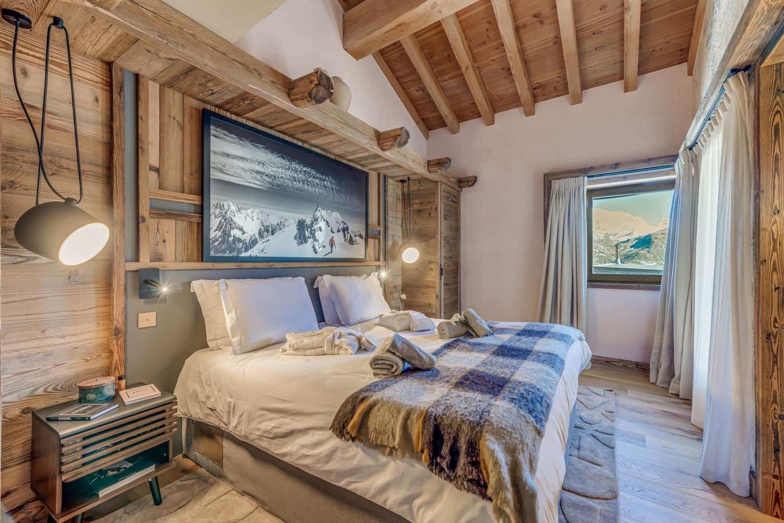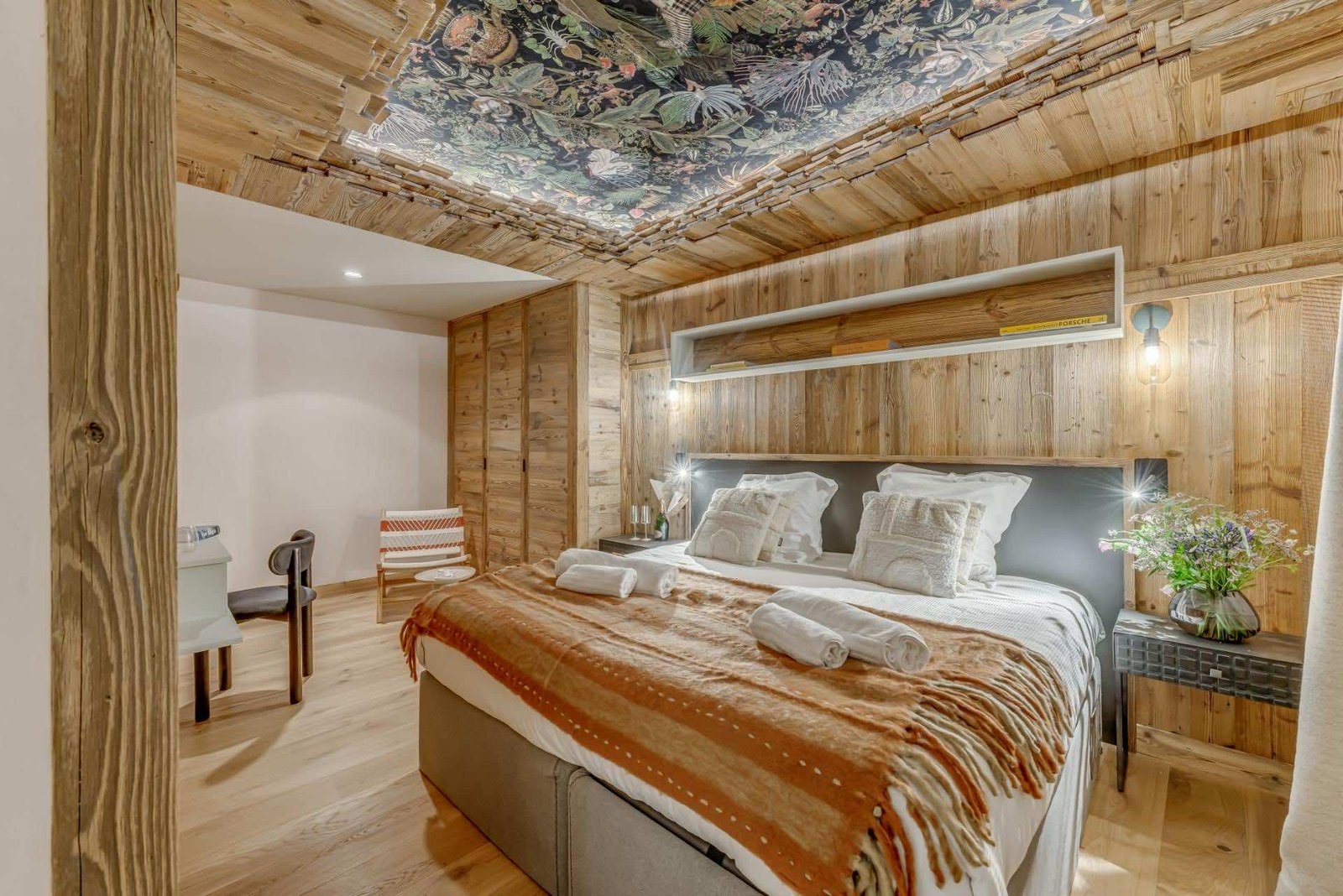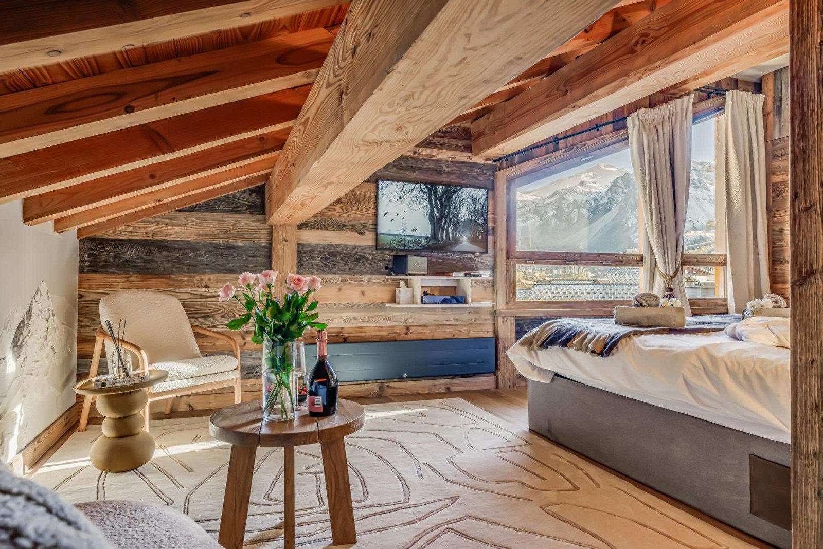 The chalet spans approximately 400 square metres across three beautifully designed floors and comfortably accommodates up to twelve guests in six elegant en-suite bedrooms. Natural materials, warm wood finishes and carefully selected textures create a calm and inviting environment throughout the property. Each bedroom has been designed as a private sanctuary, combining alpine style with modern comfort, and most offer access to a balcony or terrace with views of the surrounding mountains.