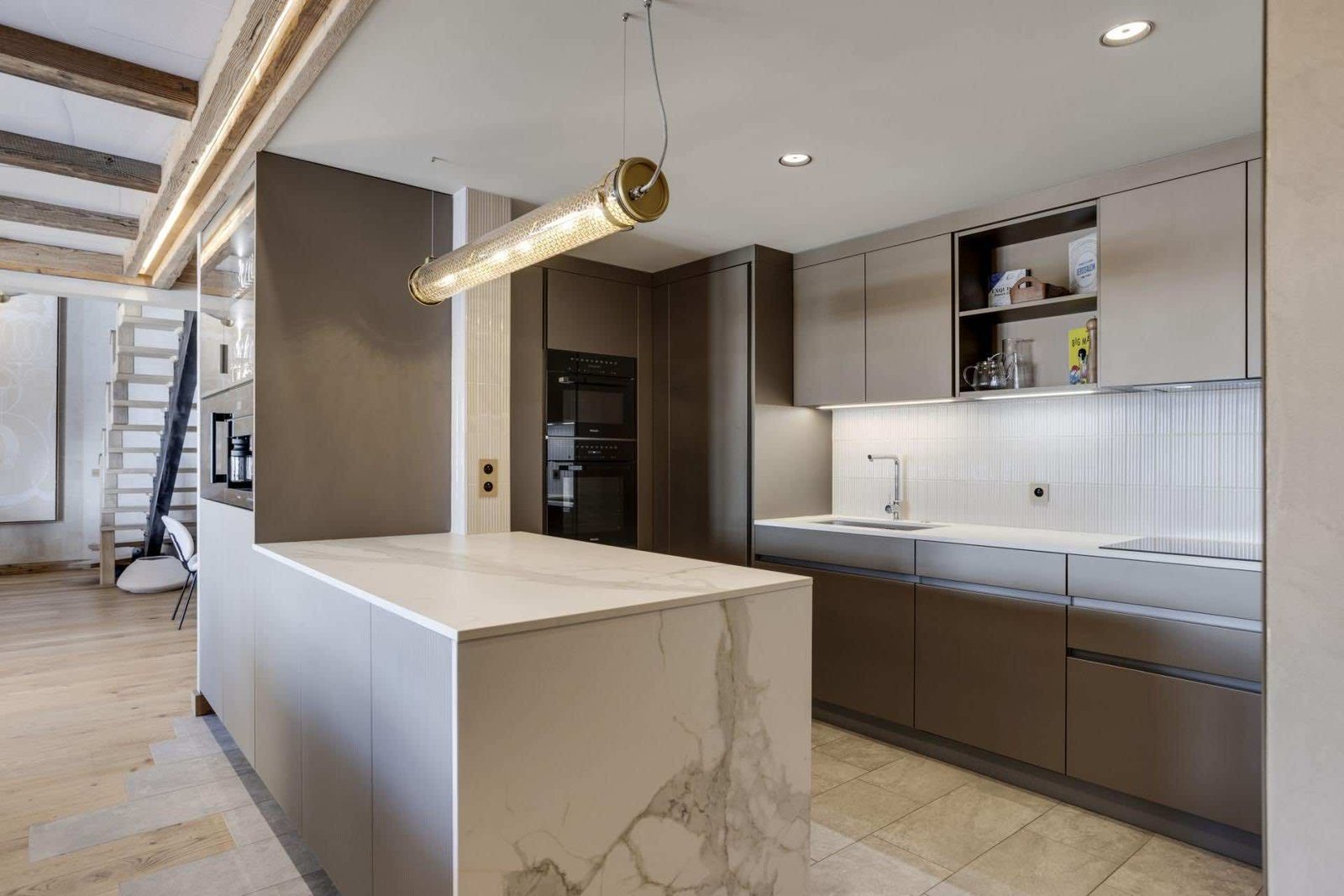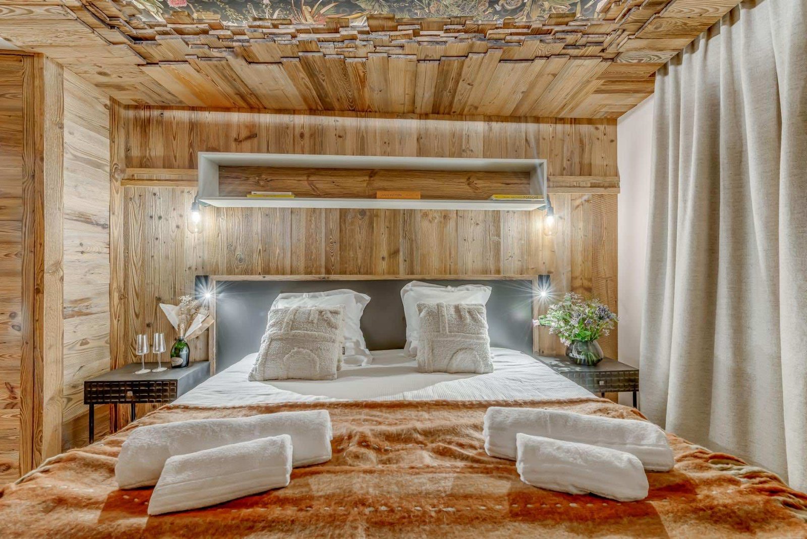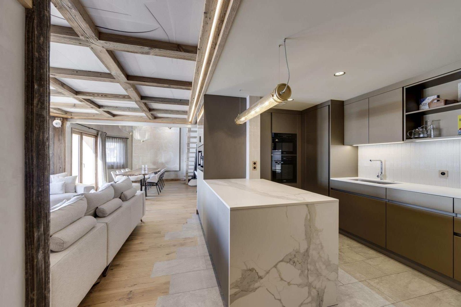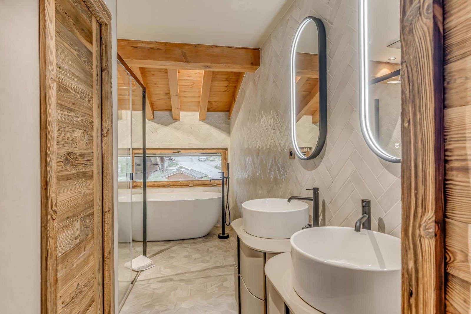 The chalet spans approximately 400 square metres across three beautifully designed floors and comfortably accommodates up to twelve guests in six elegant en-suite bedrooms. Natural materials, warm wood finishes and carefully selected textures create a calm and inviting environment throughout the property. Each bedroom has been designed as a private sanctuary, combining alpine style with modern comfort, and most offer access to a balcony or terrace with views of the surrounding mountains.