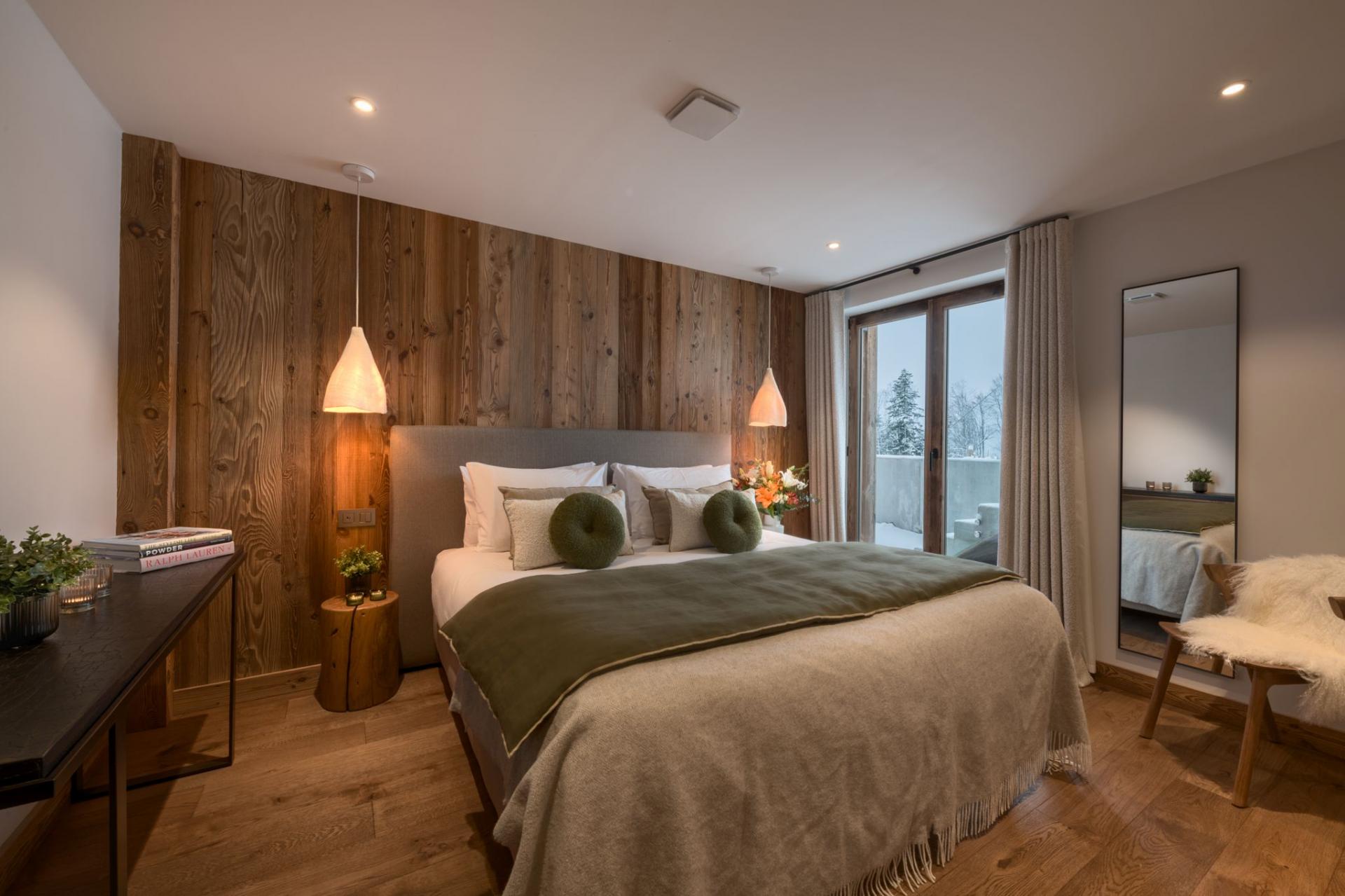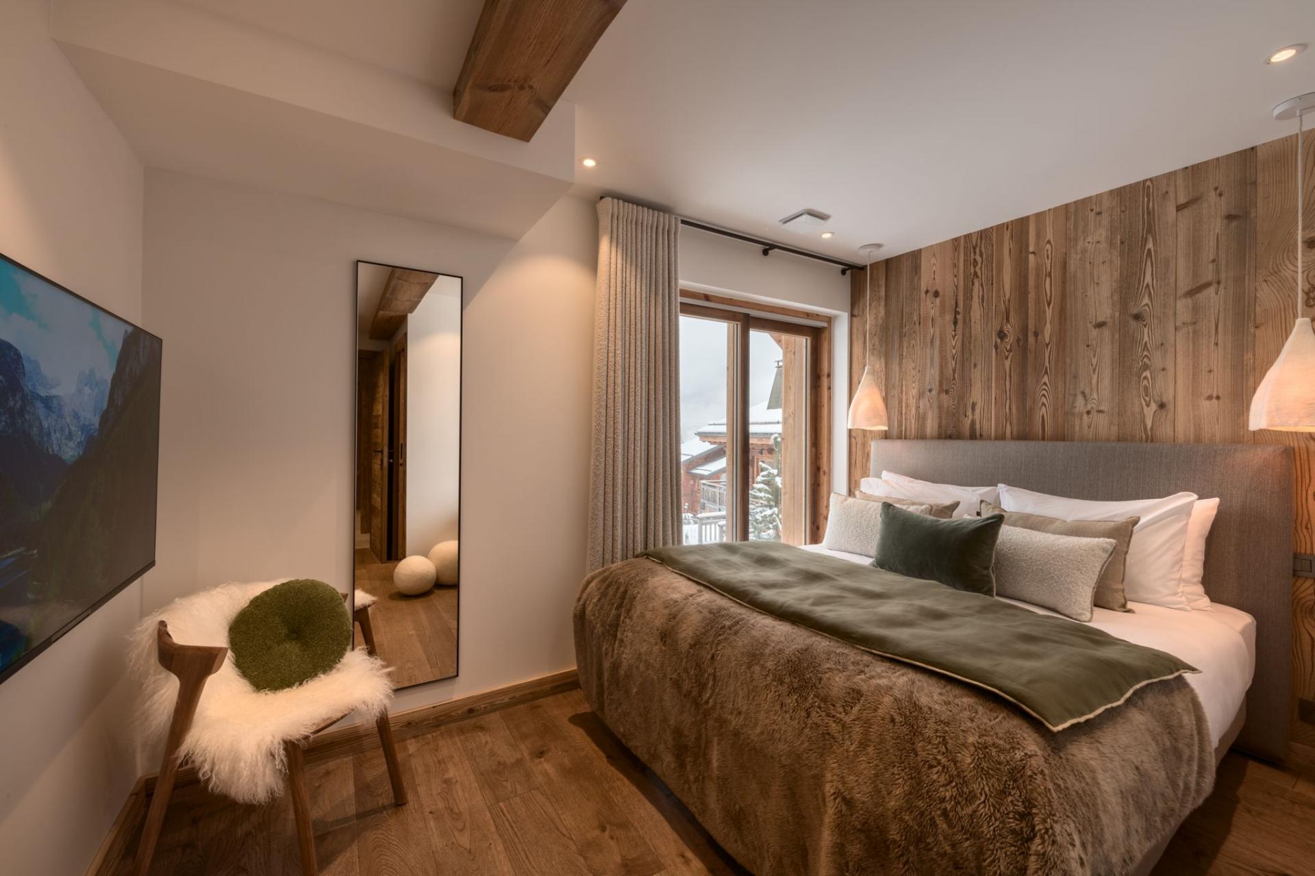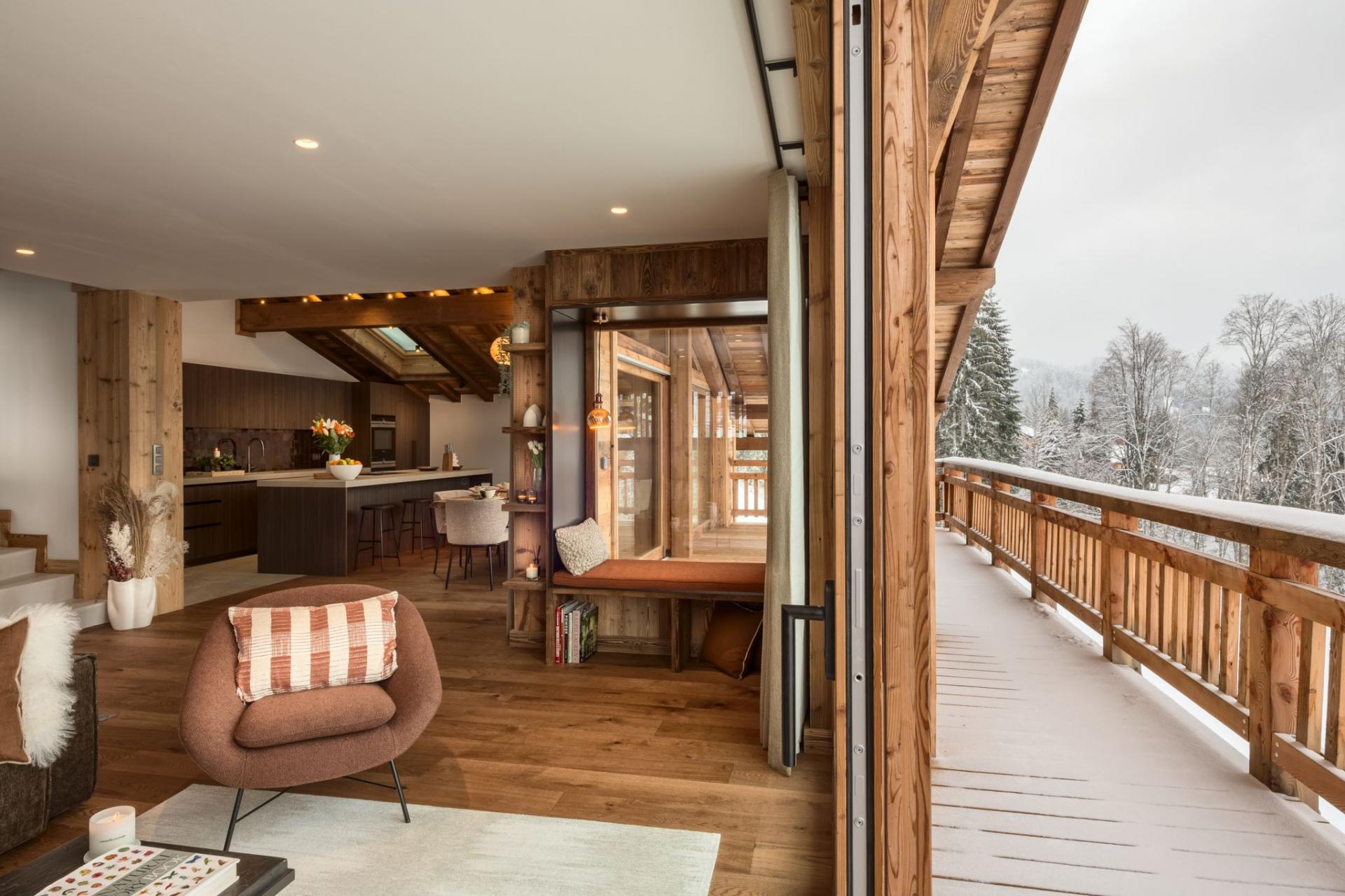 This beautifully designed chalet spans four levels and blends spacious, light-filled interiors with panoramic vistas over Mont Chéry. The open-plan living, dining and kitchen area features floor-to-ceiling windows and a cosy wood-burning stove, creating a perfect space for socialising after a day on the slopes. The contemporary kitchen and generous dining table comfortably accommodate large groups, with additional seating at the kitchen island.