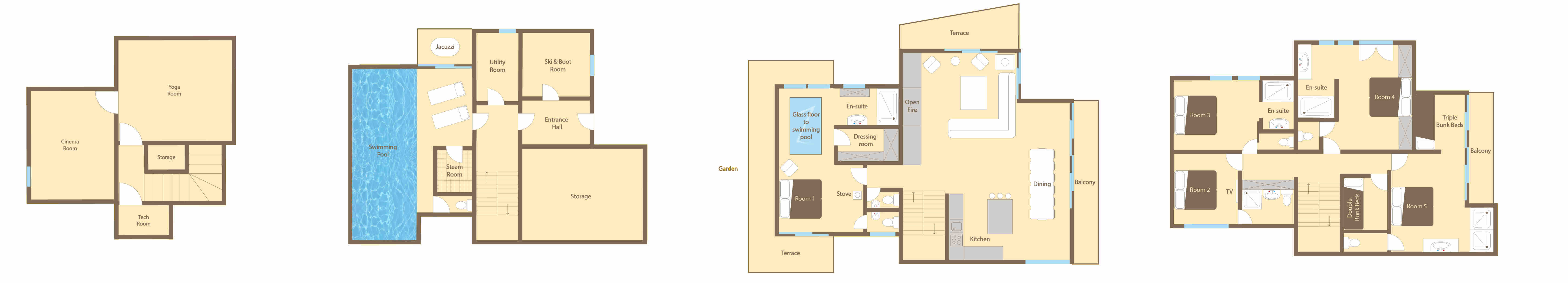 Bedrooms are individually styled with thoughtful touches, and one of the first-floor suites even enjoys a glass floor looking down into the pool area, a standout feature.