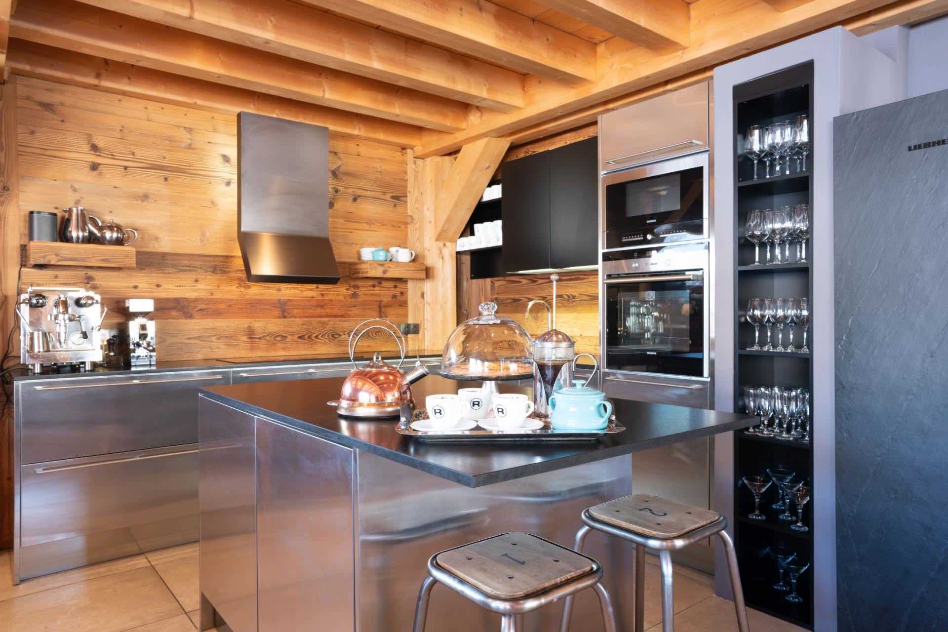 At the heart of the chalet is a spacious open-plan living and dining area, bathed in natural light from floor-to-ceiling patio doors and centred around a roaring open fire, perfect for relaxing after a day on the slopes. The fully equipped kitchen features a social island, ideal for informal gatherings.
