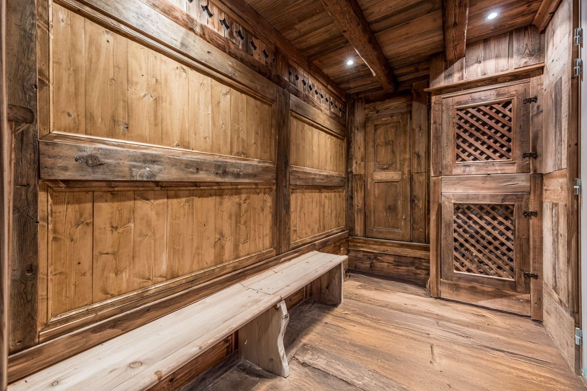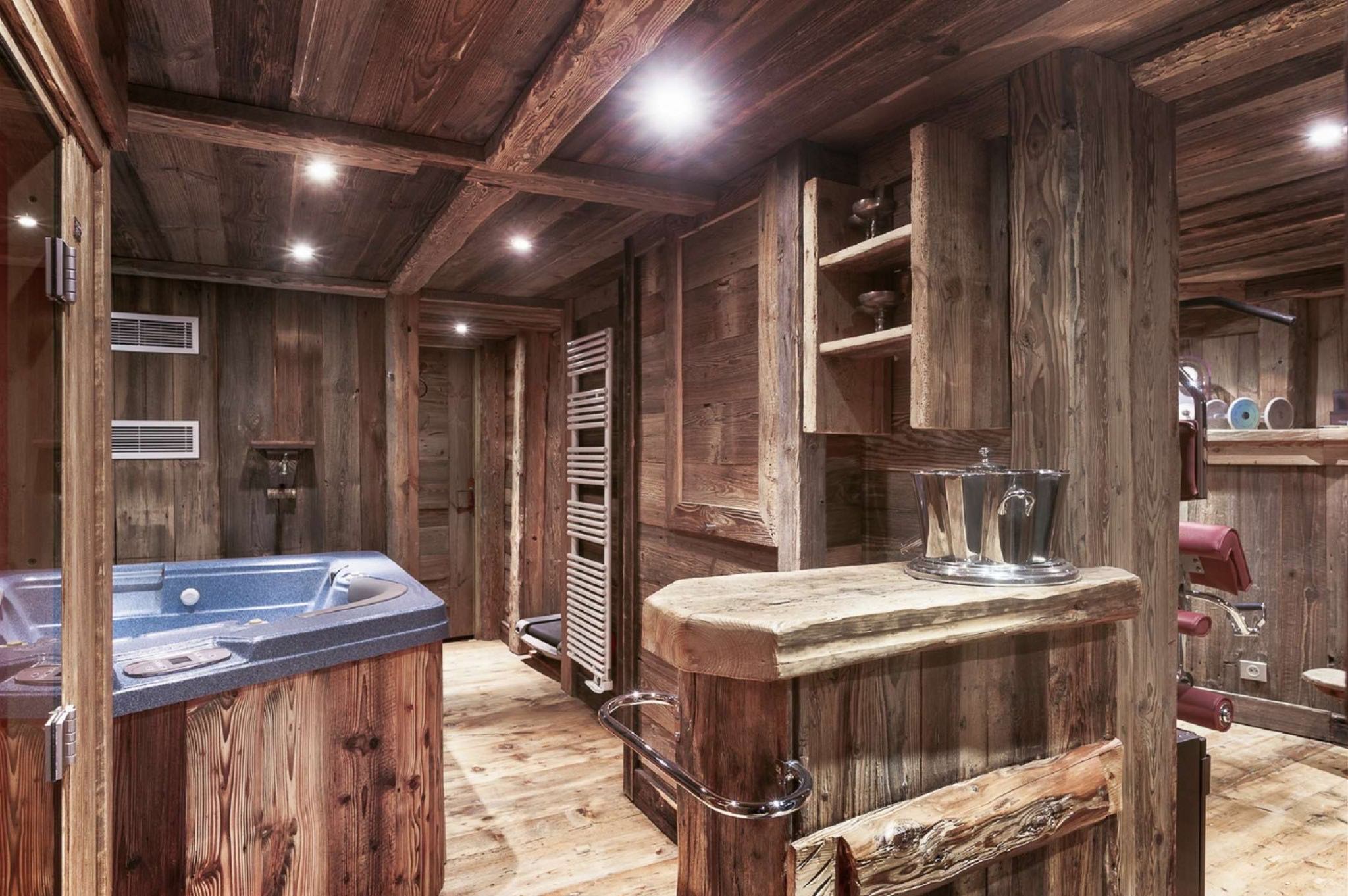 The chalet is arranged over several levels. On level -1, guests can enjoy a dedicated wellness area featuring a sauna, jacuzzi, and gym, perfect for relaxing after a day on the slopes.