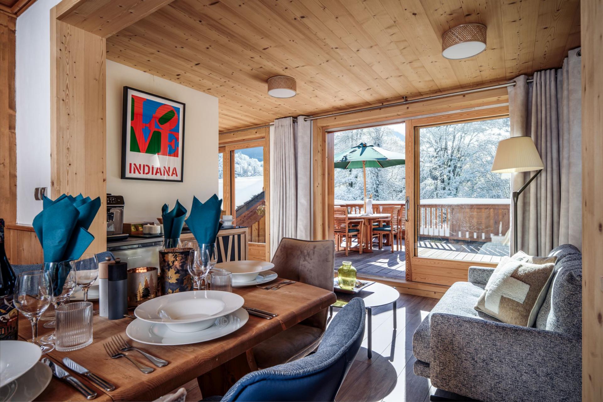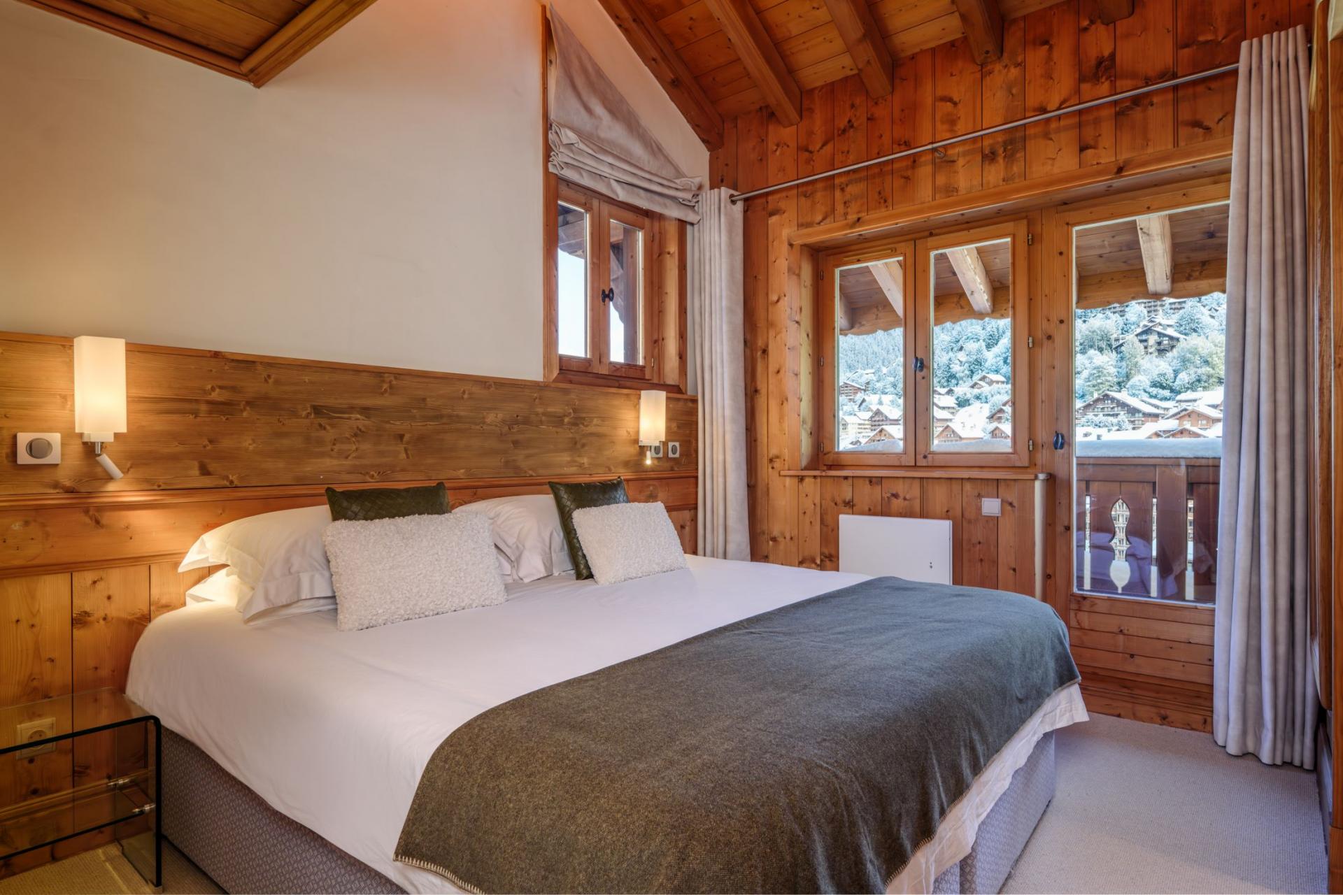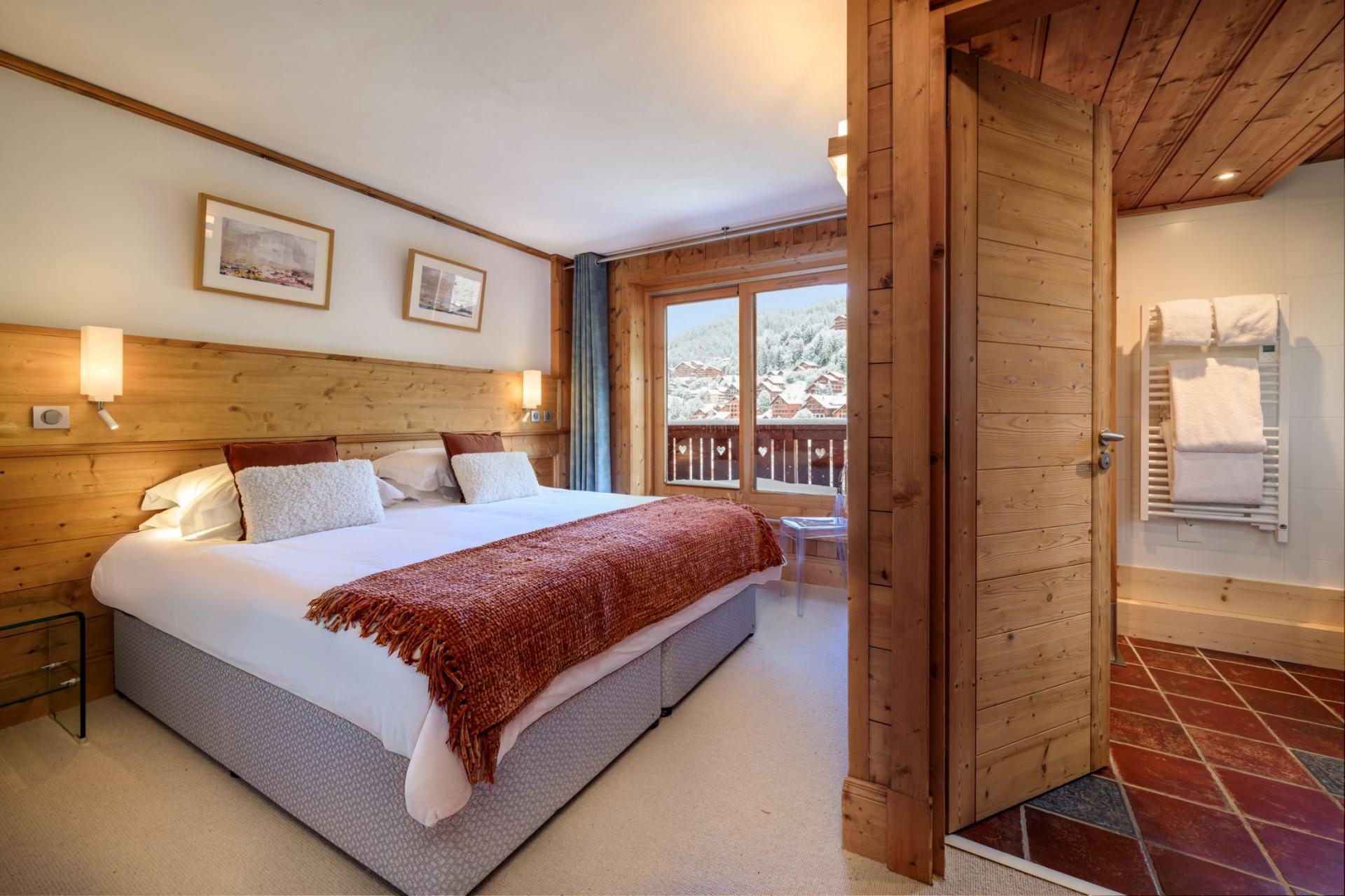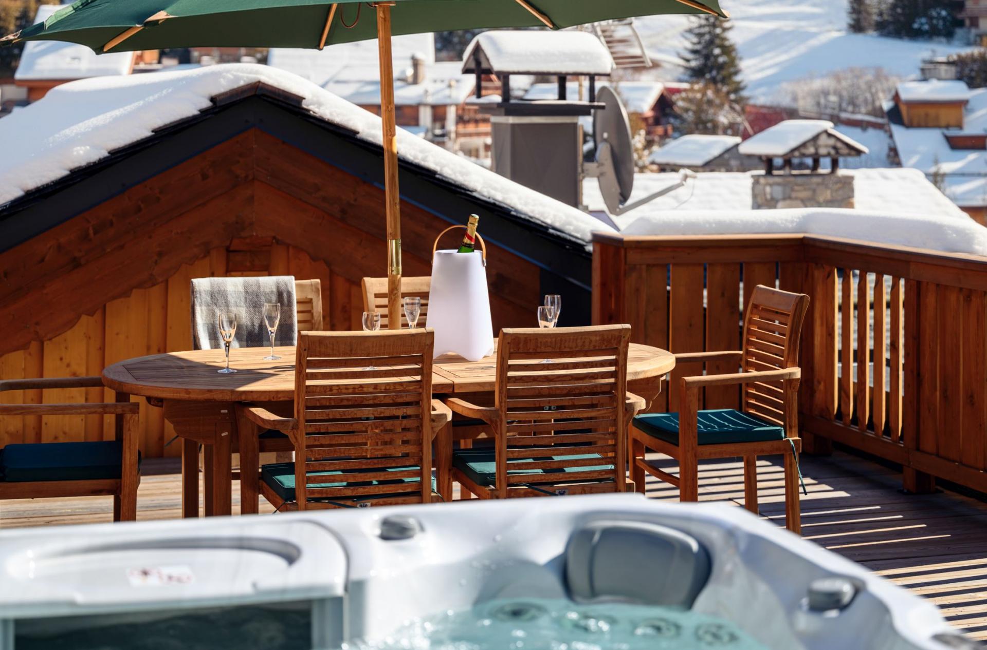 The main living area, located on the second floor, is a warm and inviting space bathed in natural light from expansive windows. A plush wraparound sofa encircles the flickering stone fireplace, creating the perfect spot to unwind after a day on the slopes. The room’s wooden interiors showcase traditional alpine craftsmanship, enhancing the chalet’s cosy and authentic feel. Adjacent to the lounge is a spacious dining area — a welcoming setting for sharing delicious meals and memorable moments with loved ones. Guests can also retreat to the snug and bar area for afternoon tea or a lively après-ski drink. Nearby, the well-equipped kitchen ensures every meal and indulgent treat is prepared to perfection. From the main living area, step out onto a large balcony featuring an outdoor hot tub — the ultimate place to relax and take in Méribel’s stunning mountain vistas.
