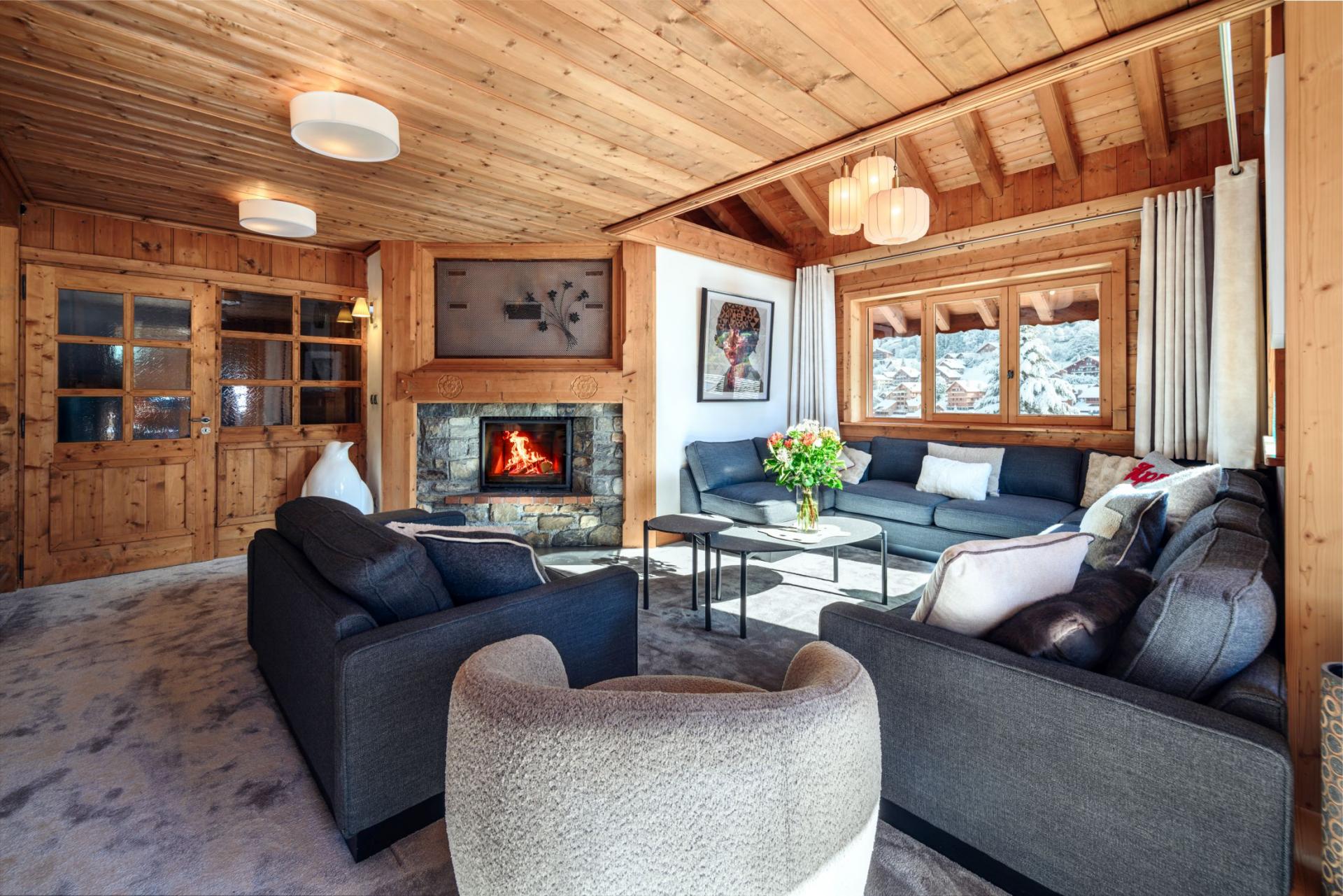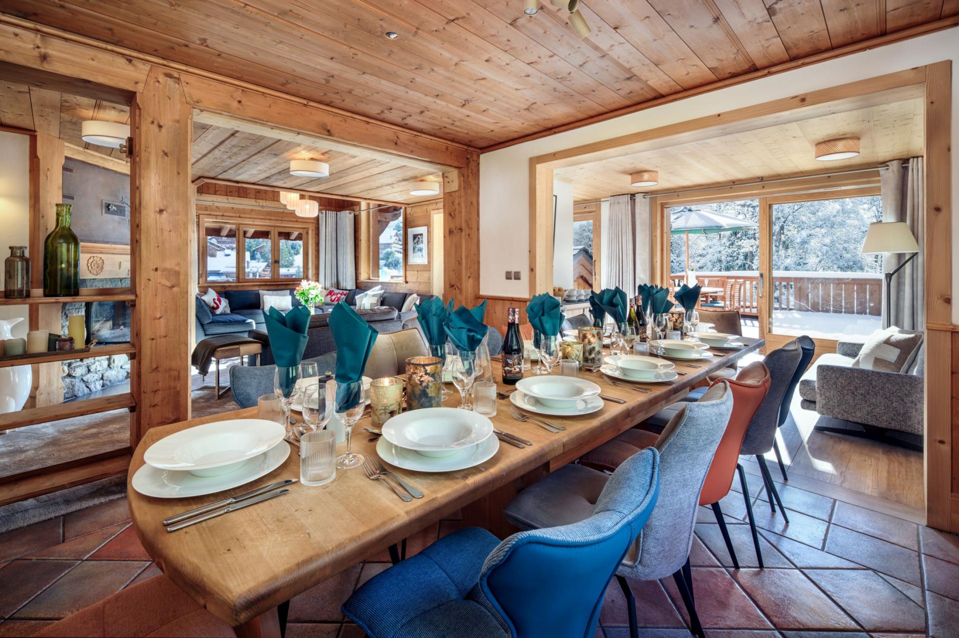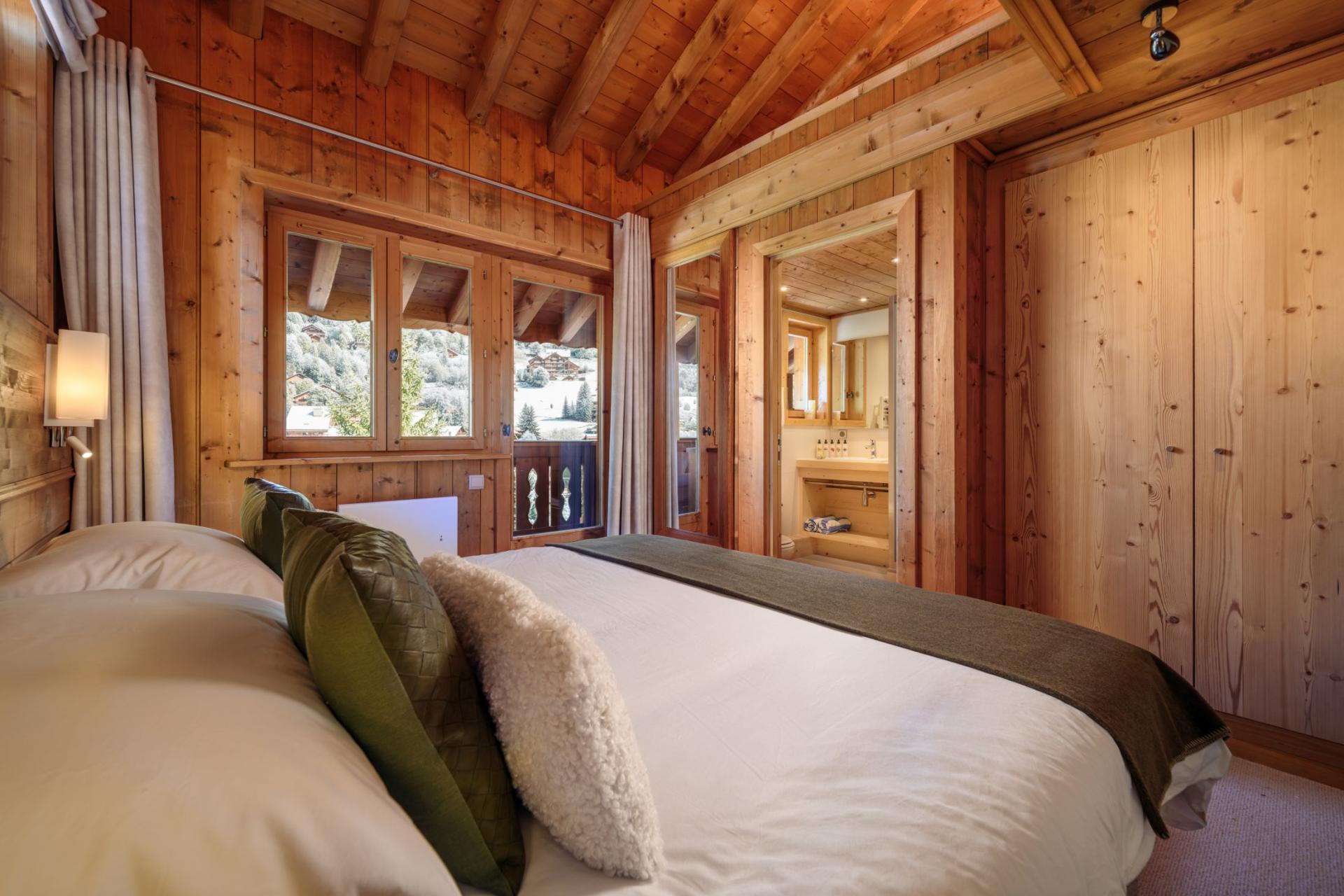 The main living area, located on the second floor, is a warm and inviting space bathed in natural light from expansive windows. A plush wraparound sofa encircles the flickering stone fireplace, creating the perfect spot to unwind after a day on the slopes. The room’s wooden interiors showcase traditional alpine craftsmanship, enhancing the chalet’s cosy and authentic feel. Adjacent to the lounge is a spacious dining area — a welcoming setting for sharing delicious meals and memorable moments with loved ones. Guests can also retreat to the snug and bar area for afternoon tea or a lively après-ski drink. Nearby, the well-equipped kitchen ensures every meal and indulgent treat is prepared to perfection. From the main living area, step out onto a large balcony featuring an outdoor hot tub — the ultimate place to relax and take in Méribel’s stunning mountain vistas.