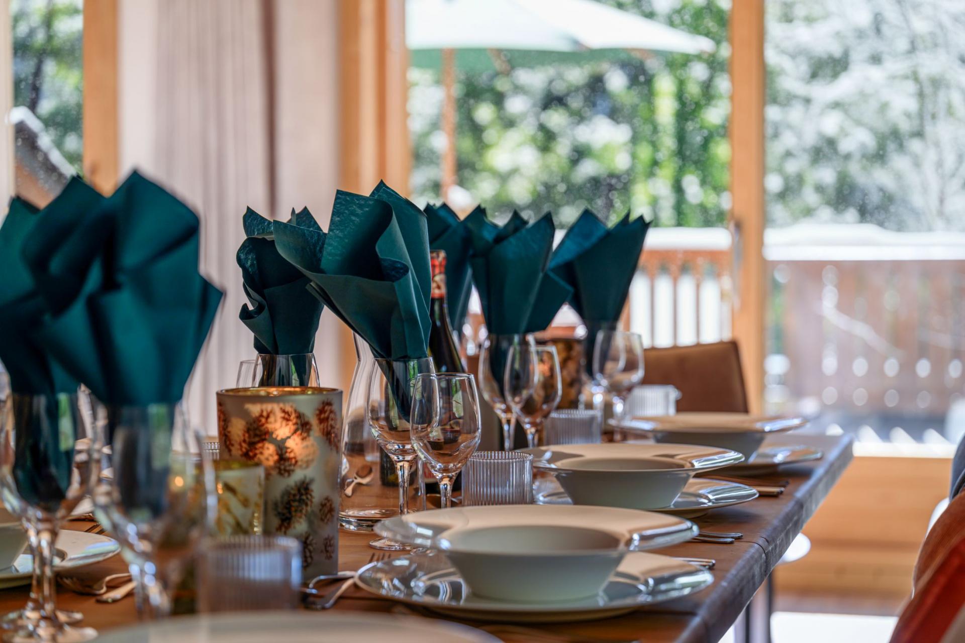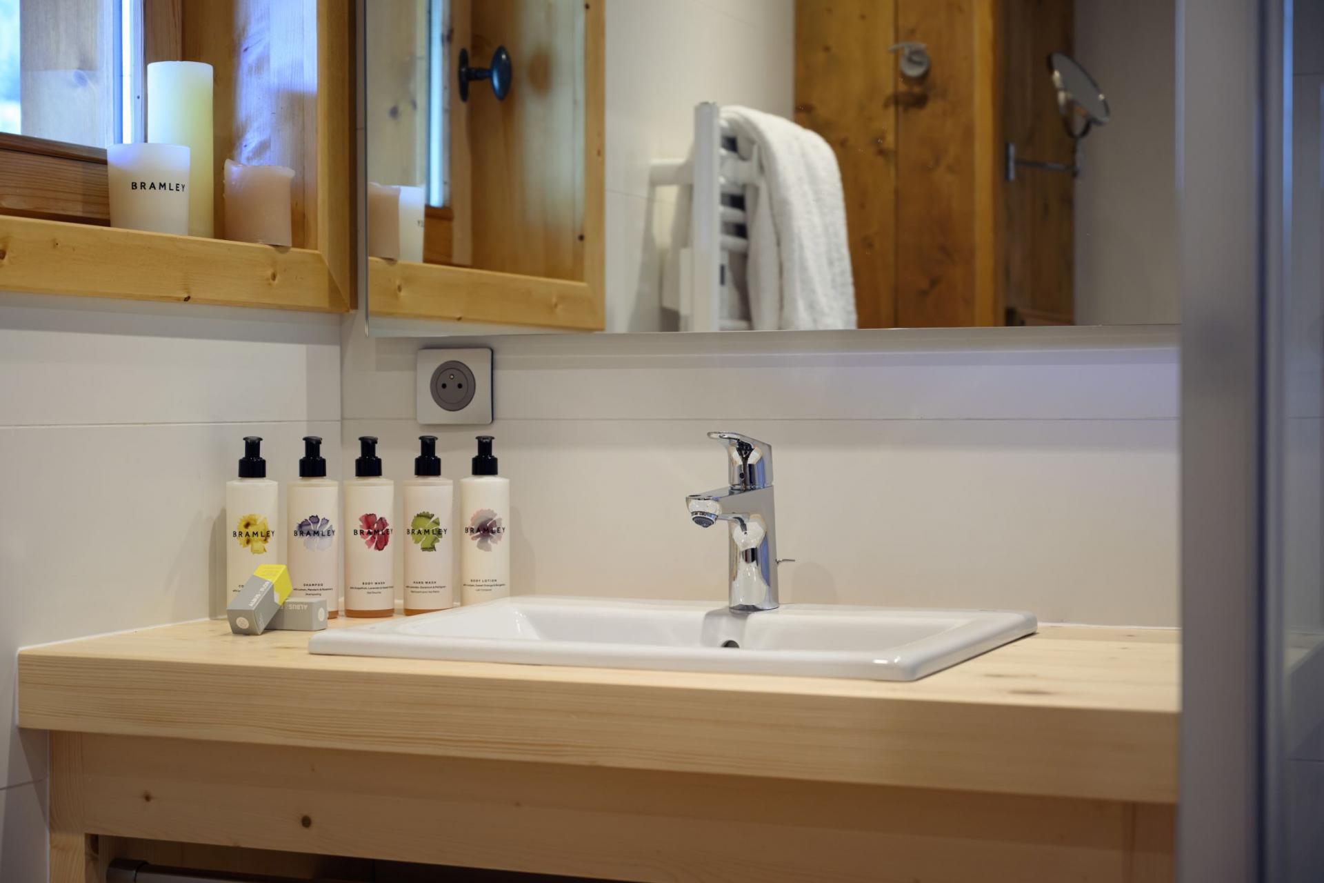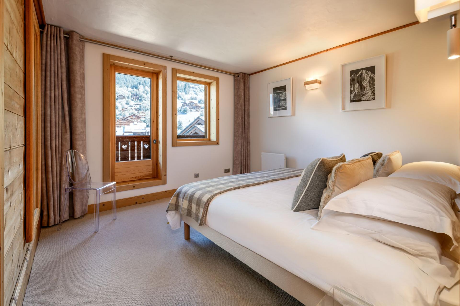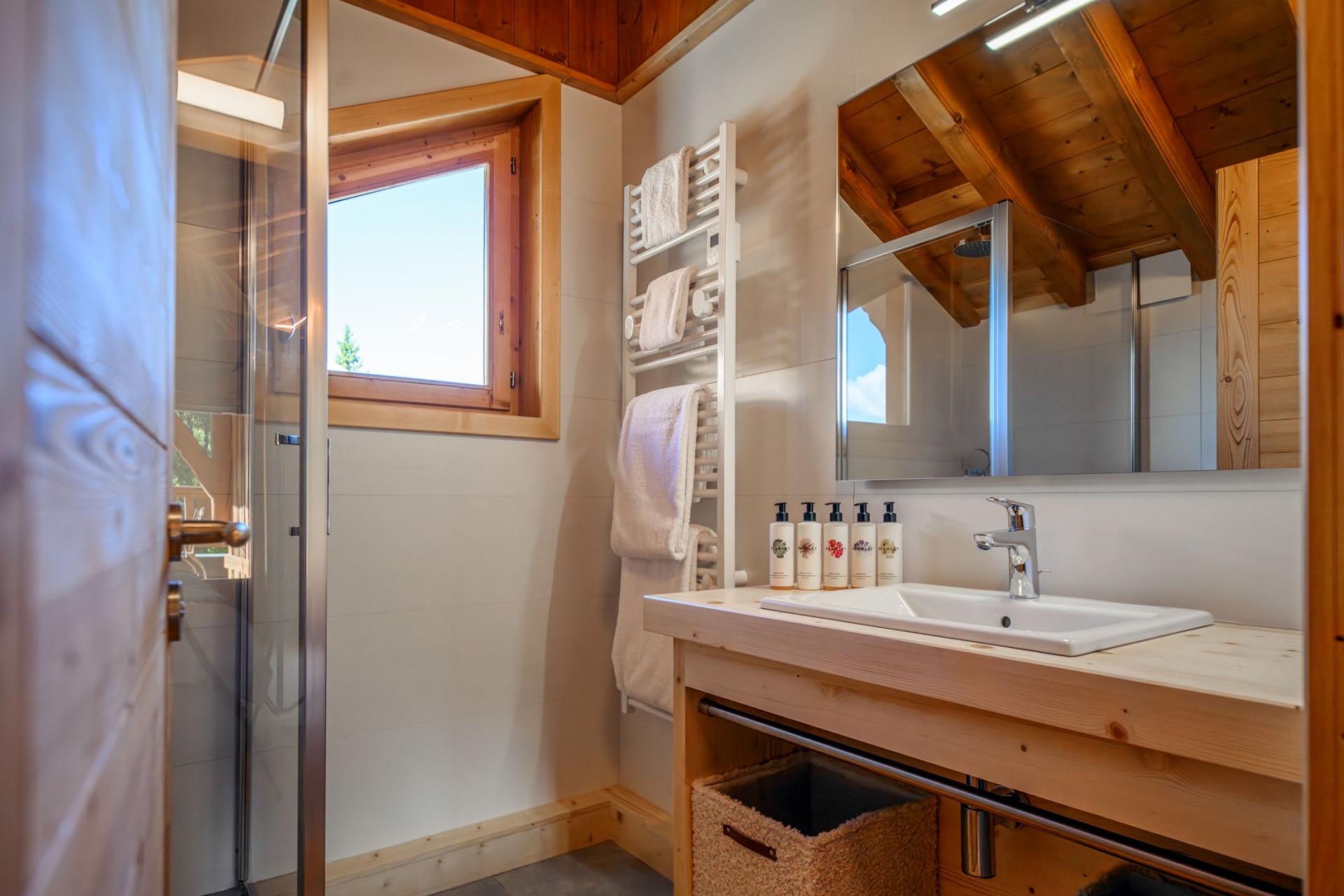 The main living area, located on the second floor, is a warm and inviting space bathed in natural light from expansive windows. A plush wraparound sofa encircles the flickering stone fireplace, creating the perfect spot to unwind after a day on the slopes. The room’s wooden interiors showcase traditional alpine craftsmanship, enhancing the chalet’s cosy and authentic feel. Adjacent to the lounge is a spacious dining area — a welcoming setting for sharing delicious meals and memorable moments with loved ones. Guests can also retreat to the snug and bar area for afternoon tea or a lively après-ski drink. Nearby, the well-equipped kitchen ensures every meal and indulgent treat is prepared to perfection. From the main living area, step out onto a large balcony featuring an outdoor hot tub — the ultimate place to relax and take in Méribel’s stunning mountain vistas.