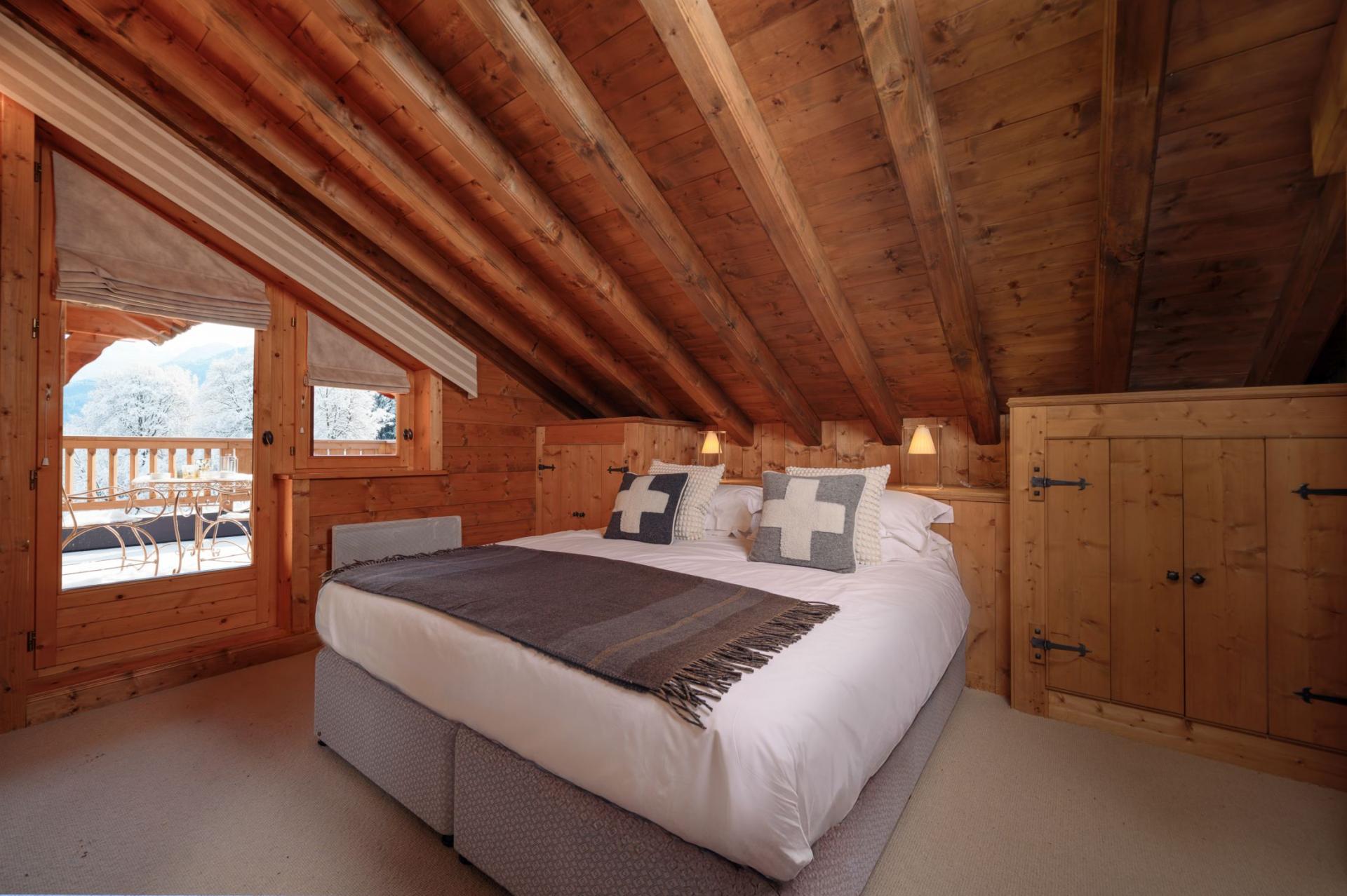 Indiana Lodge offers six spacious double or twin bedrooms, sleeping up to 12 guests across its top three floors. The reclaimed wood interiors and traditional alpine décor create a serene, restful atmosphere, while five bedrooms feature en-suite bathrooms for added comfort and privacy. The sixth bedroom has access to a separate shower room shared with the sauna. Most rooms also benefit from a private or shared balcony, providing tranquil views and fresh mountain air.