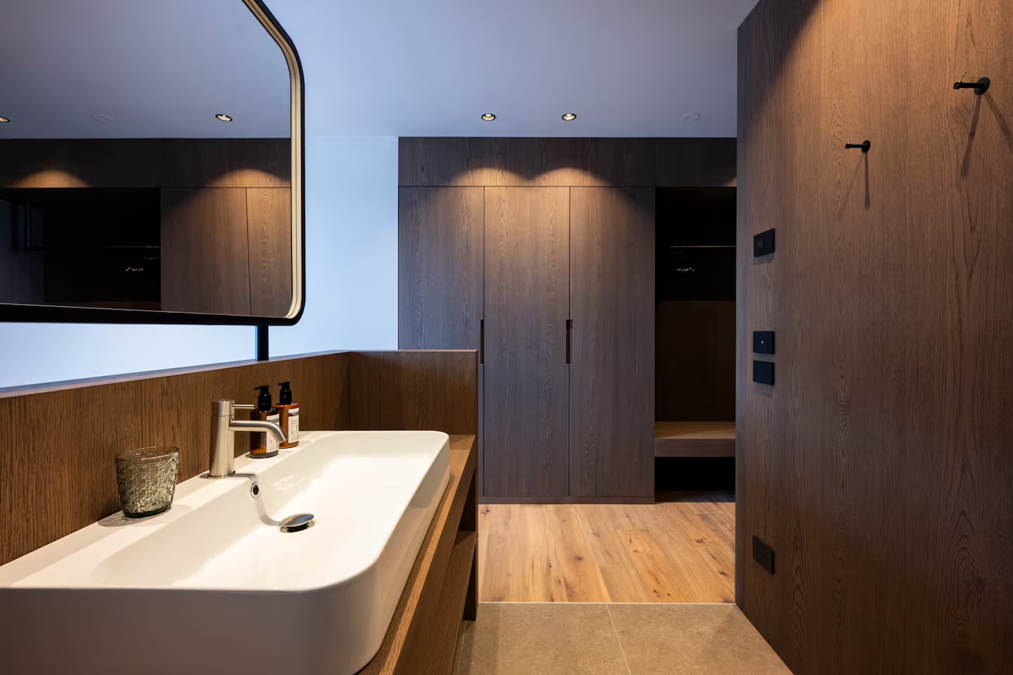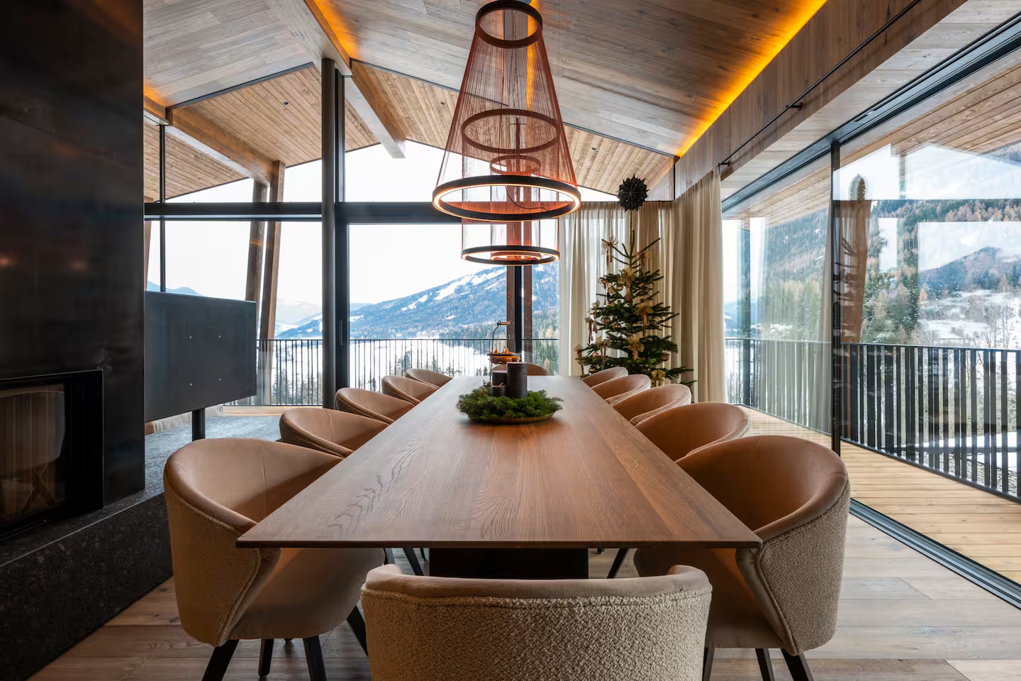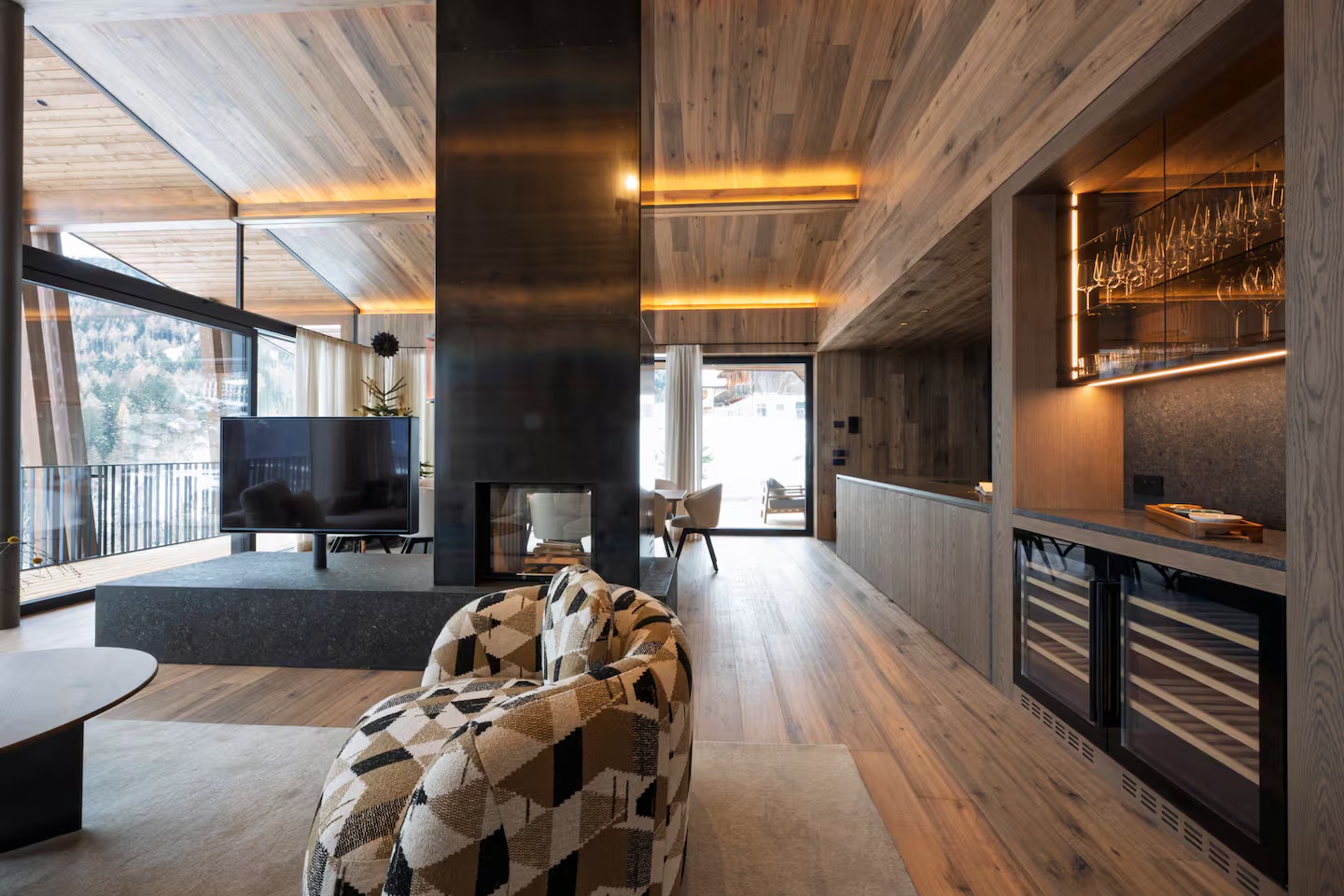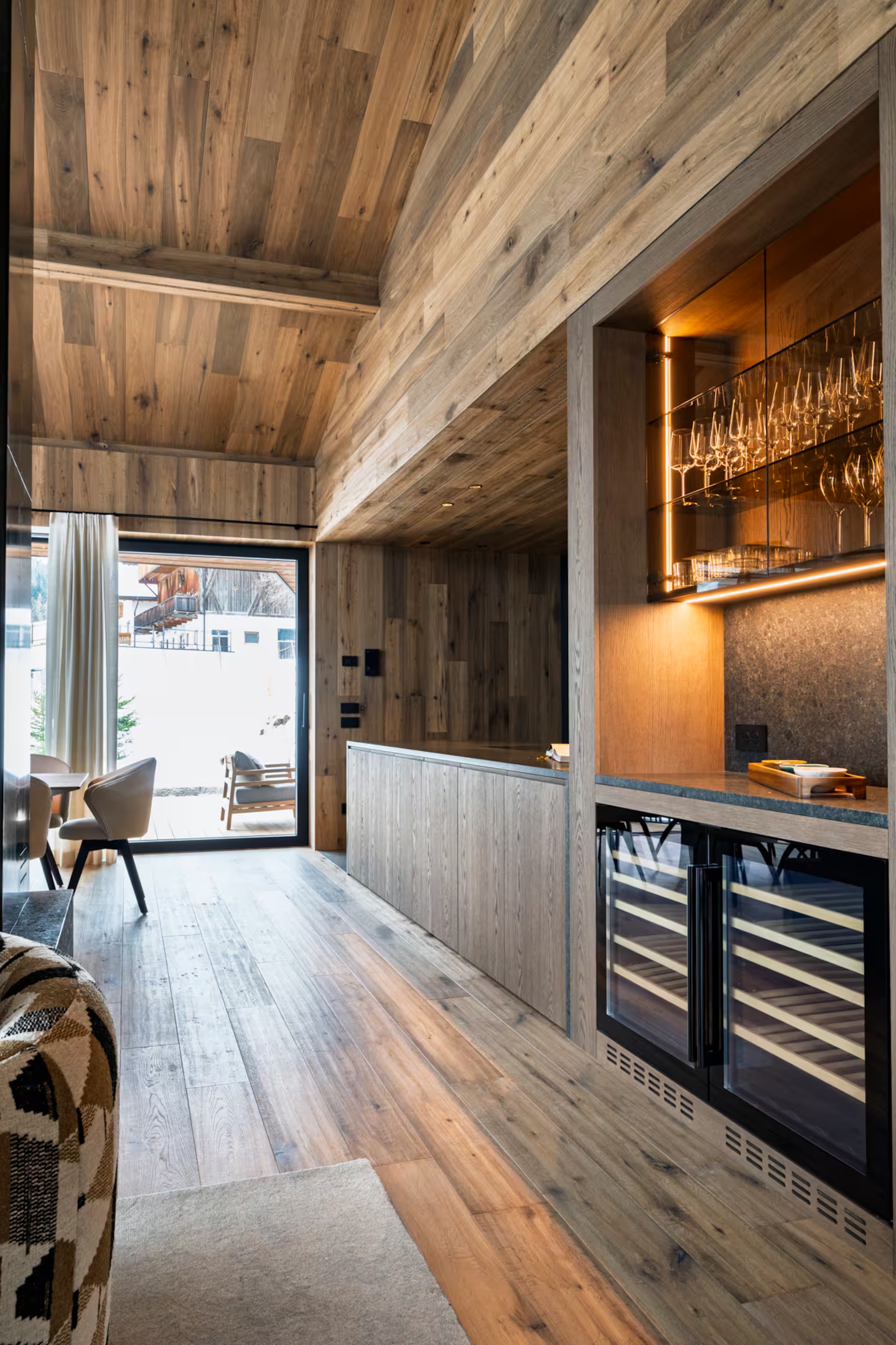 On the upper floor, the entrance opens into a light-filled living and dining area with vaulted ceilings, panoramic windows, and a wood-burning fireplace that creates a cozy alpine atmosphere. The modern open kitchen is fully equipped with high-end appliances and two chilled wine cabinets, while a large dining table invites guests to share meals together. From here, both terraces can be reached: the eastern terrace is perfect for breakfast in the morning sun or yoga with a view, while the southern terrace captures the evening light and features an outdoor kitchen with gas grill, ideal for dining outdoors. Fresh farm products such as eggs, milk, and butter are available daily from a nearby farm. Also on this level are a heated ski room with boot dryer, bicycle storage, and an e-bike charging station.