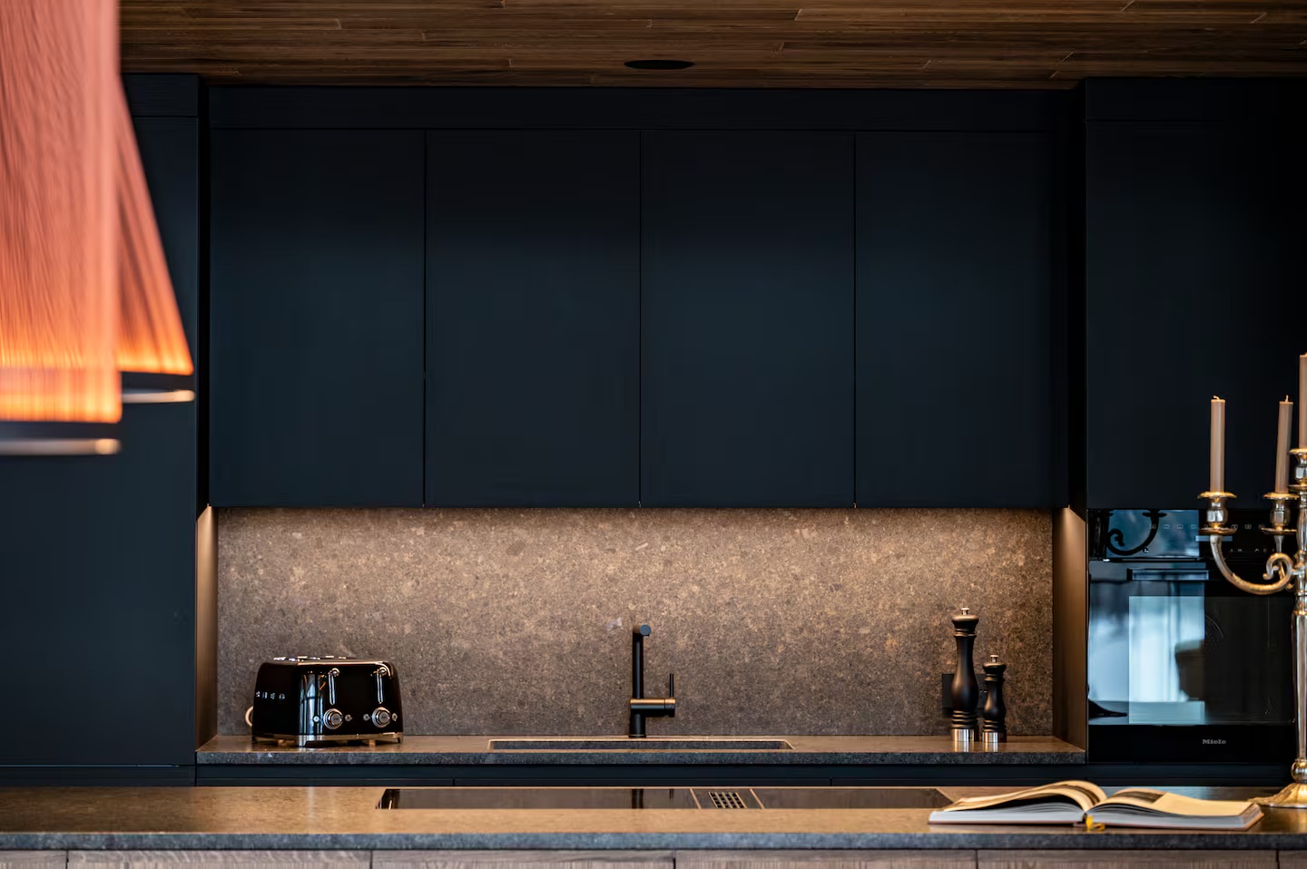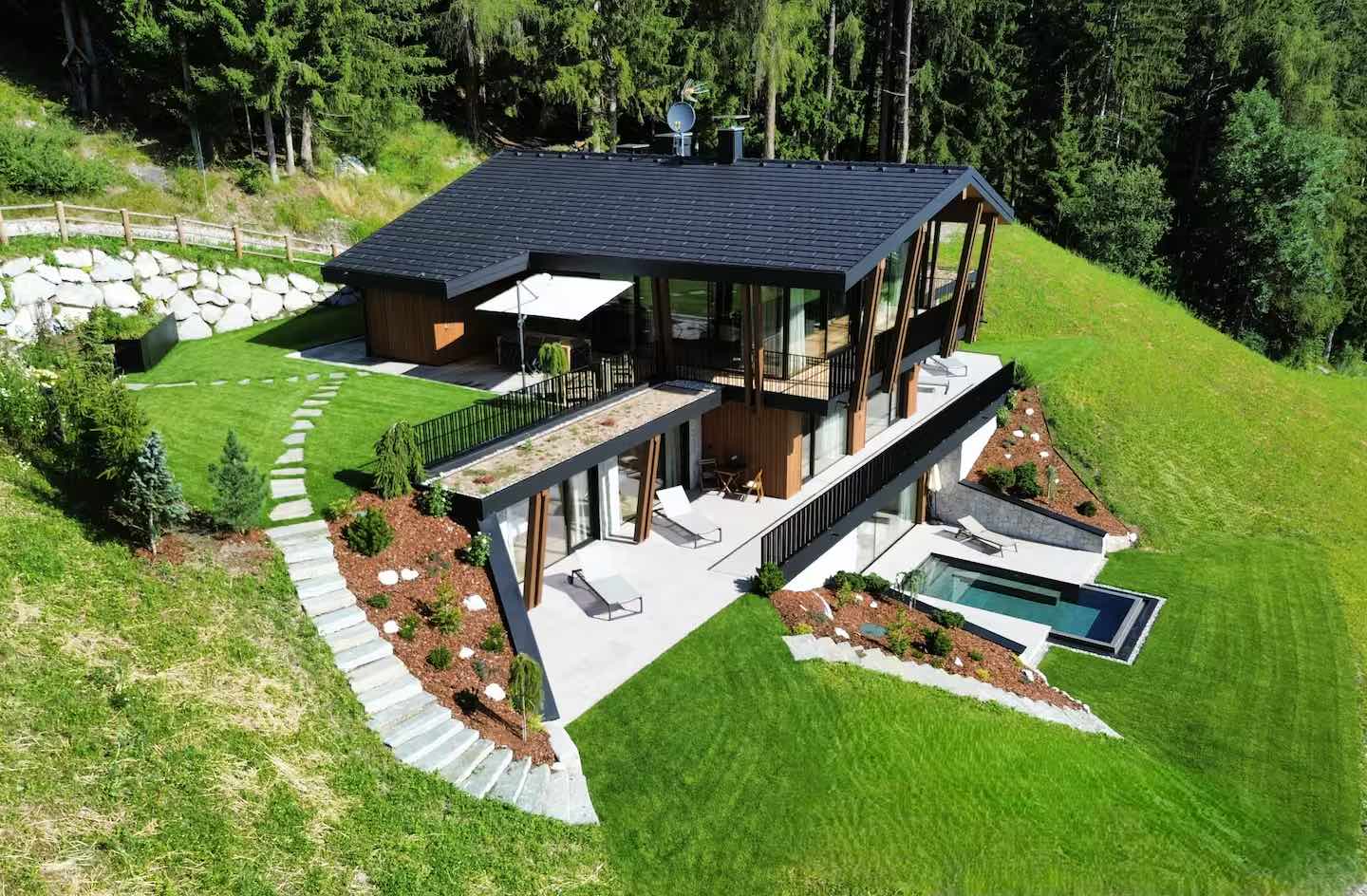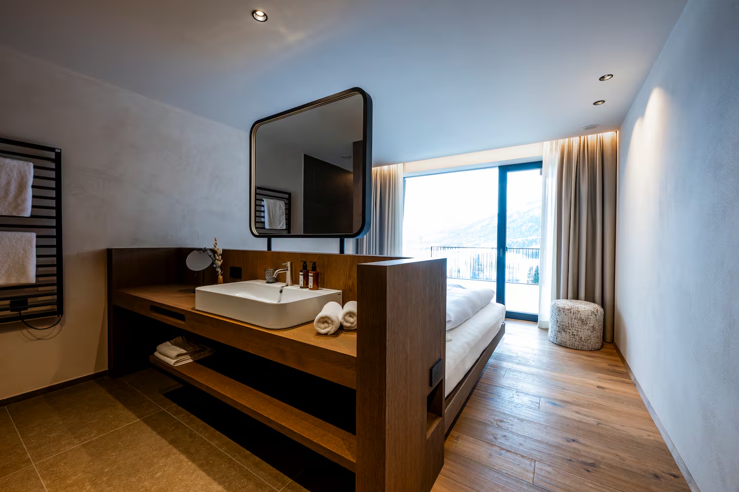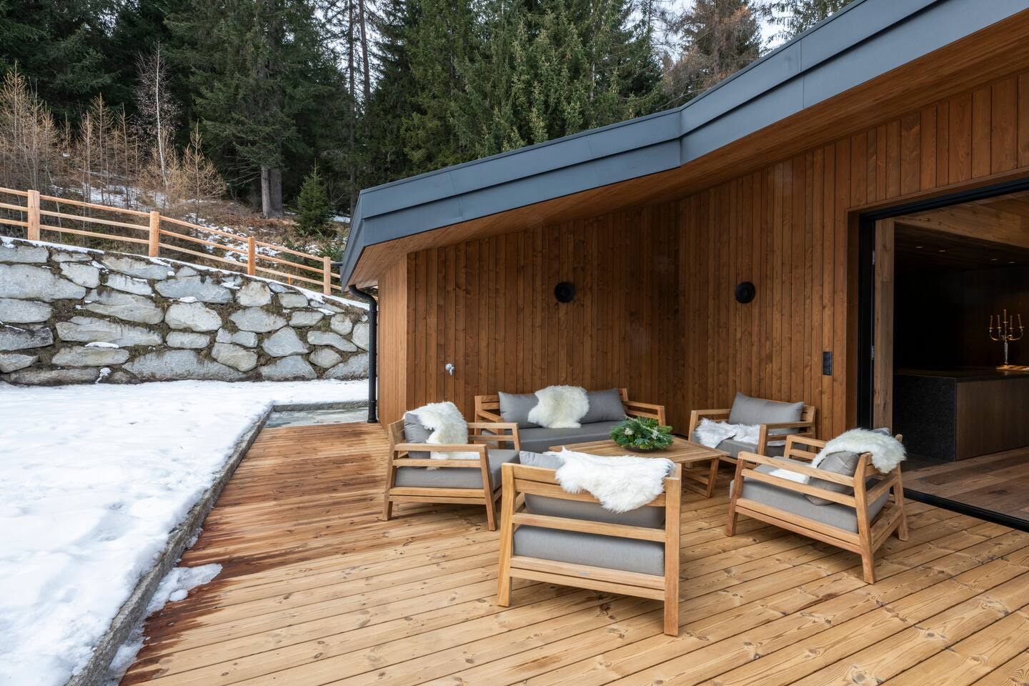 On the upper floor, the entrance opens into a light-filled living and dining area with vaulted ceilings, panoramic windows, and a wood-burning fireplace that creates a cozy alpine atmosphere. The modern open kitchen is fully equipped with high-end appliances and two chilled wine cabinets, while a large dining table invites guests to share meals together. From here, both terraces can be reached: the eastern terrace is perfect for breakfast in the morning sun or yoga with a view, while the southern terrace captures the evening light and features an outdoor kitchen with gas grill, ideal for dining outdoors. Fresh farm products such as eggs, milk, and butter are available daily from a nearby farm. Also on this level are a heated ski room with boot dryer, bicycle storage, and an e-bike charging station.