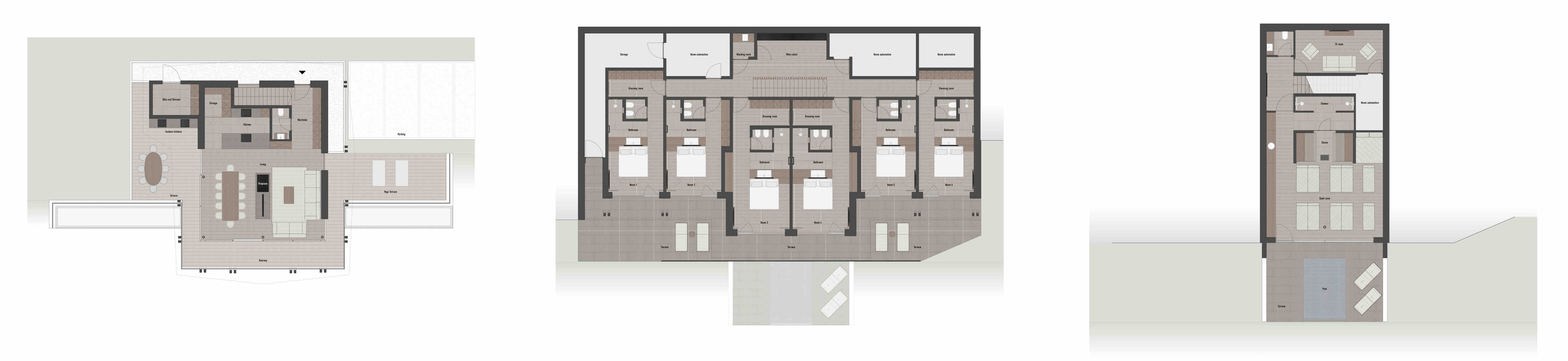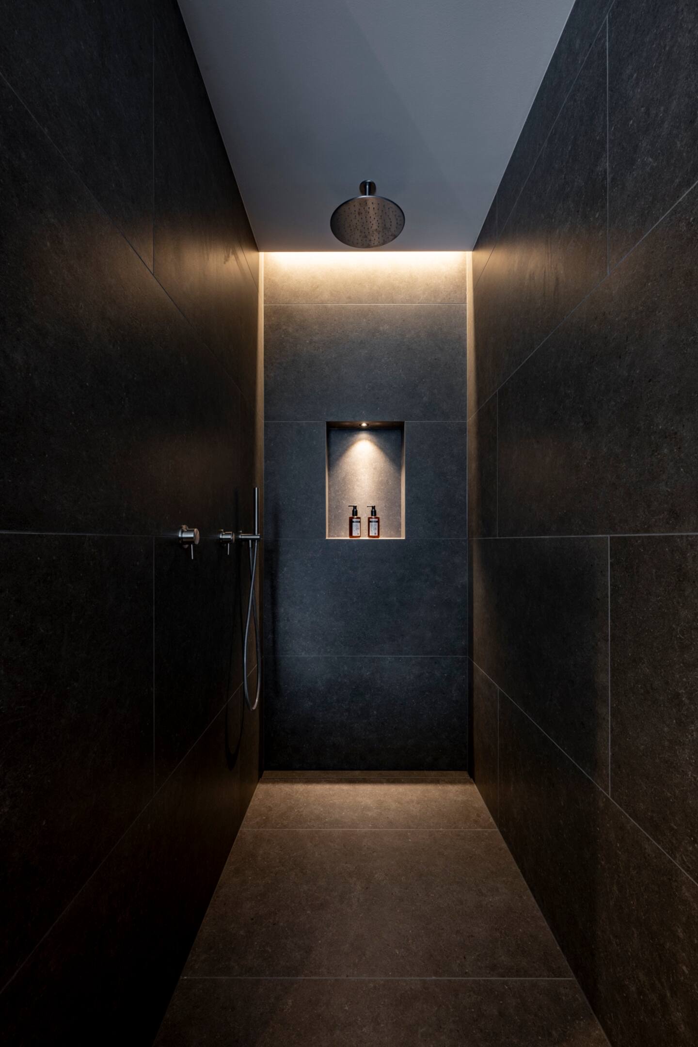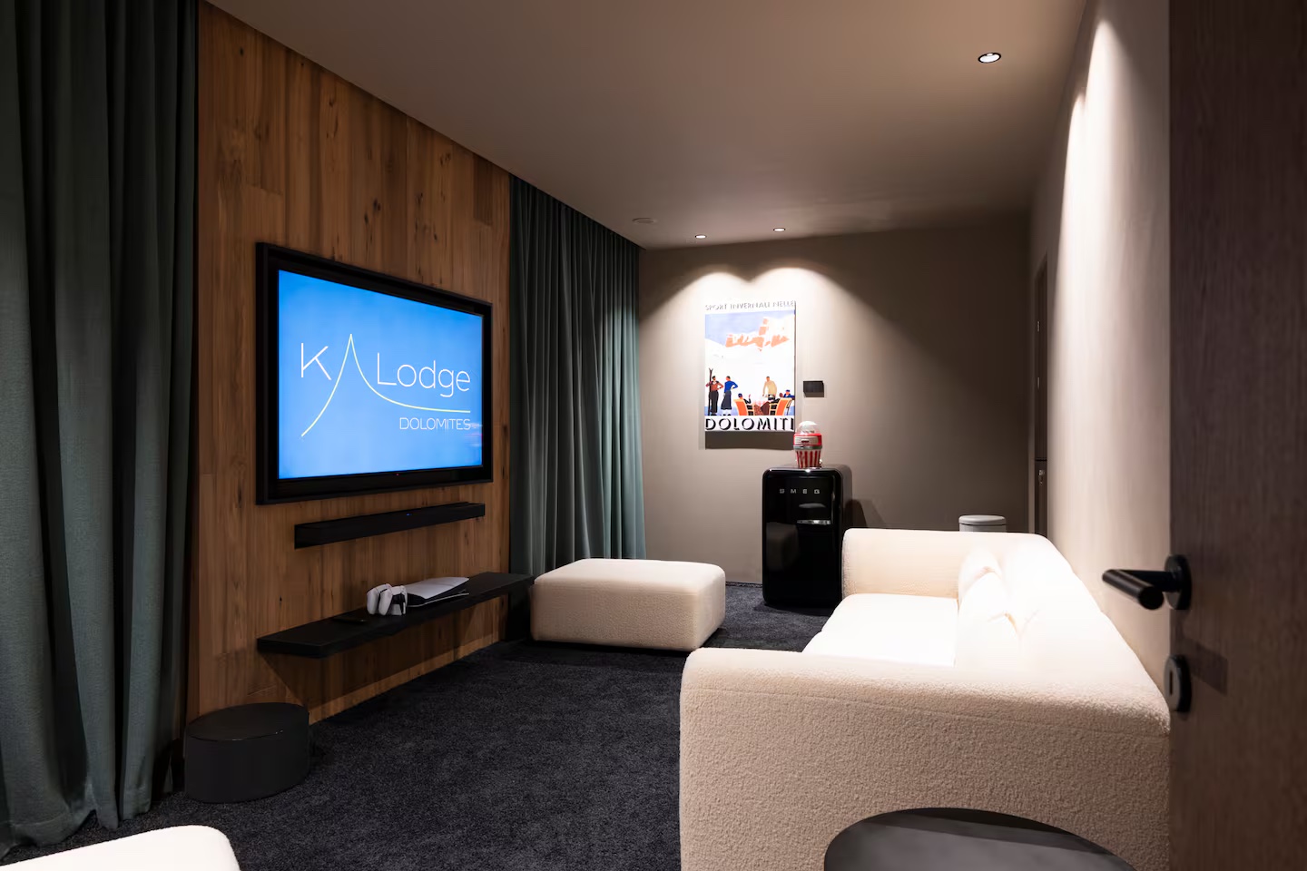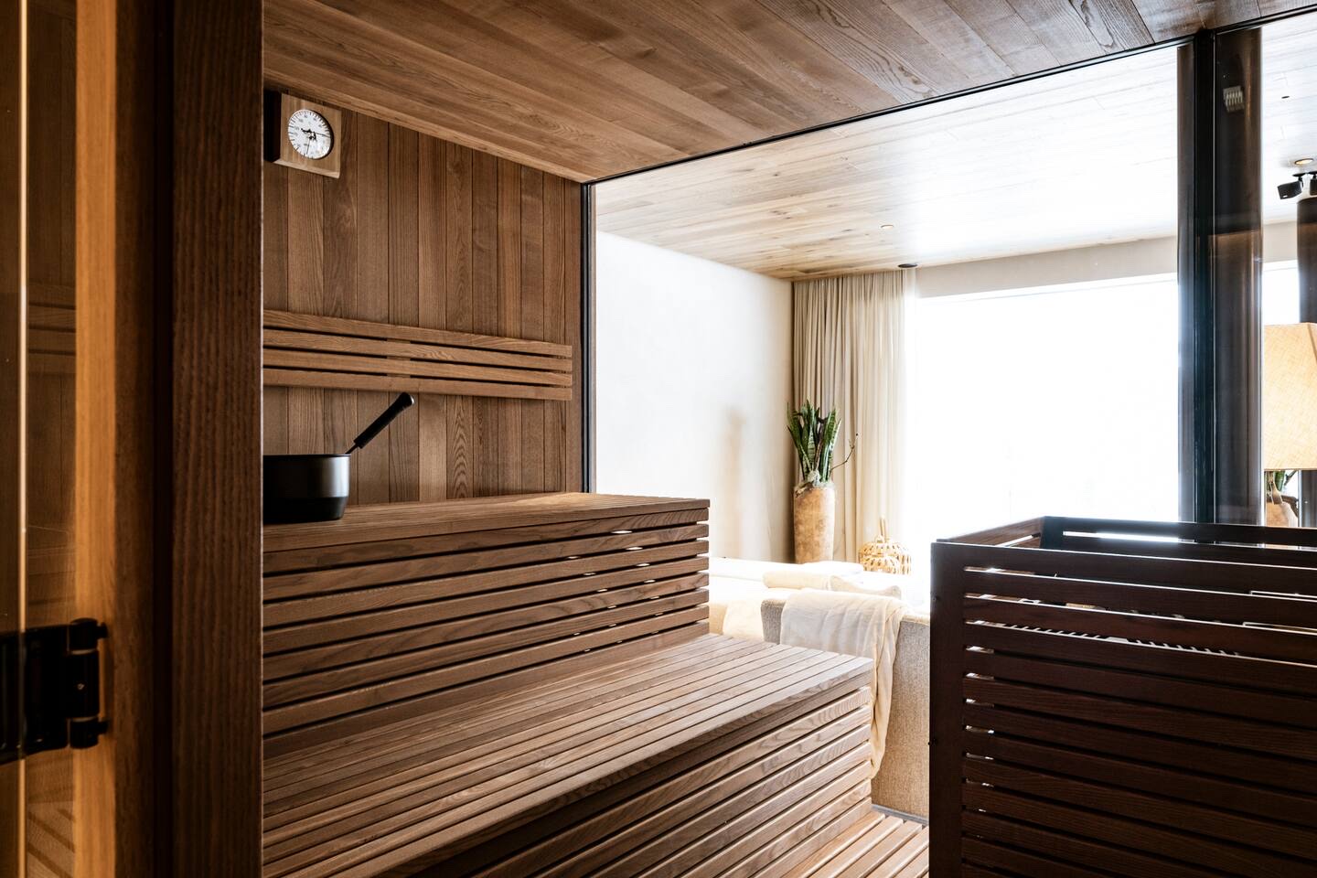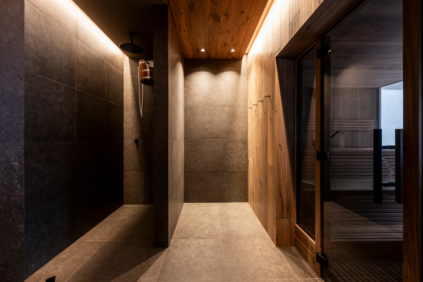 On the lower floor, the 90 m² wellness area invites guests to unwind. The Finnish and bio sauna, the spacious relaxation lounge, and the infinity jacuzzi heated to 36–38°C all open onto the garden, creating a serene setting for rejuvenation. Two experience showers and a vitality bar provide refreshing contrast. For entertainment, the in-house home cinema with gaming consoles ensures variety and fun.