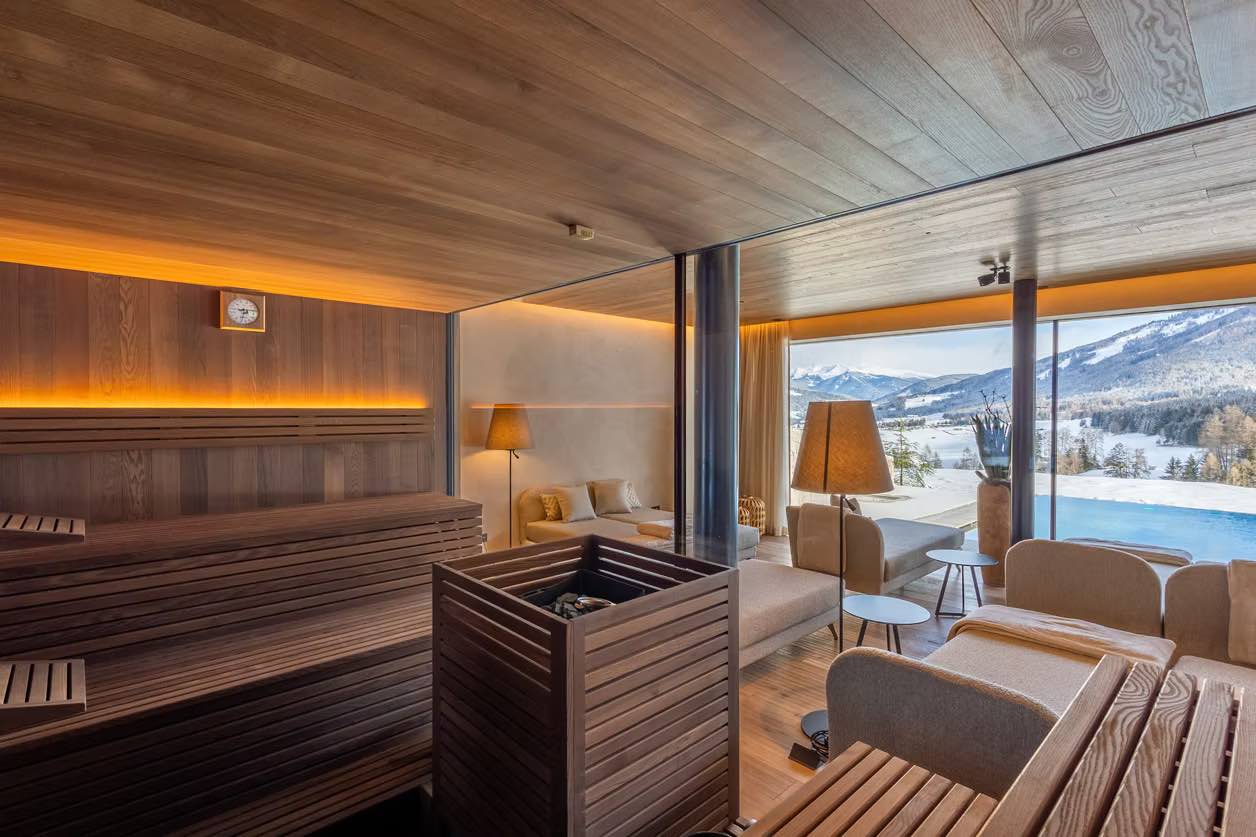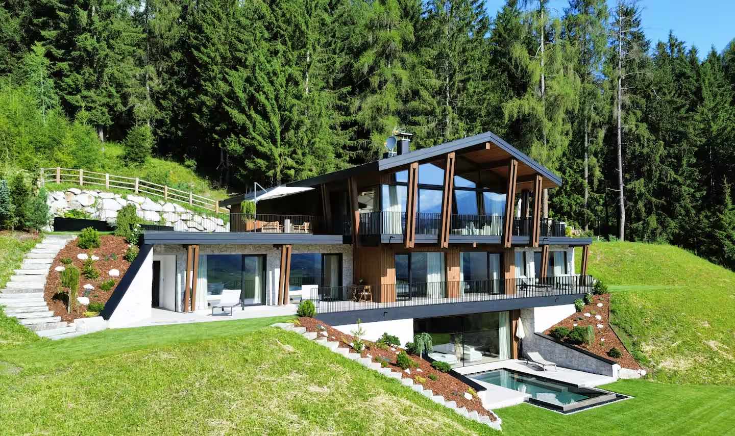 This brand-new luxury chalet is located directly on Kronplatz, South Tyrol’s number one ski mountain, just two minutes from the Olang valley station. Designed to accommodate up to twelve guests, the residence spans three floors and combines modern design with alpine warmth. Six spacious double bedrooms, each with en-suite bathroom, provide comfort and privacy, while the generous open-plan living and dining area, complete with two terraces and access to the garden, creates a welcoming space for gathering. A private wellness retreat with Finnish and bio sauna, a relaxation lounge, two experience showers, and a year-round heated infinity hot tub ensures total relaxation after a day in the mountains.
