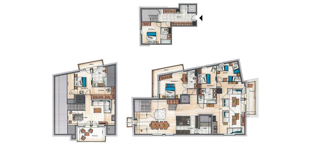This magnificent penthouse features four bedrooms with double beds and a fifth dormitory-style room with three single beds, along with four bathrooms. The inviting living area includes a spacious lounge with a fireplace, a dining space, and a fully equipped open kitchen. You’ll also enjoy the large south-facing balcony, which offers spectacular views of the Courchevel peaks.
