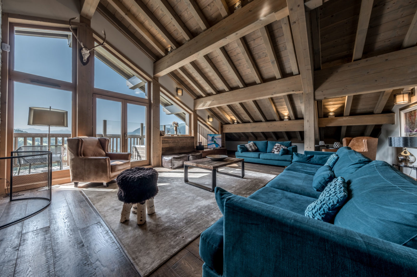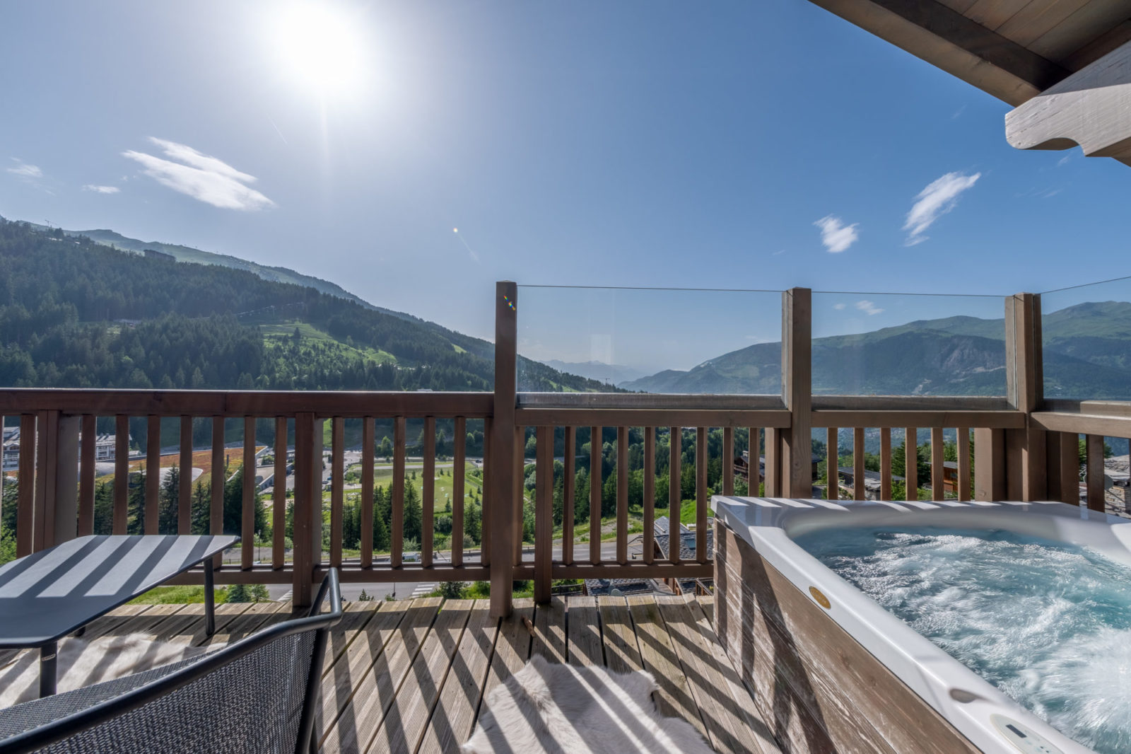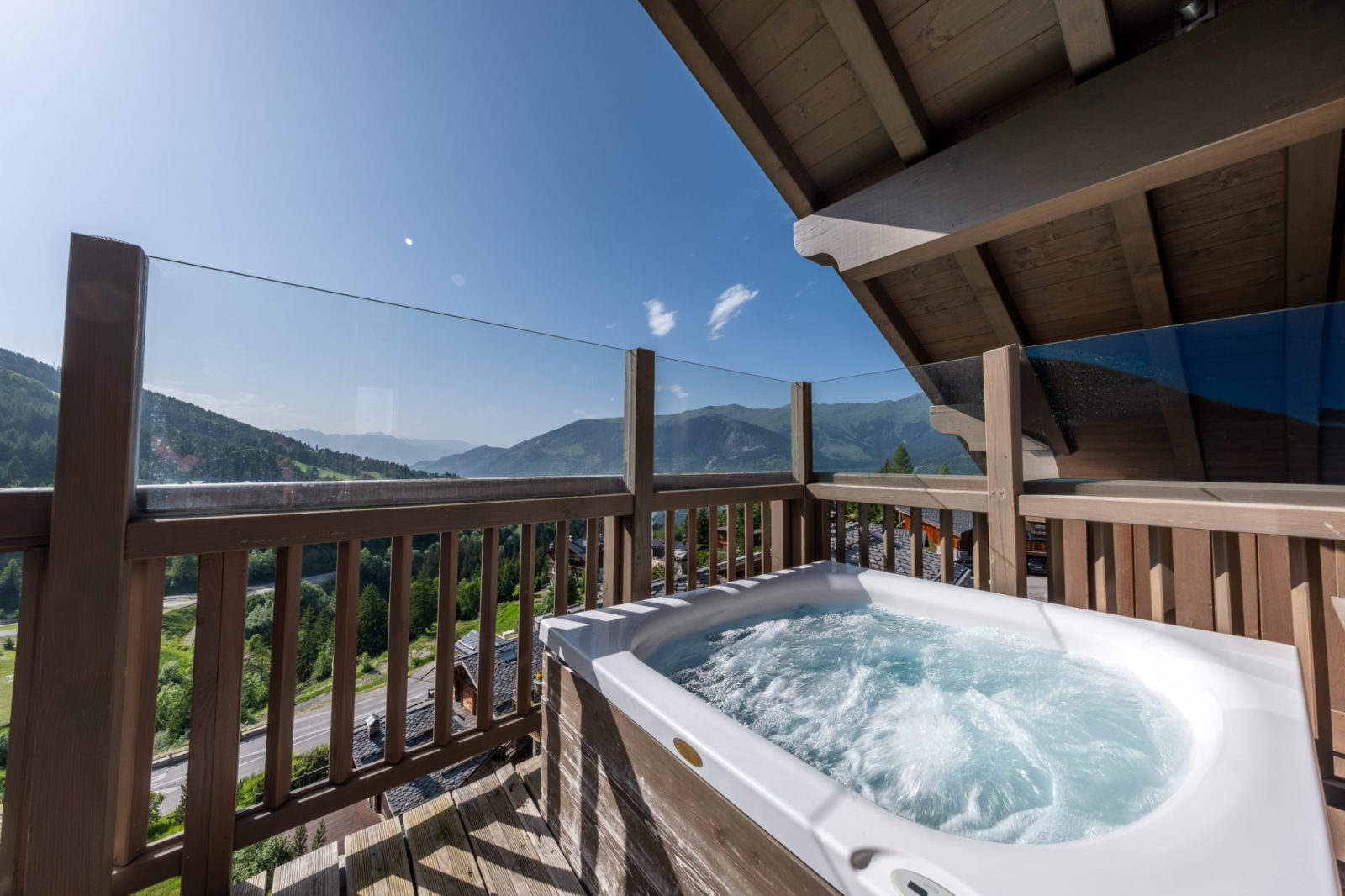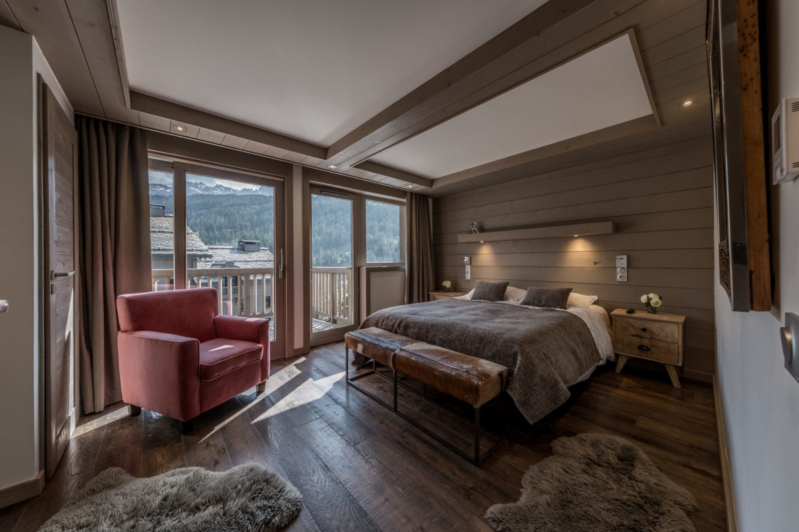A large picture window fills the space with natural light and opens onto a wide balcony overlooking the mountains. Here, a private jacuzzi corner invites you to relax while taking in stunning sunsets over the Alps.