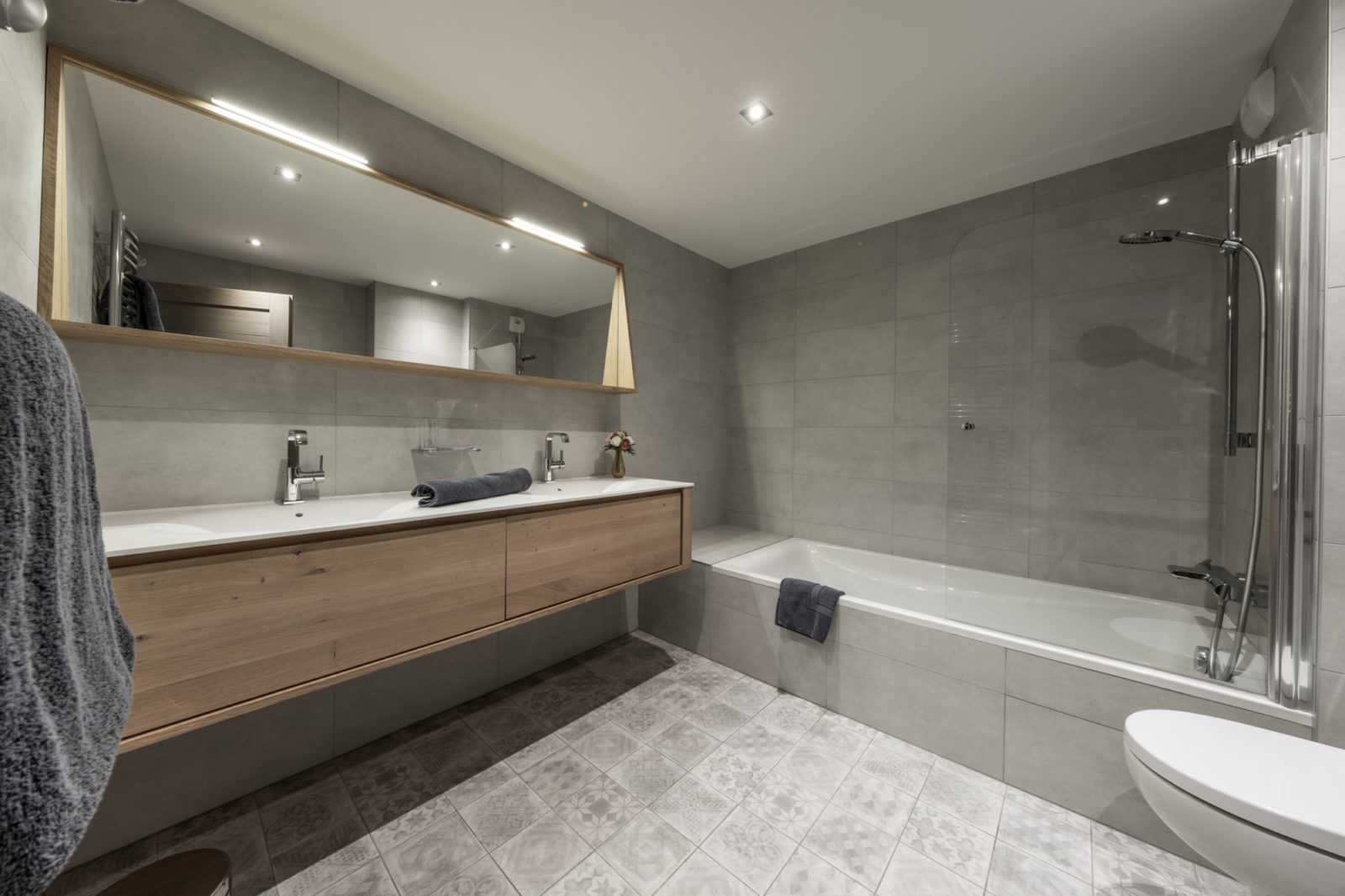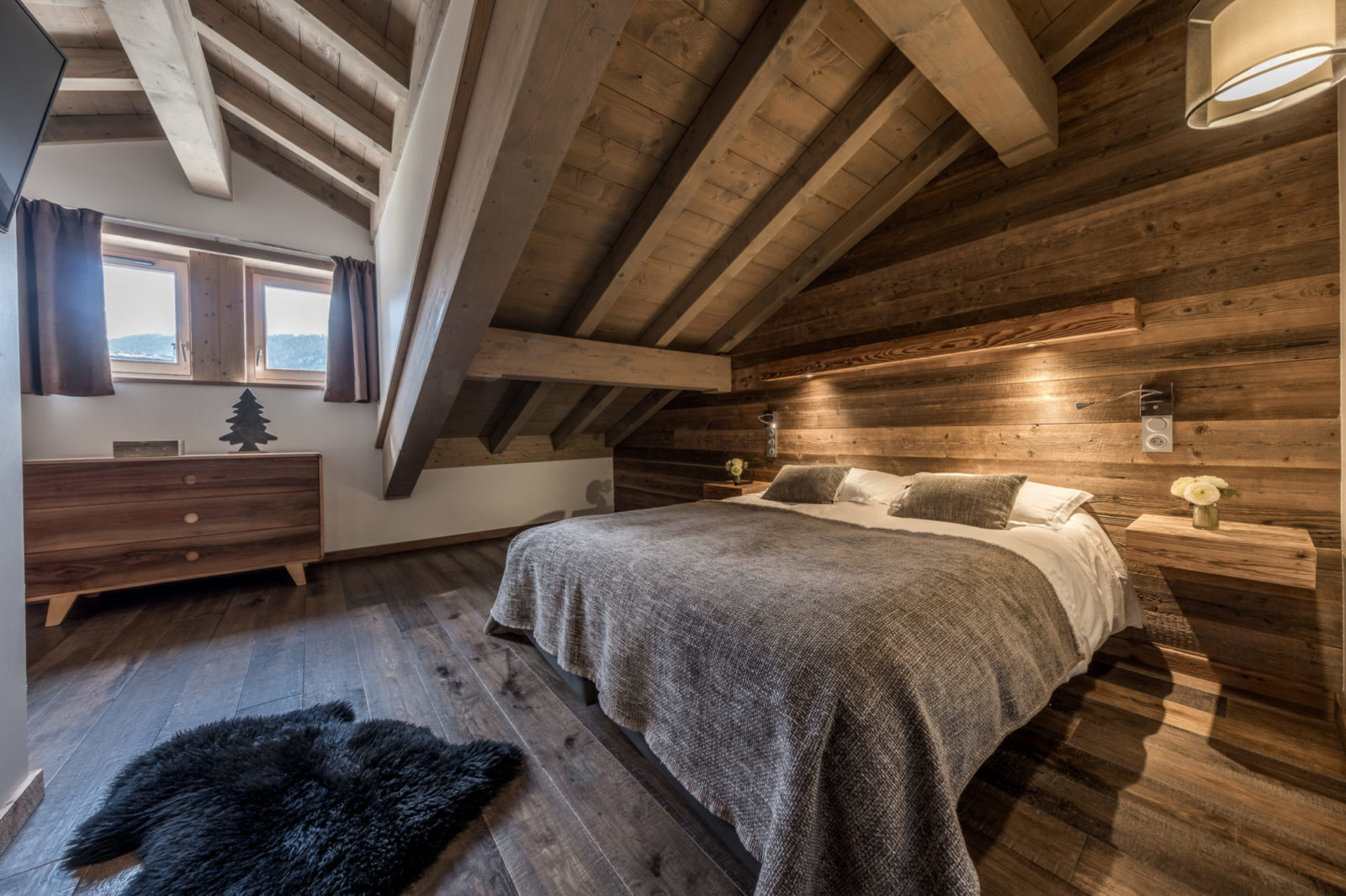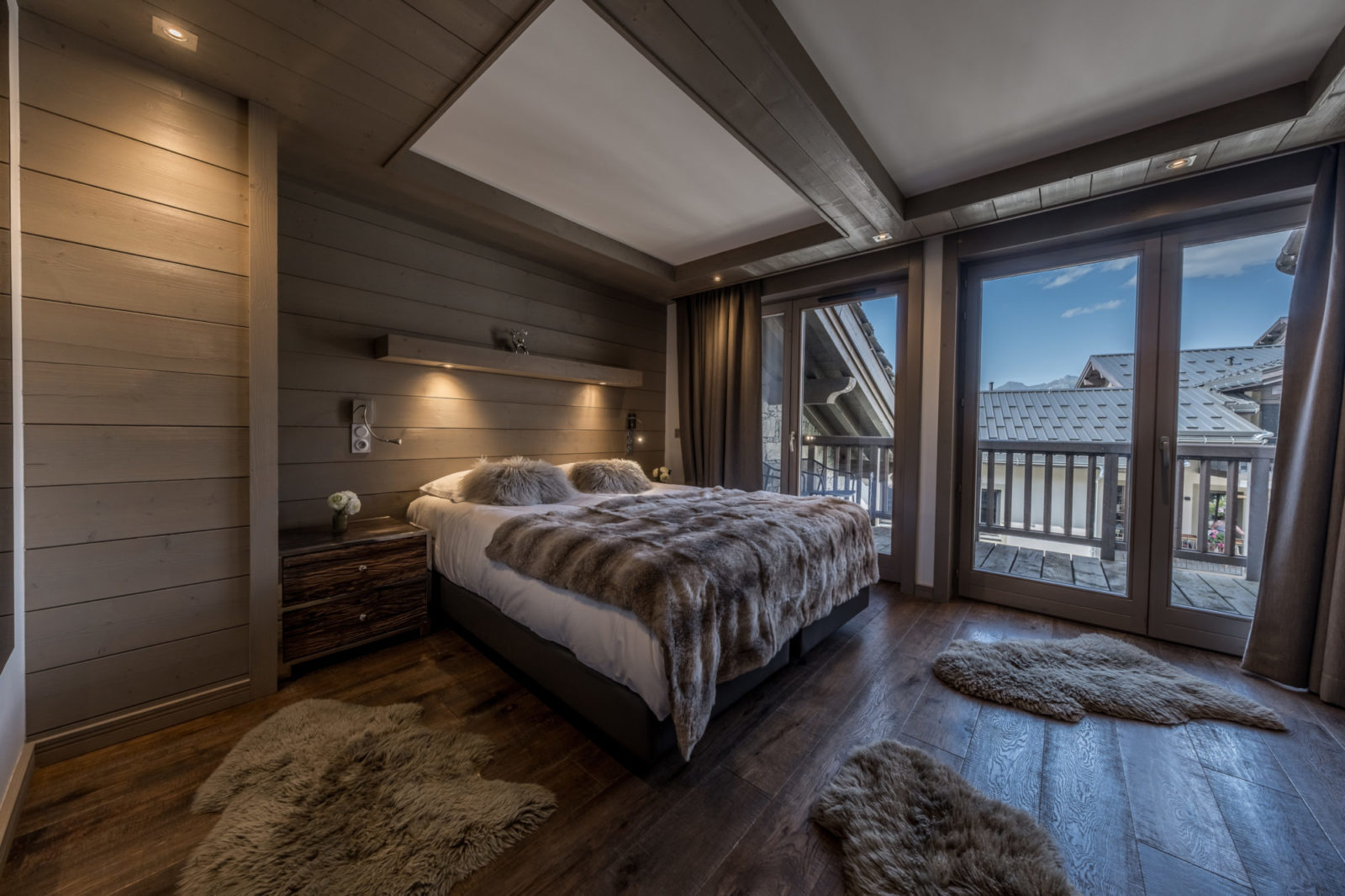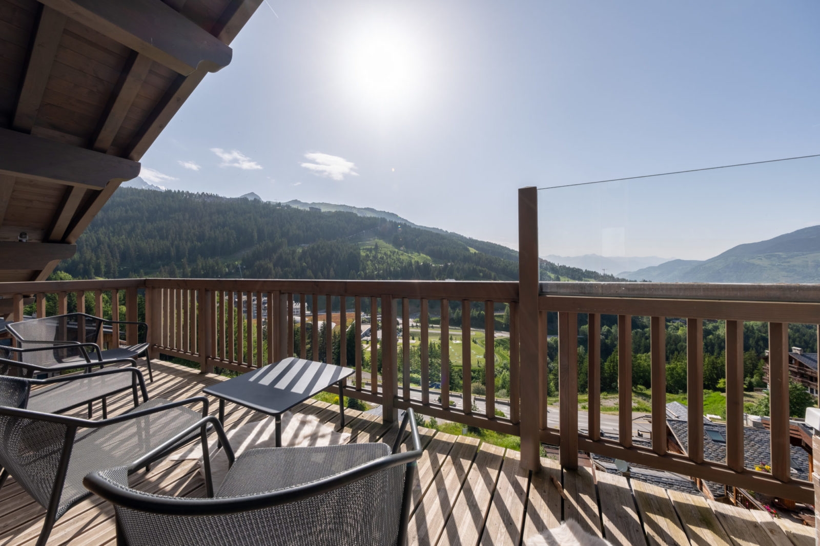 A large picture window fills the space with natural light and opens onto a wide balcony overlooking the mountains. Here, a private jacuzzi corner invites you to relax while taking in stunning sunsets over the Alps.