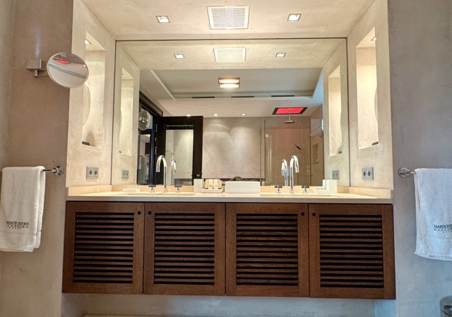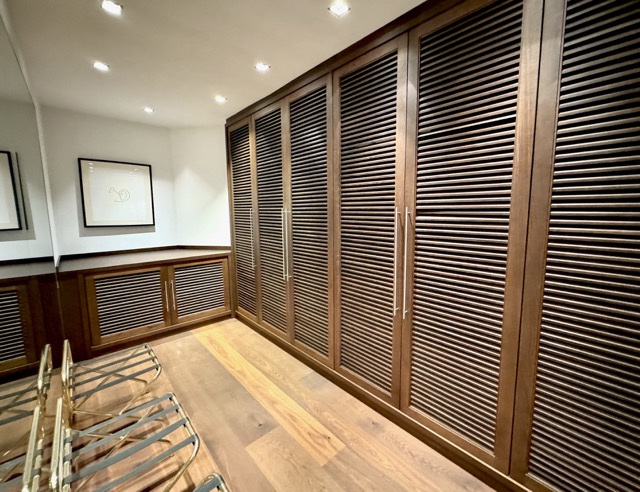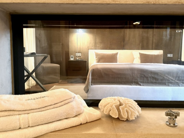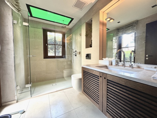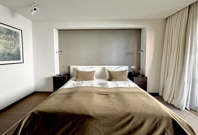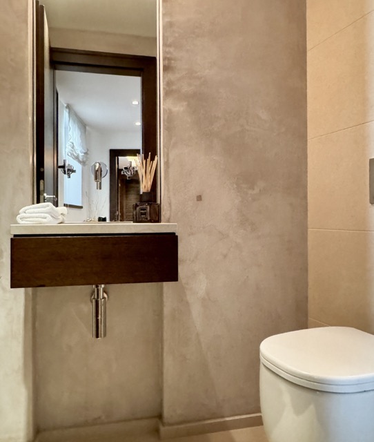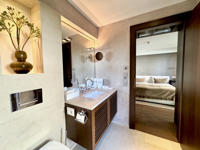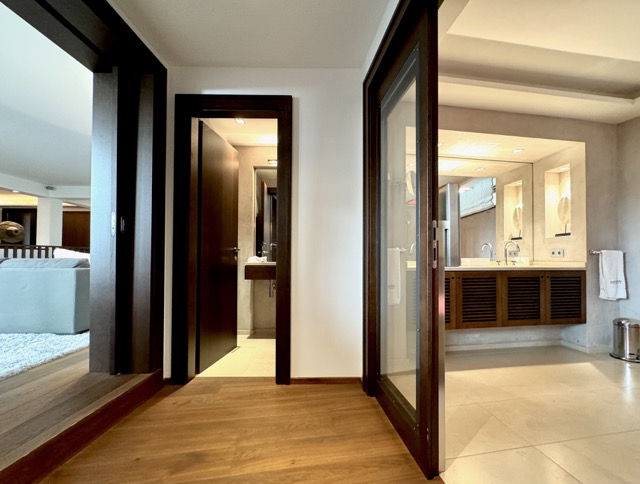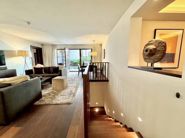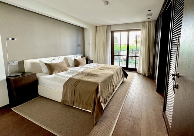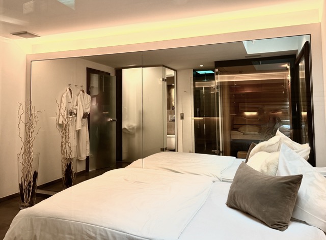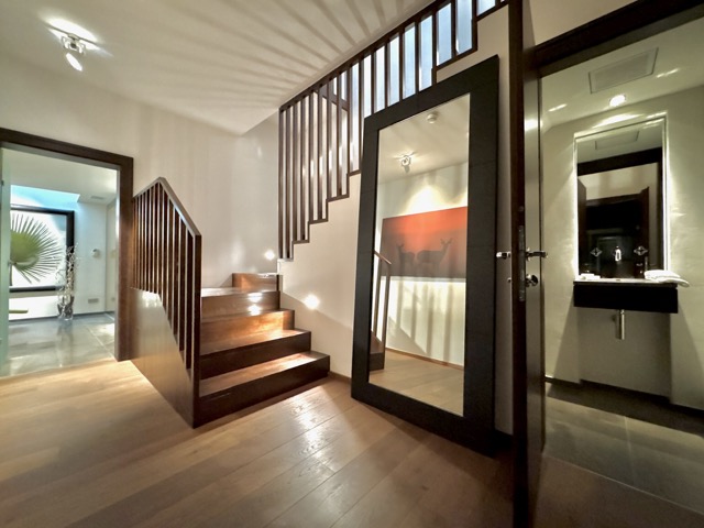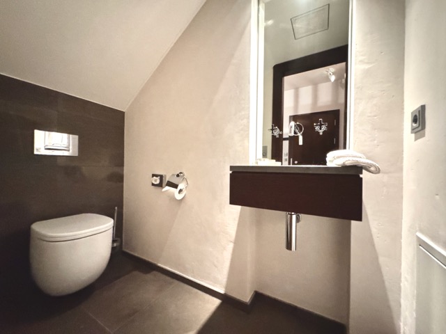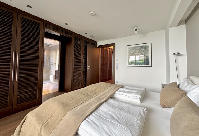 The suite is arranged over two levels. The upper floor features a welcoming hallway, a bright living and dining area with a kitchenette, a terrace, and two large bedrooms, each with its own ensuite bathroom. One of these bedrooms also includes a spacious dressing area. On the lower floor, the wellness area offers built-in cupboards, a sauna, steam shower, additional shower and toilet, as well as a comfortable double bed. Please note that one of the double beds is located in the wellness area.