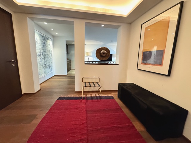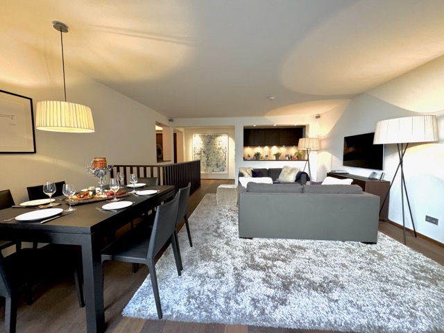 For leisure and entertainment, guests can enjoy the suite’s private home theater with its own film archive, along with a children’s playroom that is shared with the other suites. A private underground parking space is included, and guests also have access to a shared ski cellar, gaming room, and home cinema.