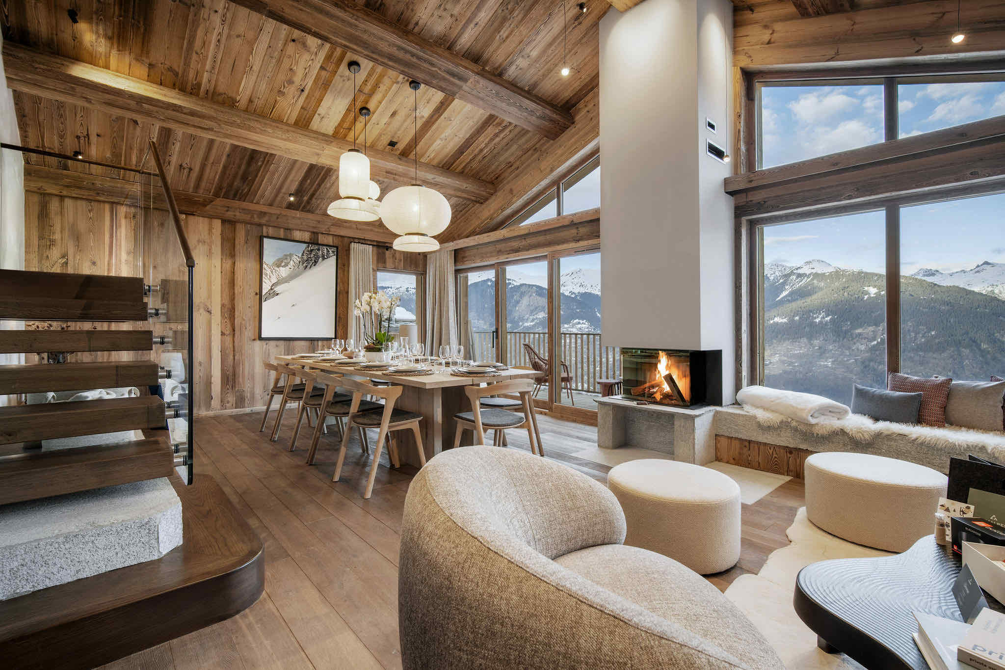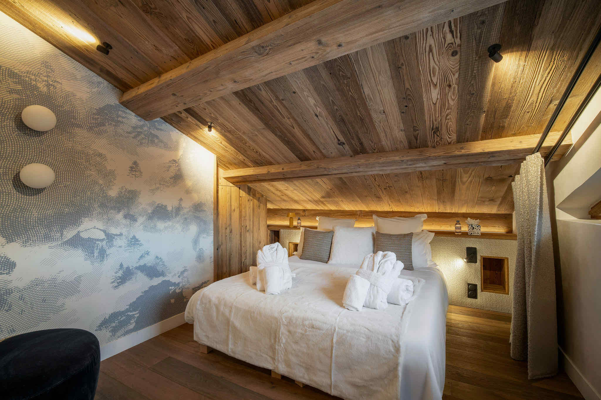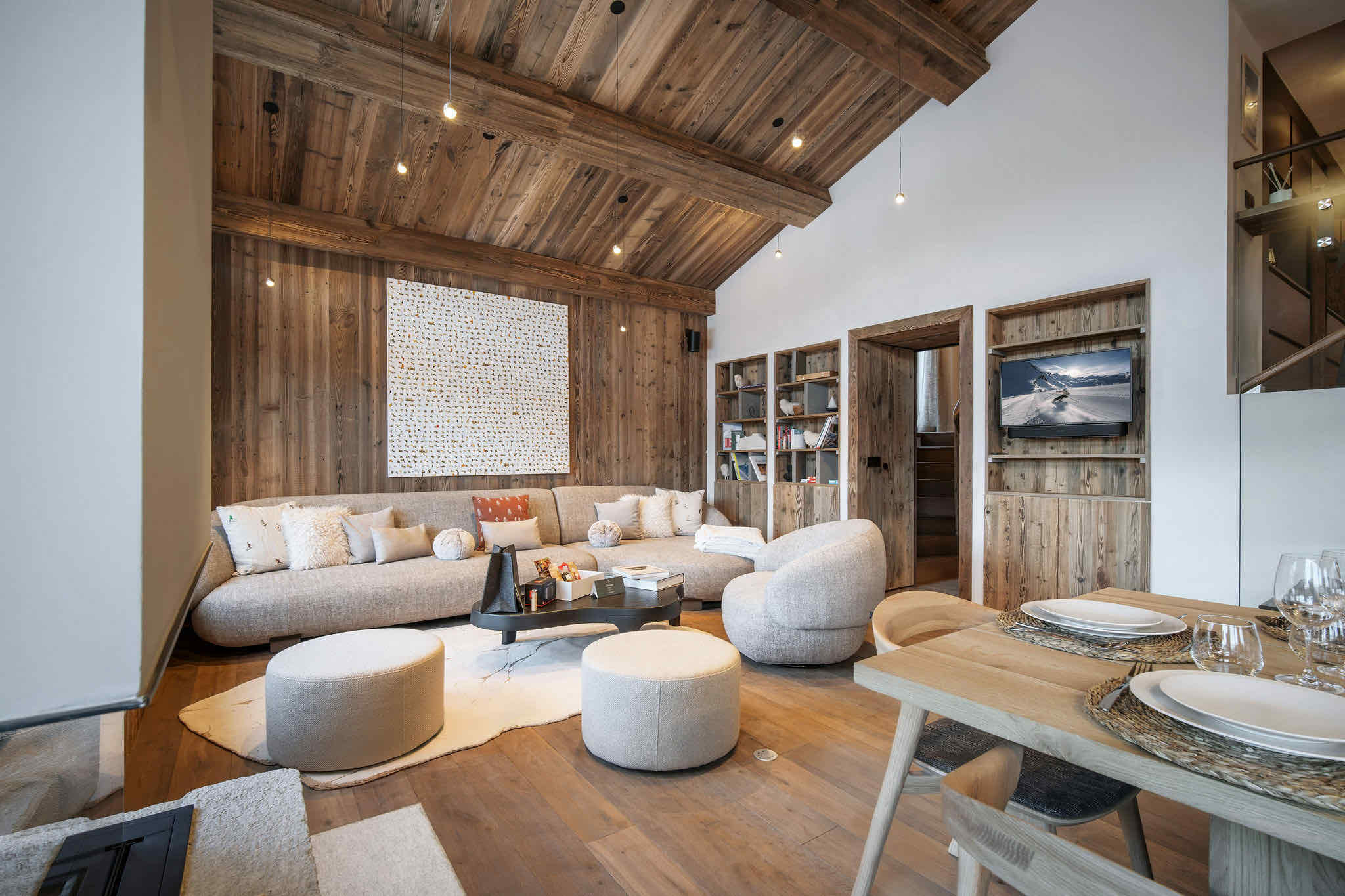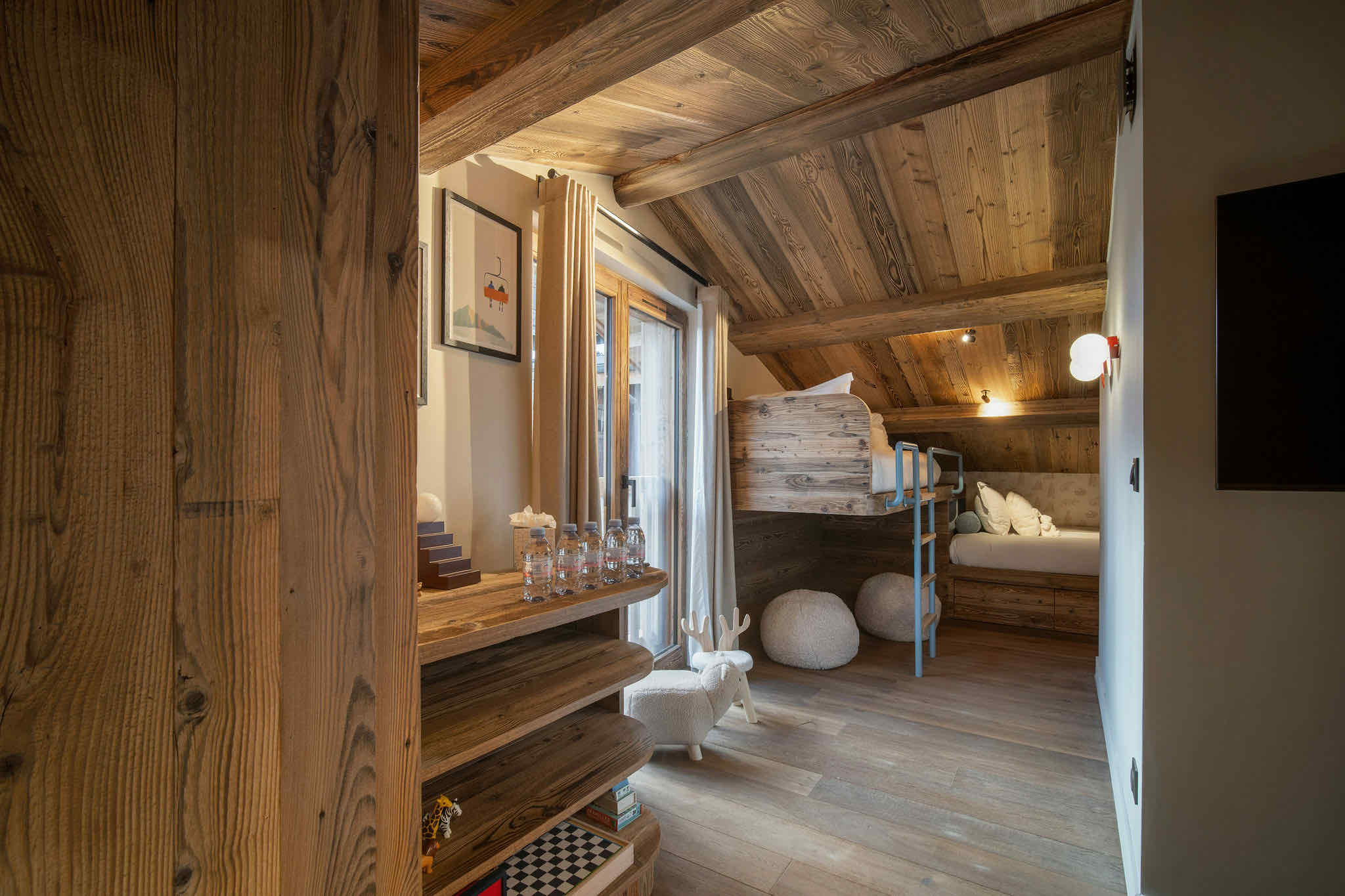 La Poudreuse is a spacious chalet arranged over four levels, offering generous volumes throughout. It features four en-suite bedrooms, including a family room with one double bed and five single beds. The living area feels wonderfully open thanks to its cathedral ceiling and panoramic views of the surrounding landscape. Opening onto a terrace, it provides the perfect setting for après-ski drinks while admiring the mountain scenery. Blending natural wood with contemporary furnishings in soft, soothing tones, La Poudreuse exudes a warm and welcoming family atmosphere.
