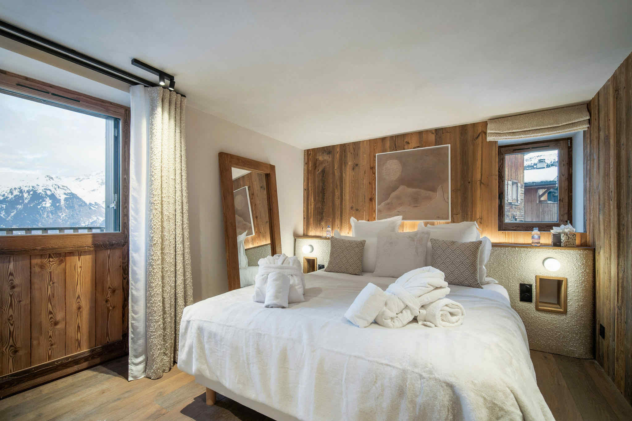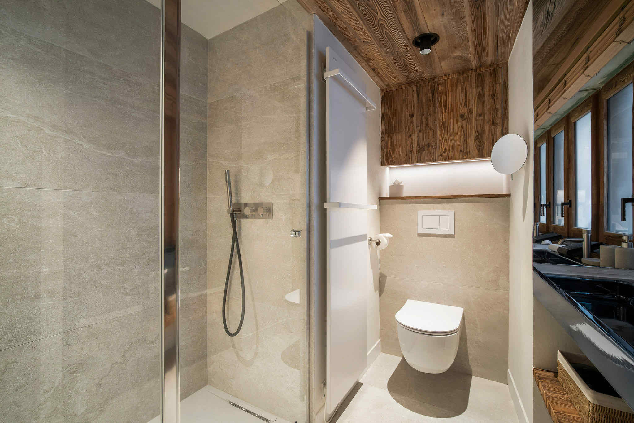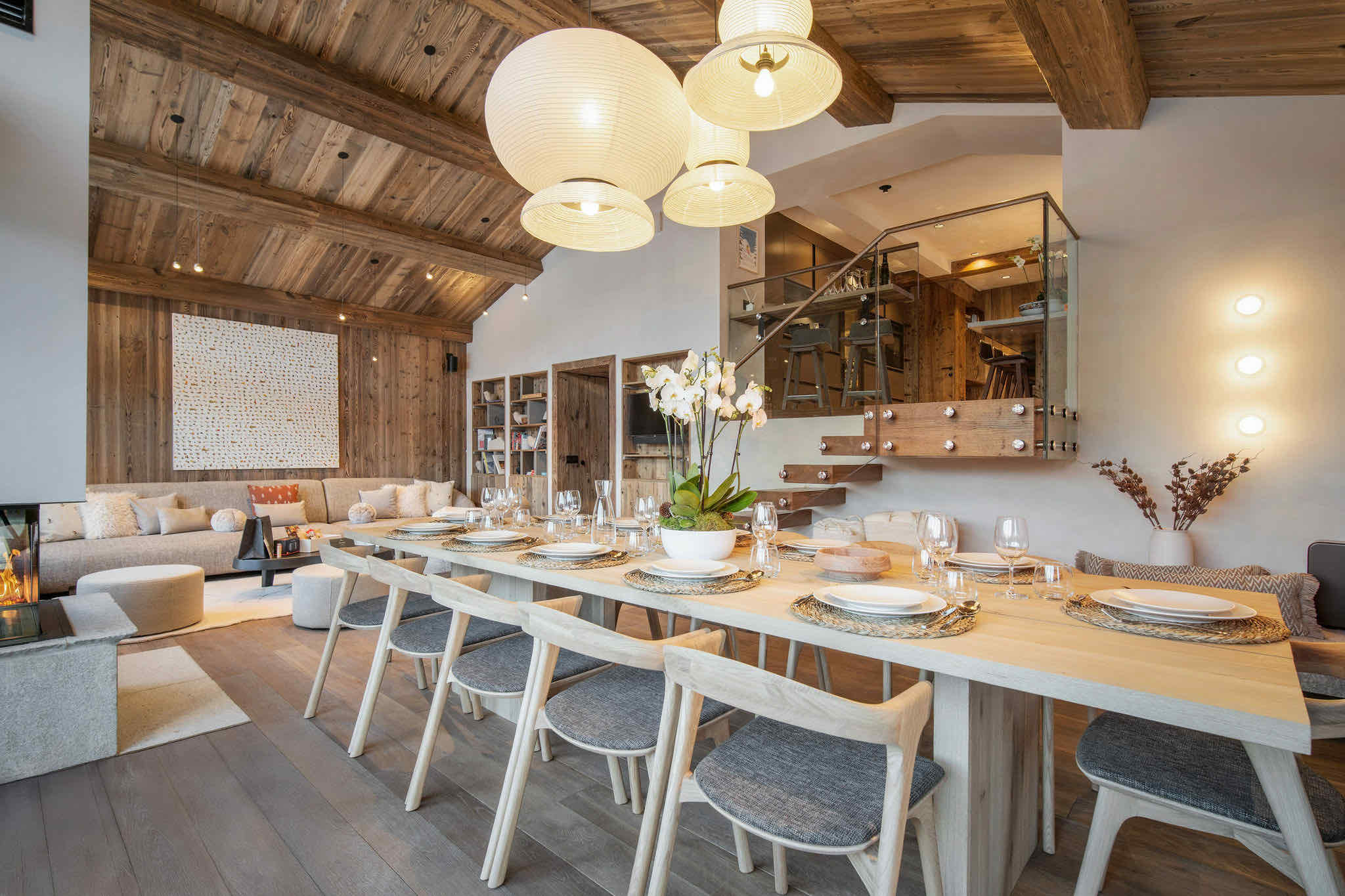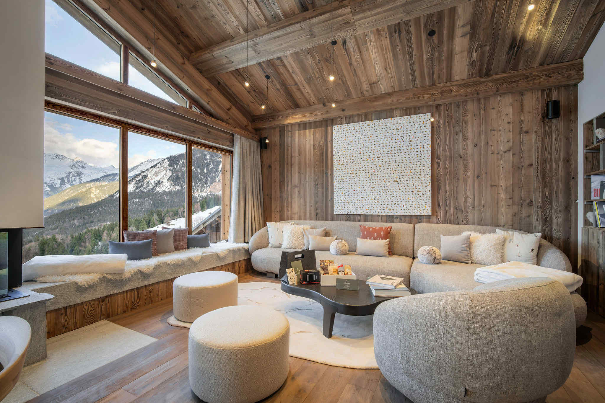 La Poudreuse is a spacious chalet arranged over four levels, offering generous volumes throughout. It features four en-suite bedrooms, including a family room with one double bed and five single beds. The living area feels wonderfully open thanks to its cathedral ceiling and panoramic views of the surrounding landscape. Opening onto a terrace, it provides the perfect setting for après-ski drinks while admiring the mountain scenery. Blending natural wood with contemporary furnishings in soft, soothing tones, La Poudreuse exudes a warm and welcoming family atmosphere.