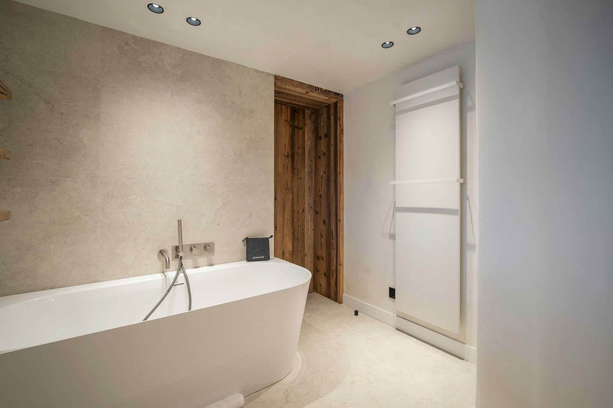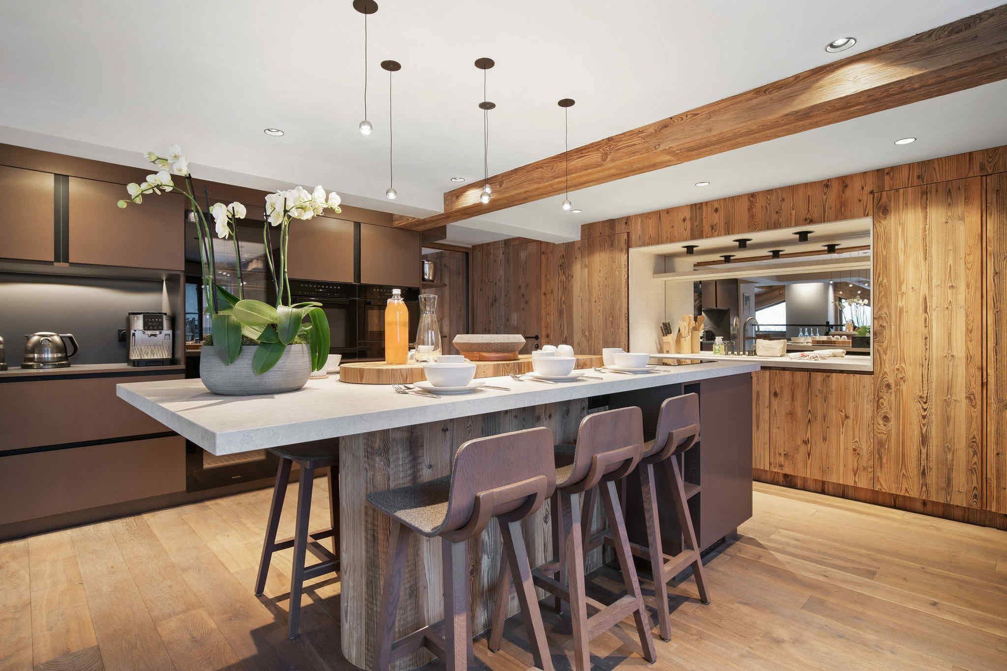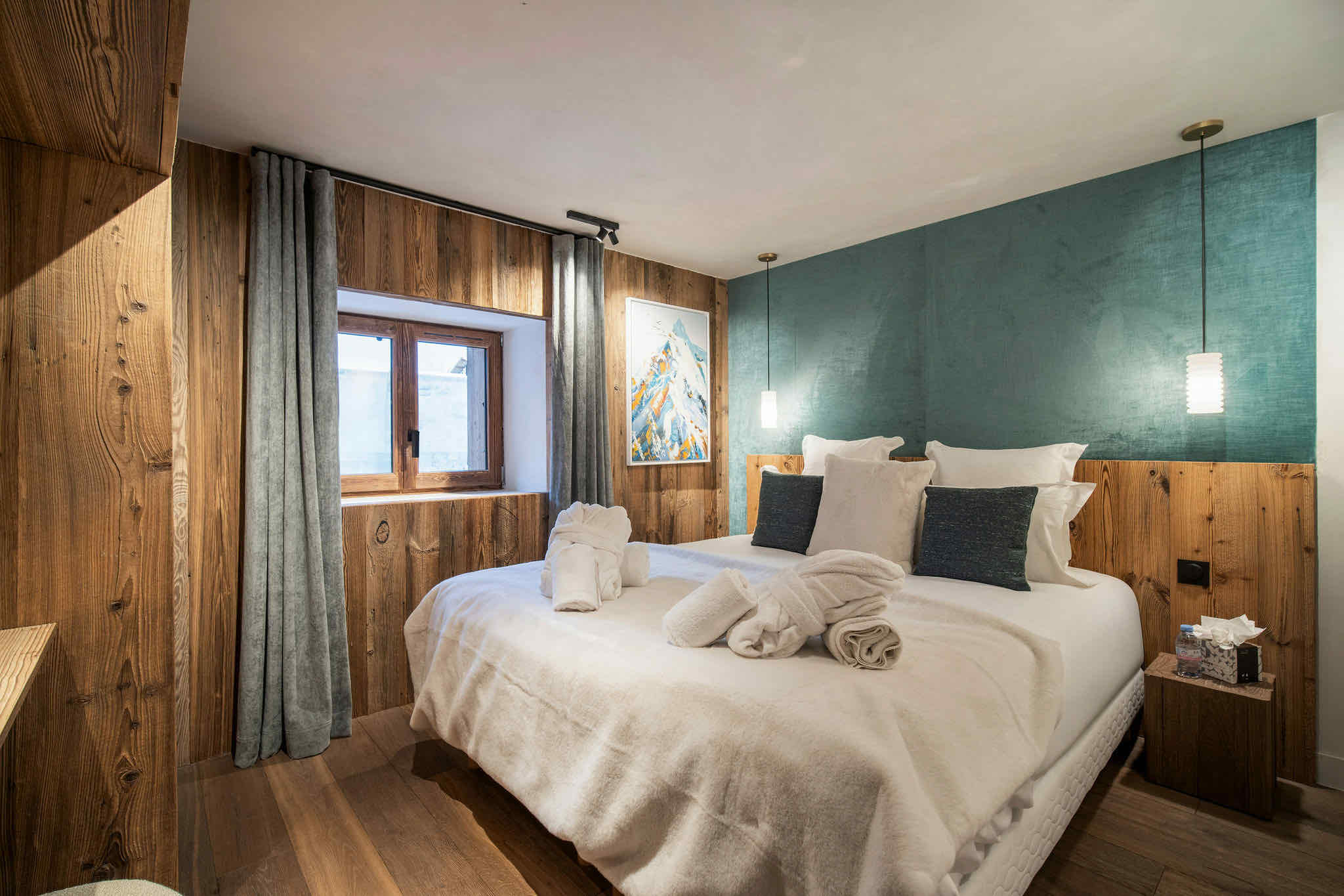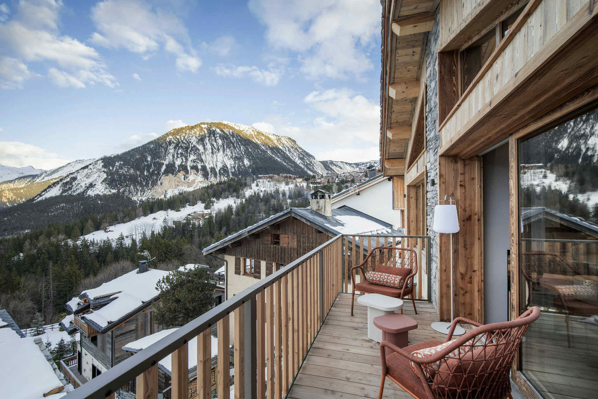 La Poudreuse is a spacious chalet arranged over four levels, offering generous volumes throughout. It features four en-suite bedrooms, including a family room with one double bed and five single beds. The living area feels wonderfully open thanks to its cathedral ceiling and panoramic views of the surrounding landscape. Opening onto a terrace, it provides the perfect setting for après-ski drinks while admiring the mountain scenery. Blending natural wood with contemporary furnishings in soft, soothing tones, La Poudreuse exudes a warm and welcoming family atmosphere.