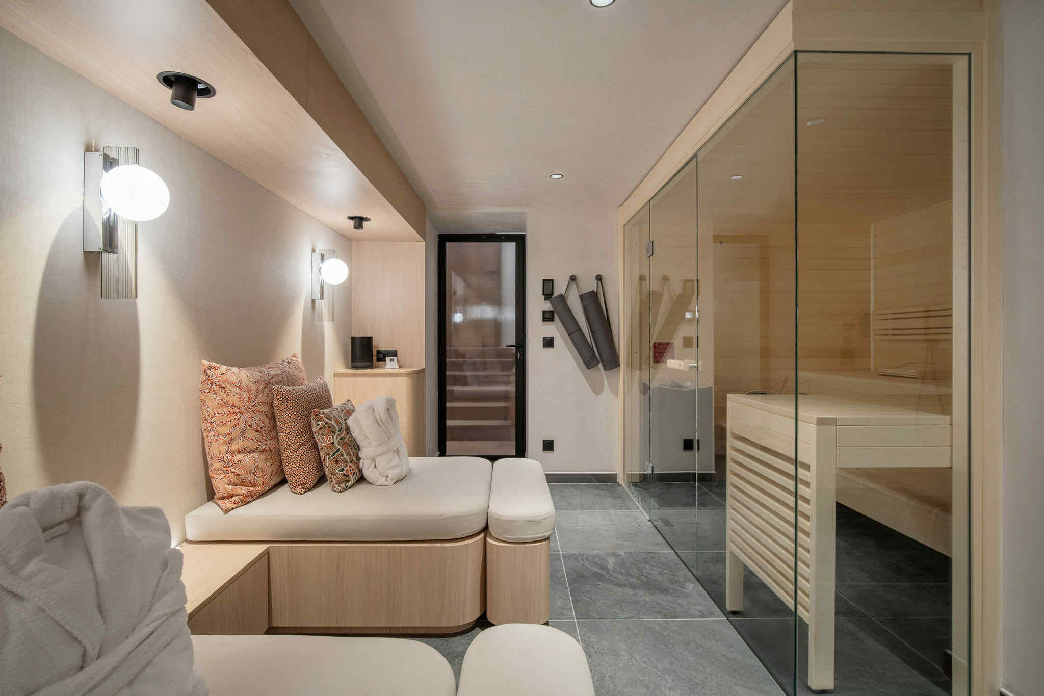 On level -1, the chalet’s wellness area is dedicated to relaxation, featuring a sauna and a peaceful relaxation room. A fully equipped ski room is also located on this level for added convenience.