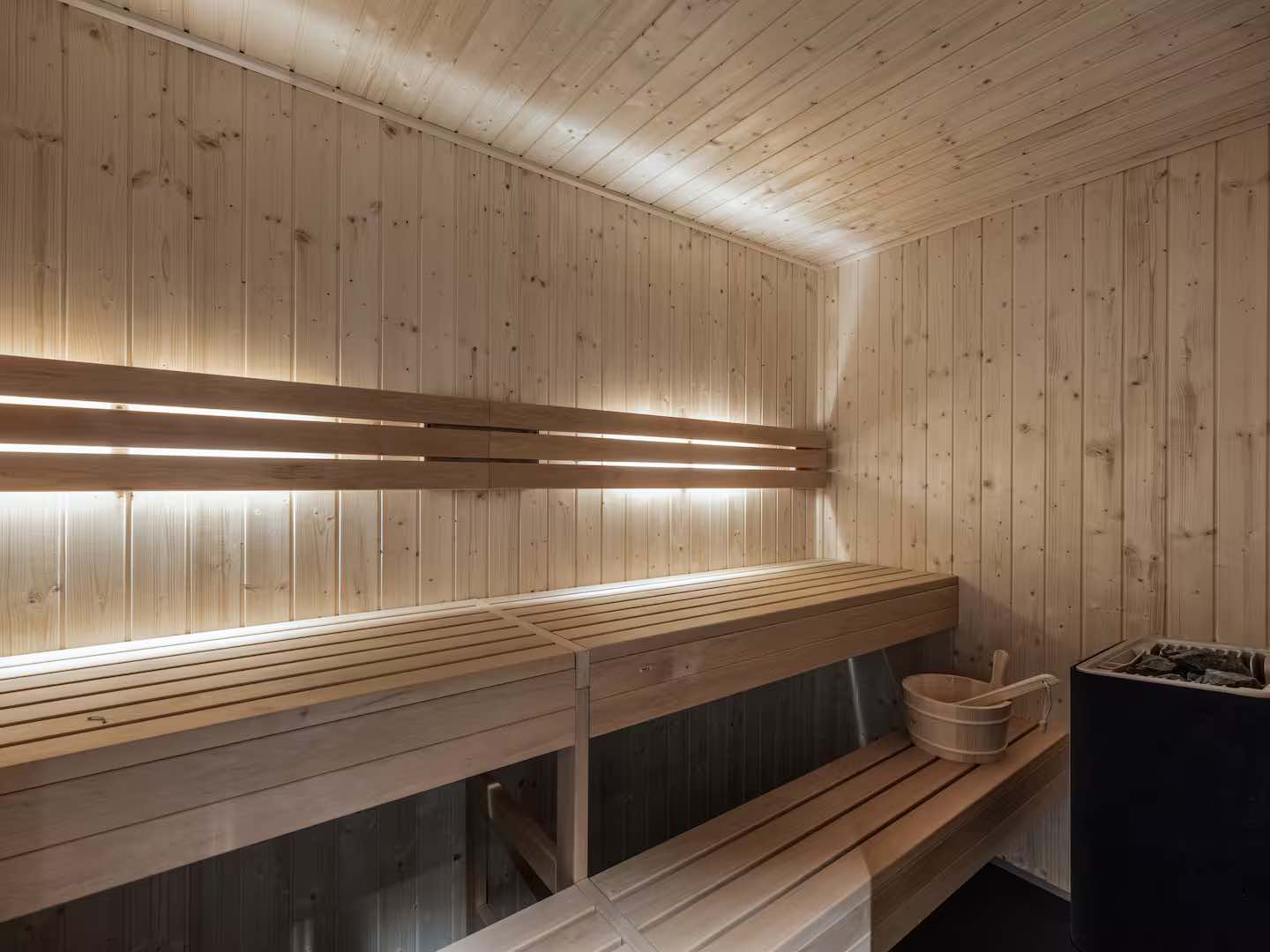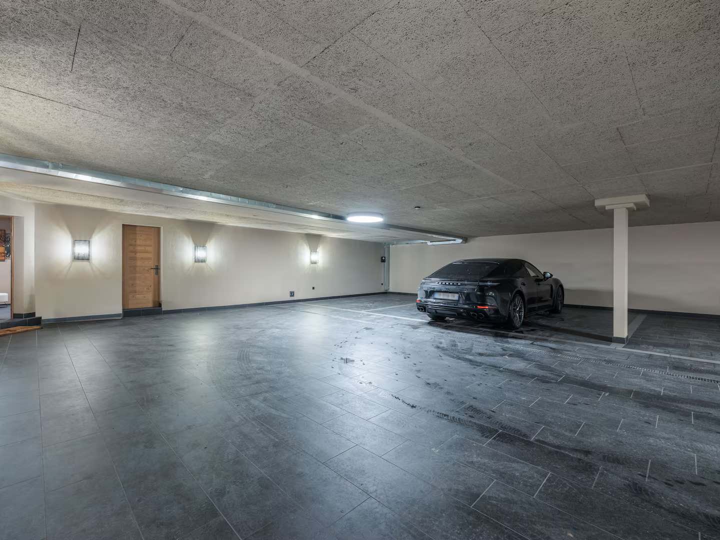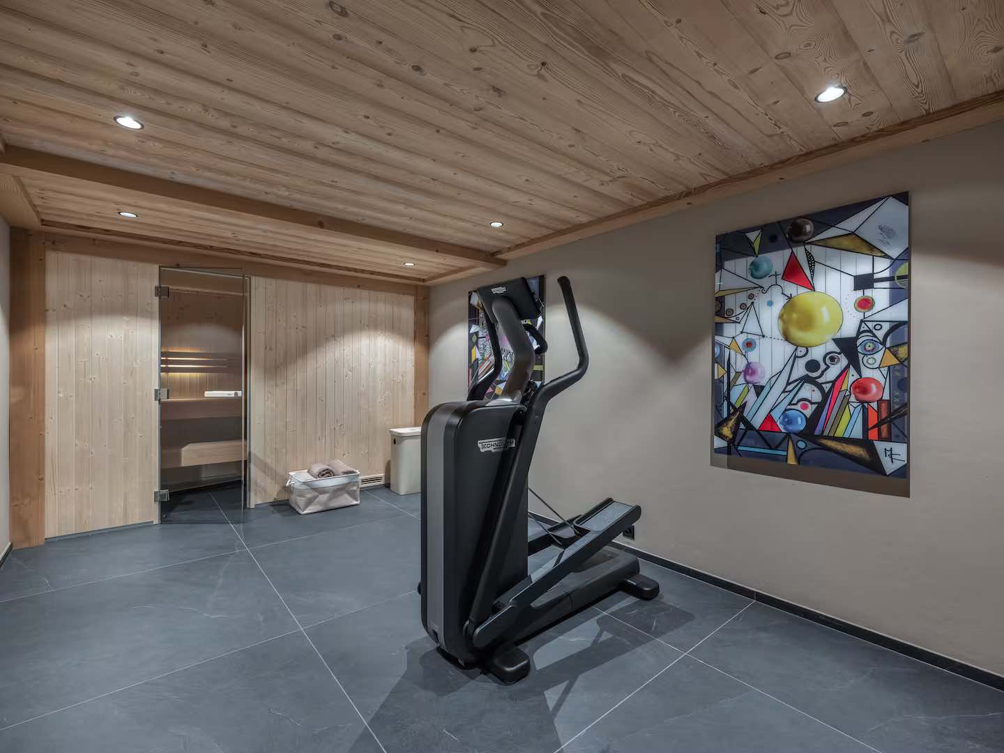 The lower level completes the property with a wellness and leisure area that includes a gym with sauna, a heated ski room, a laundry space, and an indoor garage with two parking spaces.