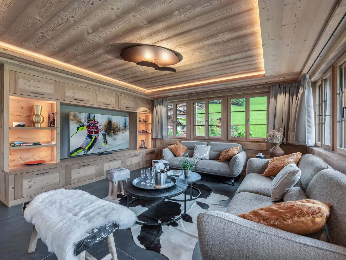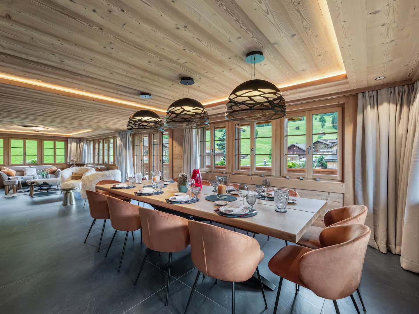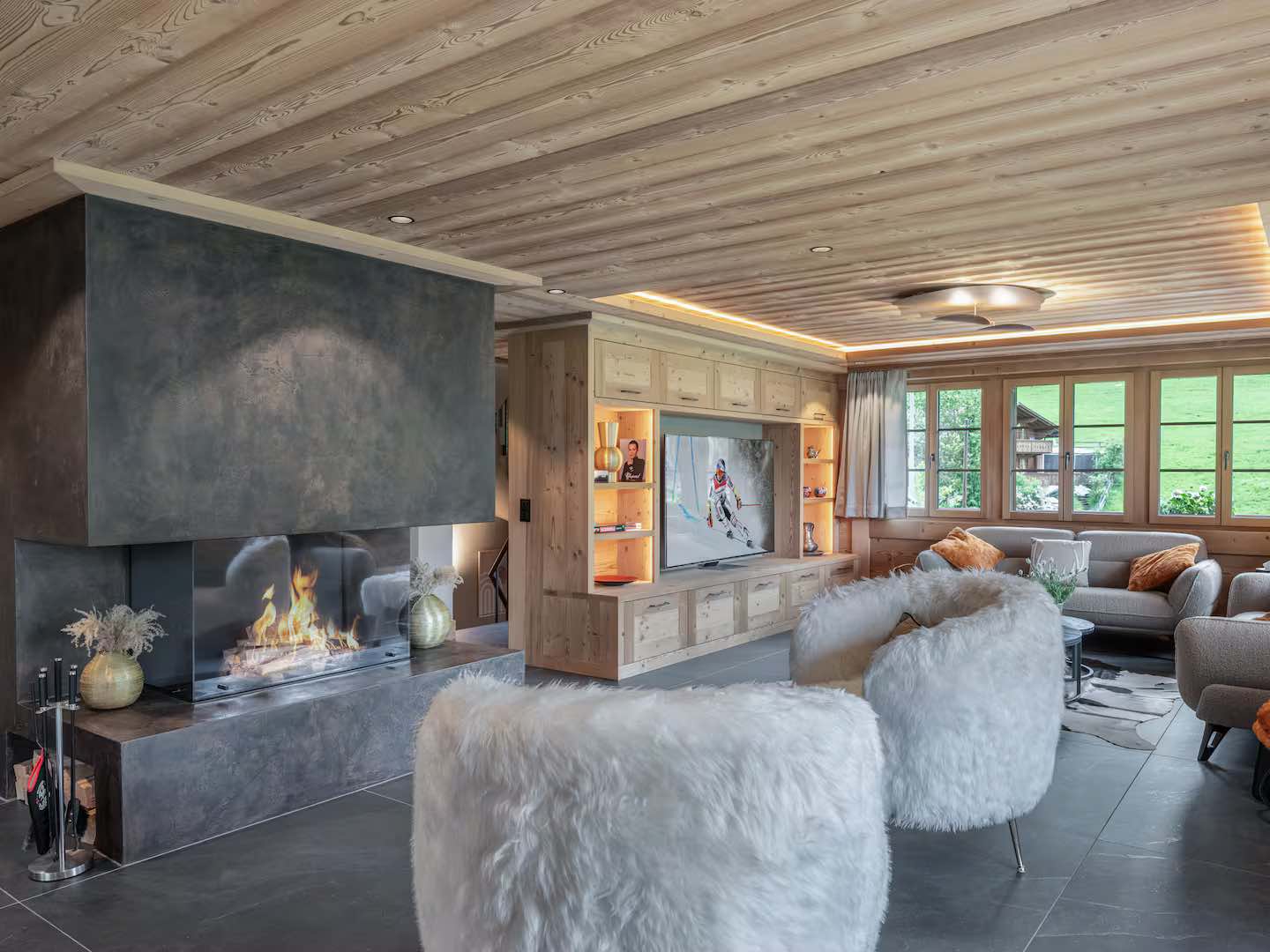 Spread across four levels and served by a private elevator, the chalet features six spacious bedrooms, each with its own bathroom and magnificent views of the surrounding peaks, including the Wispile, Eggli, and Glacier mountains. The main living area, set on the first floor, invites you to gather around a double-sided fireplace or step out onto a large terrace to share meals and admire the views year-round. The kitchen is fully equipped with modern appliances and includes raclette and fondue sets for authentic Swiss evenings.