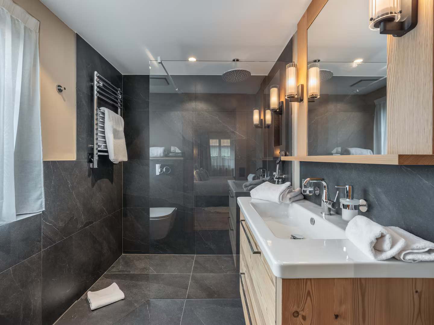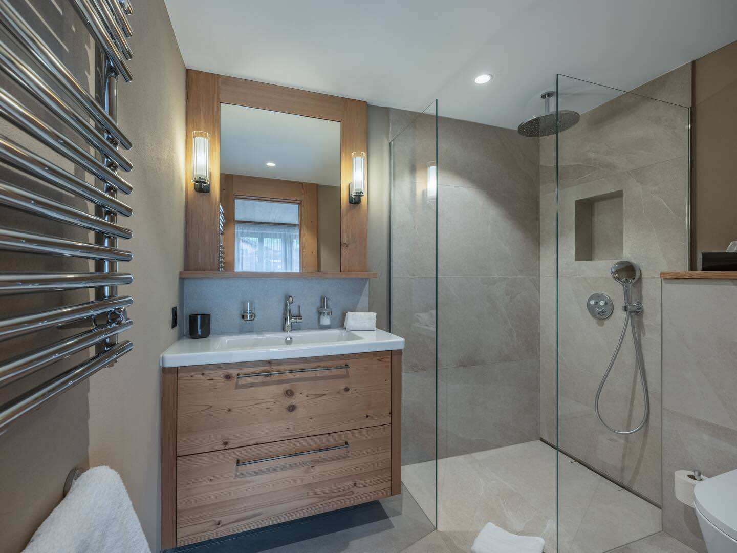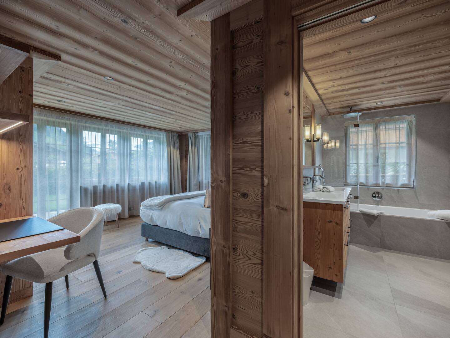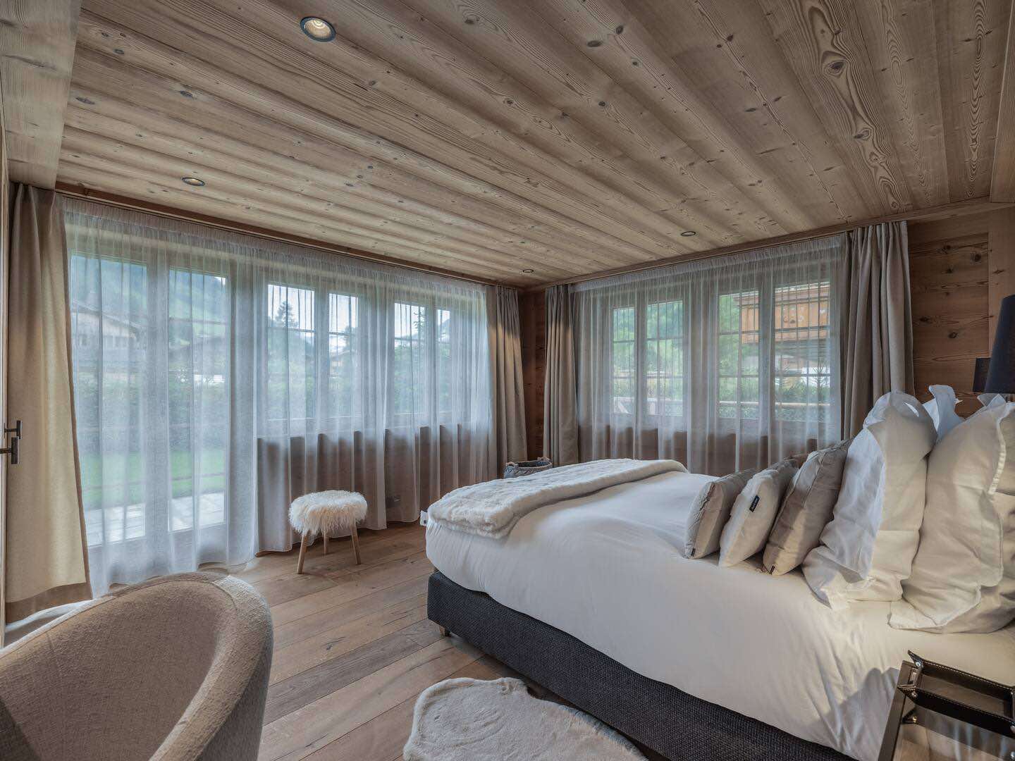 Spread across four levels and served by a private elevator, the chalet features six spacious bedrooms, each with its own bathroom and magnificent views of the surrounding peaks, including the Wispile, Eggli, and Glacier mountains. The main living area, set on the first floor, invites you to gather around a double-sided fireplace or step out onto a large terrace to share meals and admire the views year-round. The kitchen is fully equipped with modern appliances and includes raclette and fondue sets for authentic Swiss evenings.