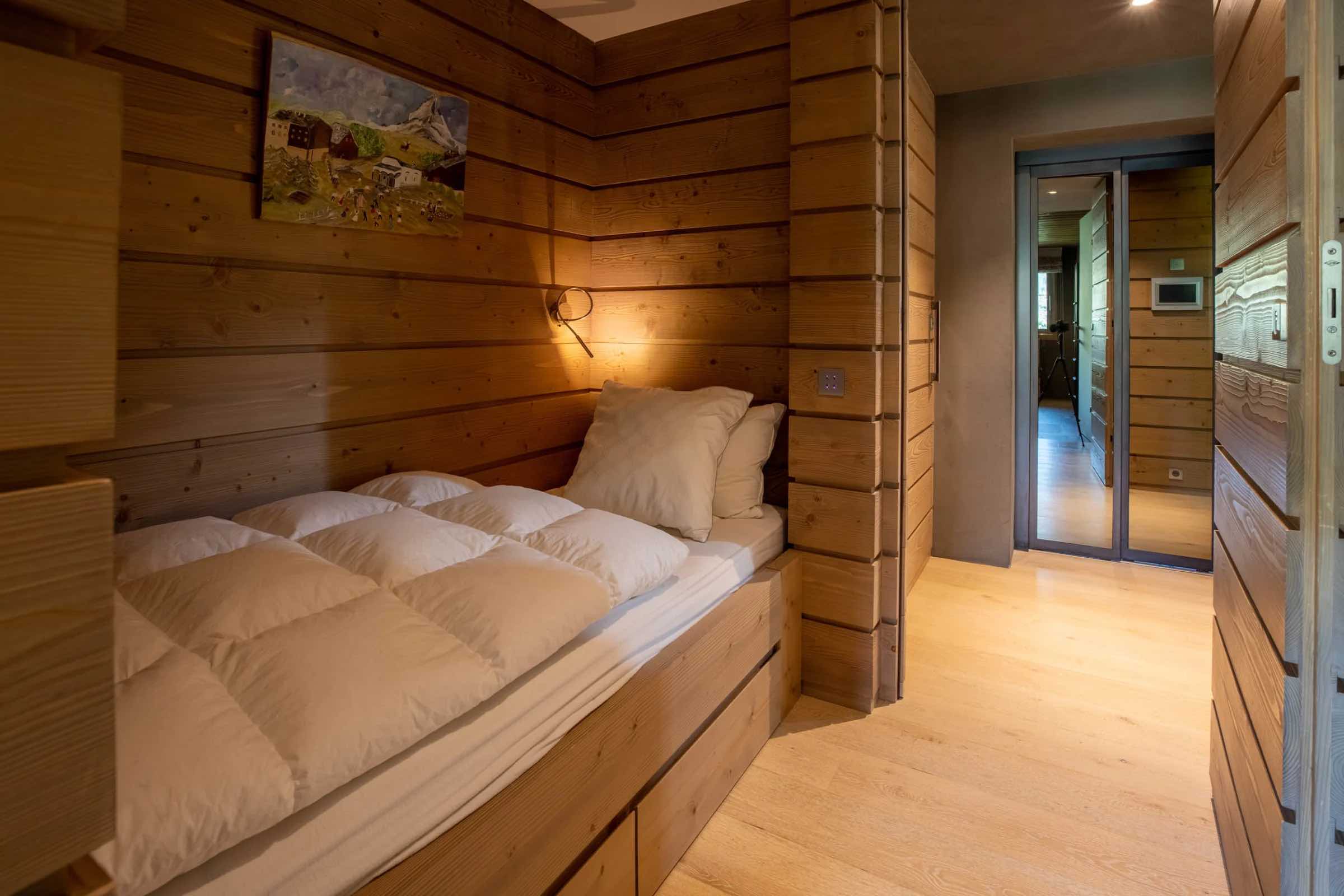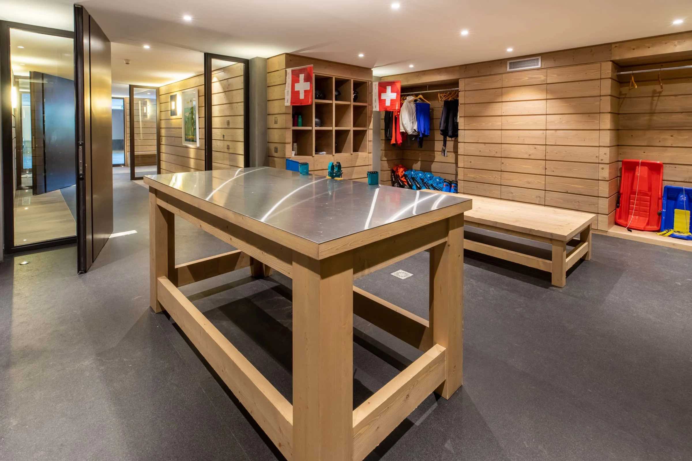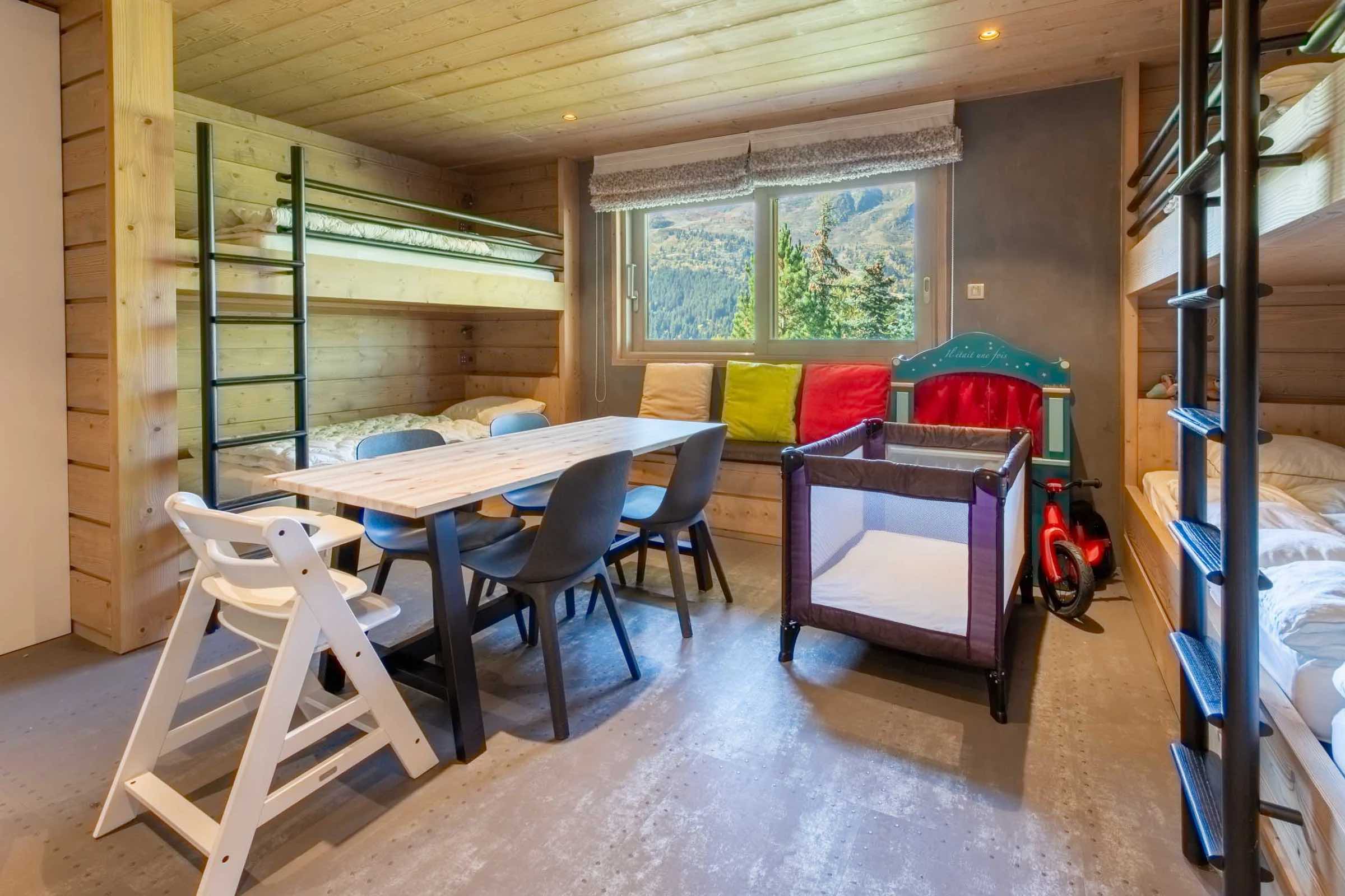 Younger guests are perfectly catered for in the dedicated children’s dormitory, which includes three bunk beds sleeping six, a baby cot, and a private bathroom. This welcoming space provides children with their own cosy alpine haven, ideal for rest, play, and storytelling after a day in the snow.