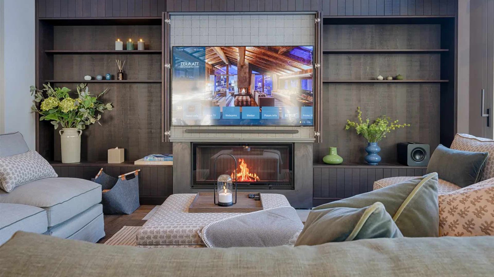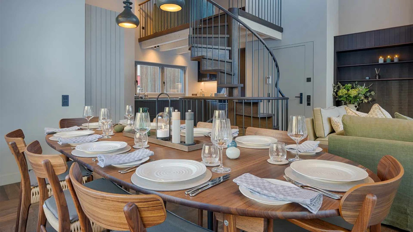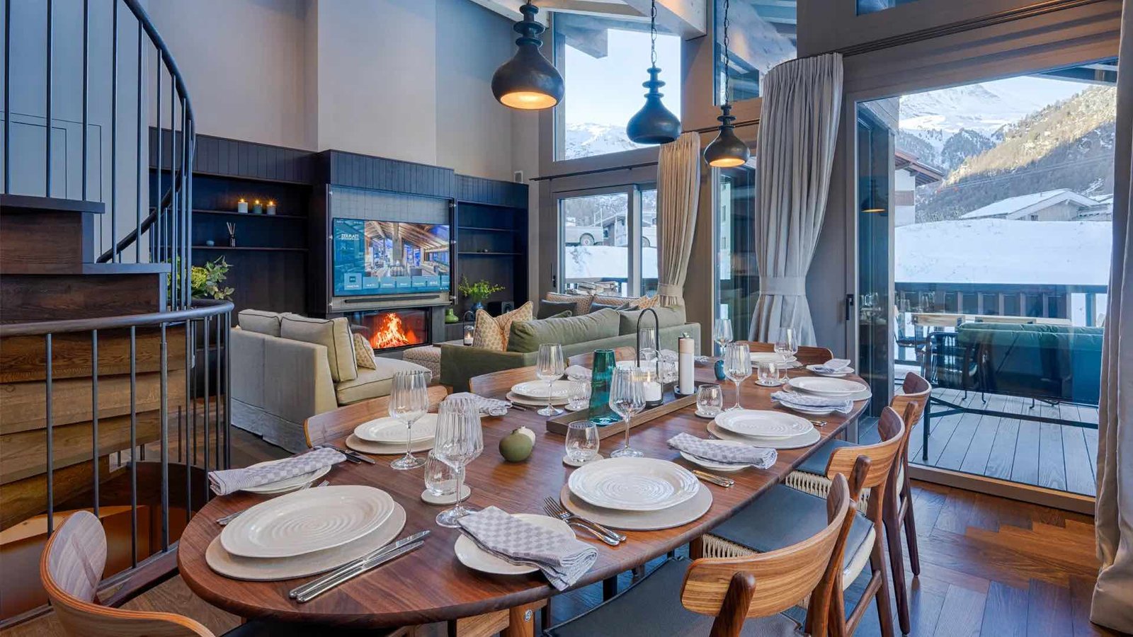 At the heart of the lodge, a stylish open-plan living space offers an inviting place to unwind. A feature fireplace, designer furnishings, and south-facing balconies frame uninterrupted alpine views, while the spacious dining area comfortably seats up to twelve. The fully equipped handmade kitchen includes premium appliances and a mezzanine snug that can double as an additional sleeping or TV area.