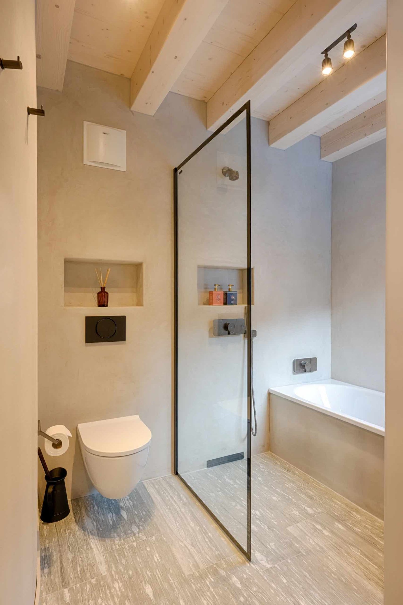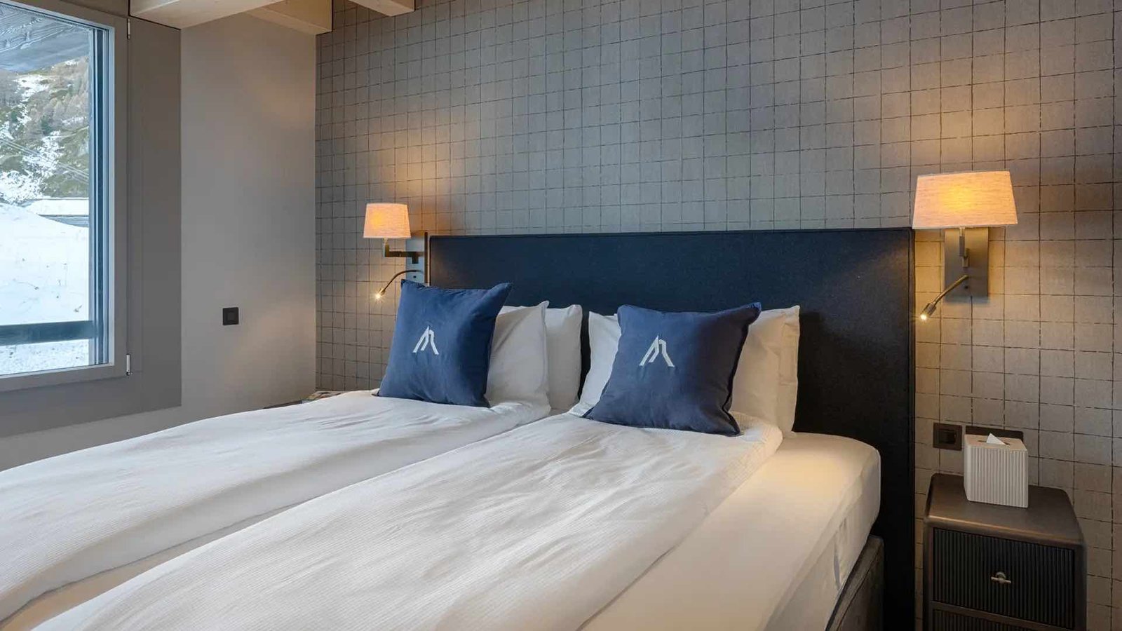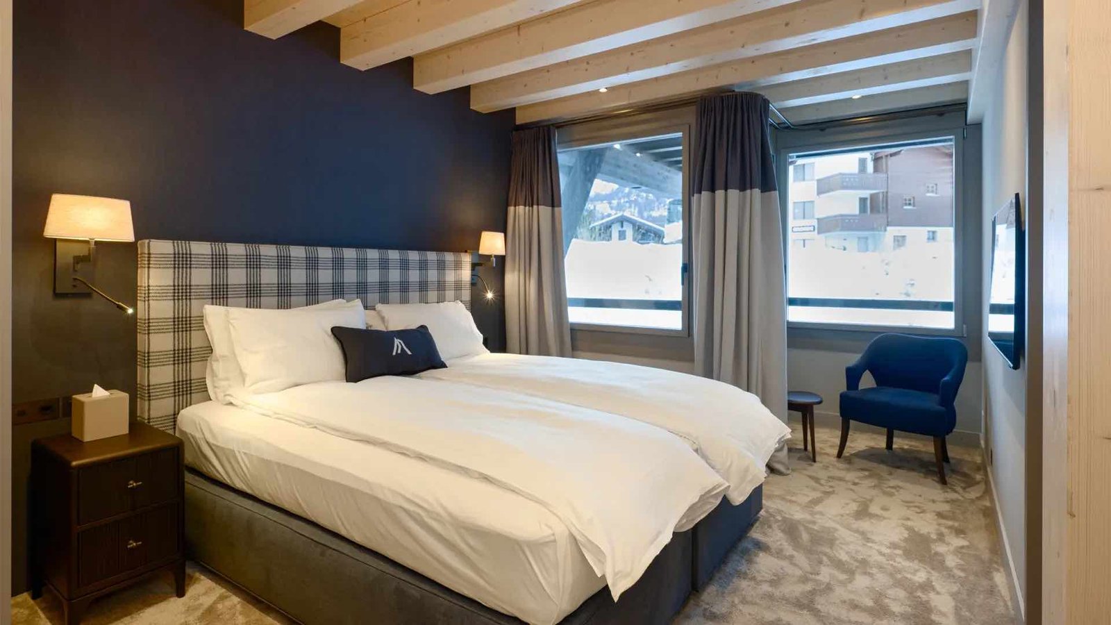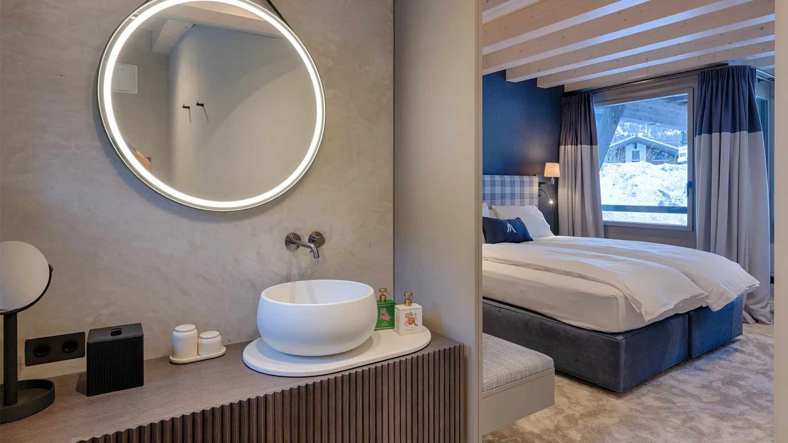 Sleeping up to eight guests plus one, the chalet features four beautifully styled king bedrooms with handcrafted furnishings, natural materials, and flexible bed configurations to suit families or groups. Each bedroom is thoughtfully finished with underfloor heating, bespoke detailing, and its own luxurious bathroom, creating a private and restful retreat after a day in the mountains.