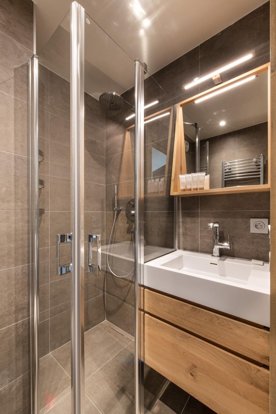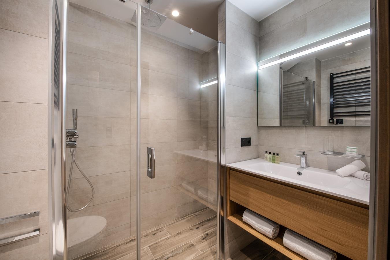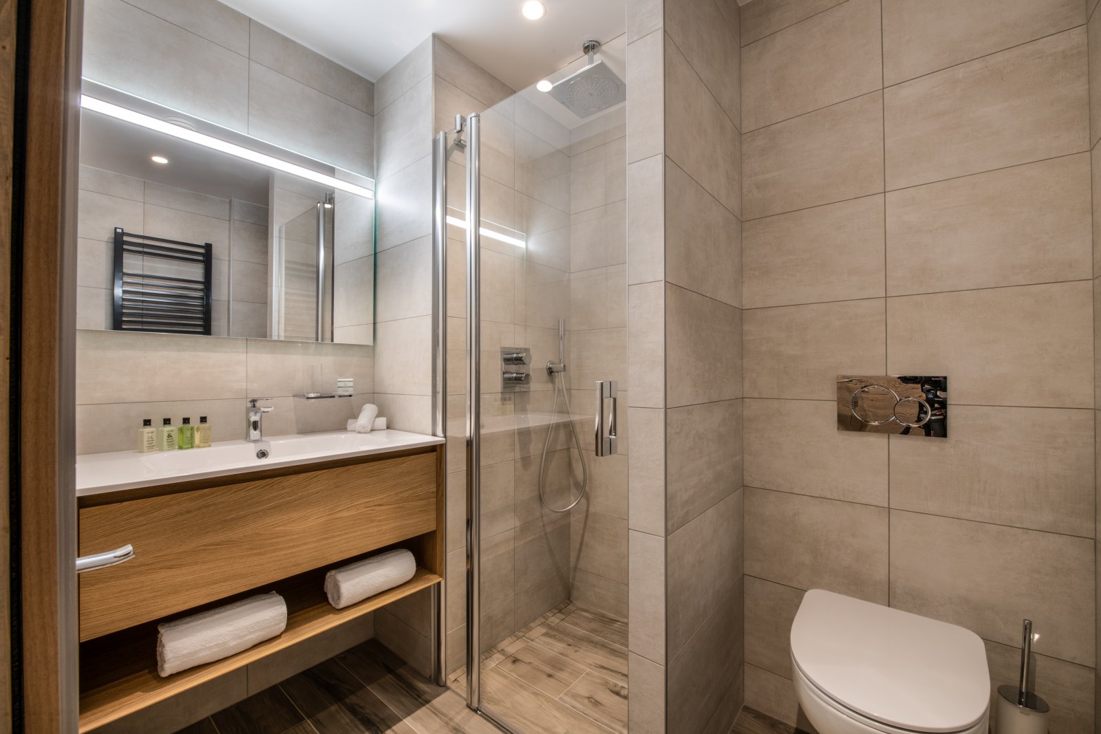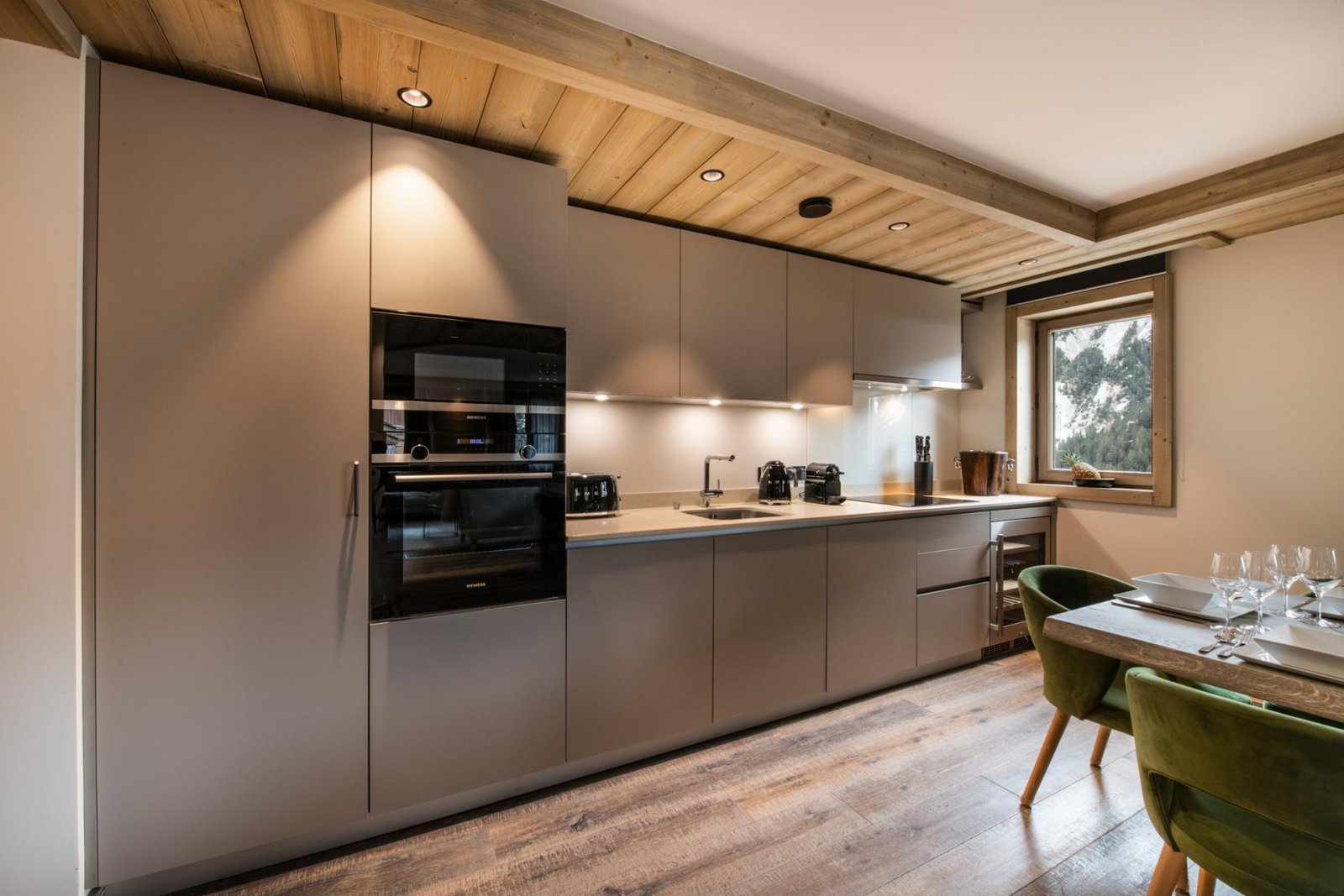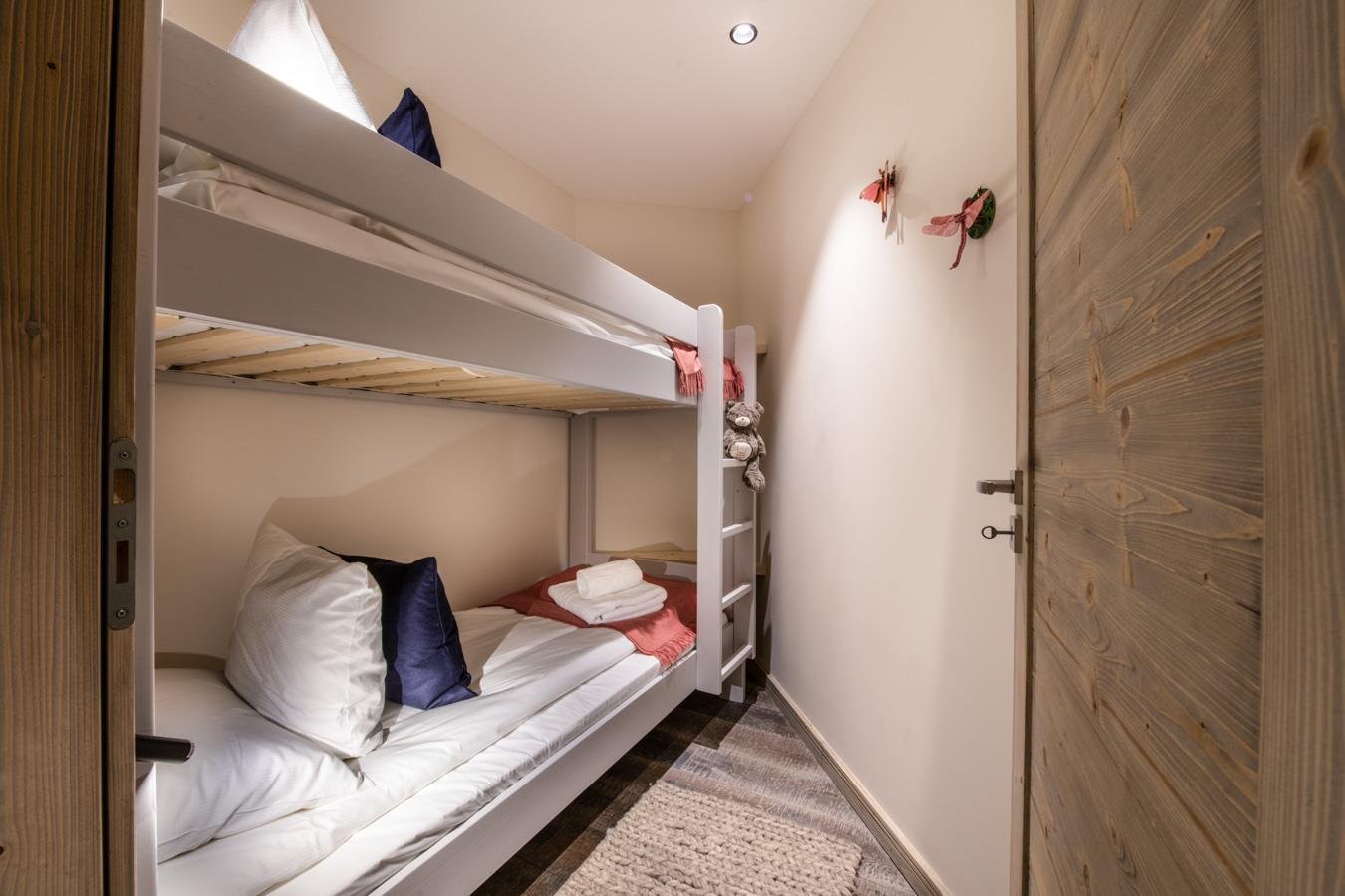 Among the Lodge’s standout accommodations is The Nanda Suite, located on the third floor. Spanning 135 sqm, it comfortably accommodates up to 10 guests (maximum 8 adults). The suite includes four double bedrooms, a cozy cabin room with a bunk bed, and four bathrooms. The spacious living area features a television, a fully equipped kitchen, and a balcony offering stunning views over the mountains and the valley — an ideal retreat for families or groups seeking comfort, space, and style in the heart of Courchevel.