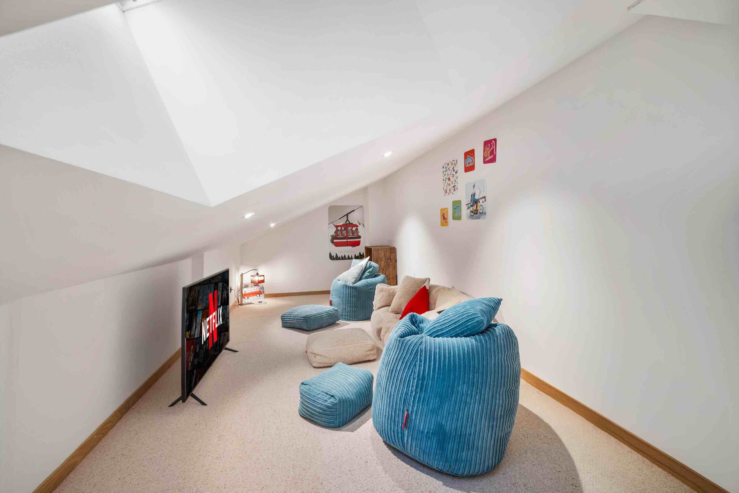 A cozy attic-level TV room offers the perfect hideaway for children or relaxed movie nights, featuring bean bags and a flat-screen TV.