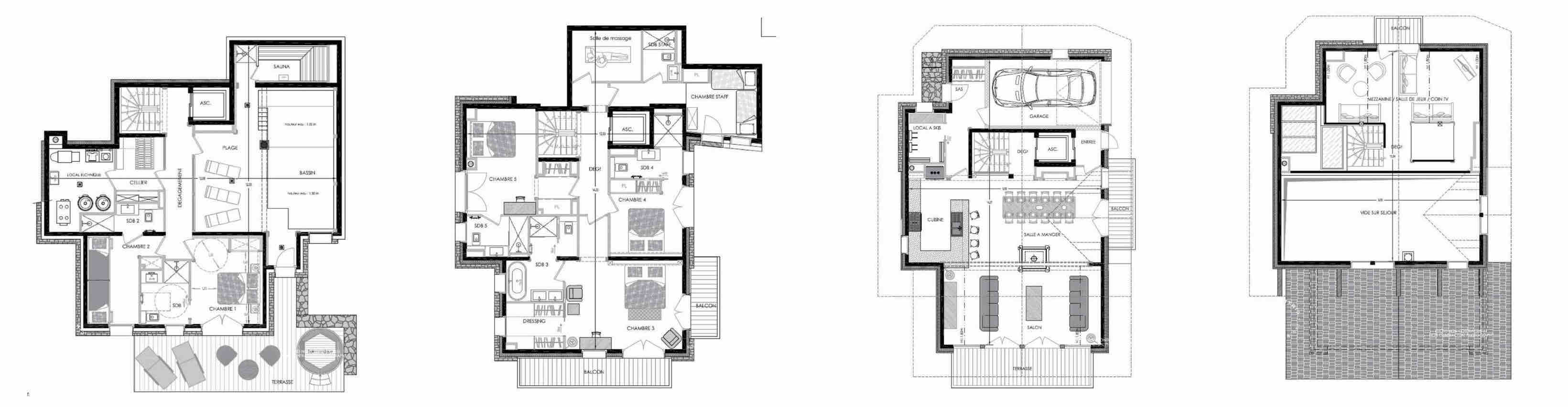 The ground floor is home to the chalet’s standout feature: its private spa sanctuary. Here you’ll find a spacious indoor swimming pool, sauna, and a relaxation lounge by the water. Step outside to soak in the cedar wood hot tub, where the contrast of warm water and crisp alpine air is truly invigorating. A dedicated massage room completes the wellness offering, ensuring total relaxation during your stay.