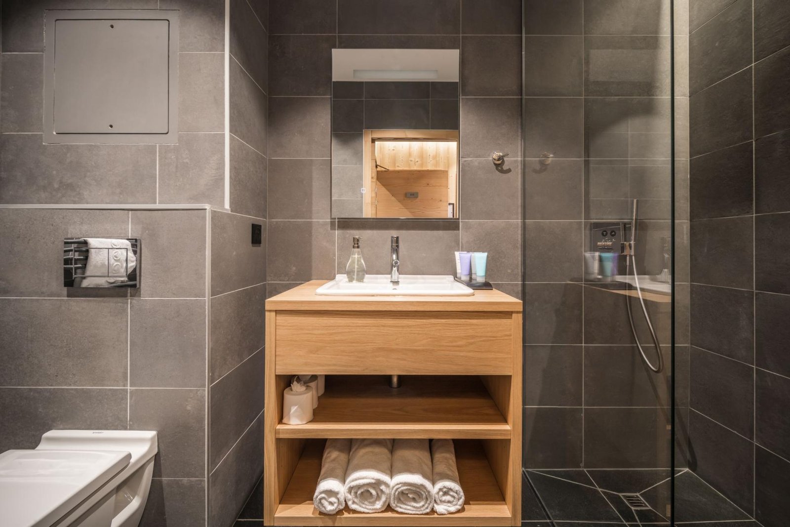 The open-plan living and dining area is both spacious and inviting, complete with a contemporary fireplace and large balcony where you can soak up breathtaking views towards Mont Blanc. Whether you’re unwinding with afternoon tea or enjoying a glass of wine as the sun sets over the mountains, Suite Yogi provides a warm and welcoming retreat after a day on the slopes.
