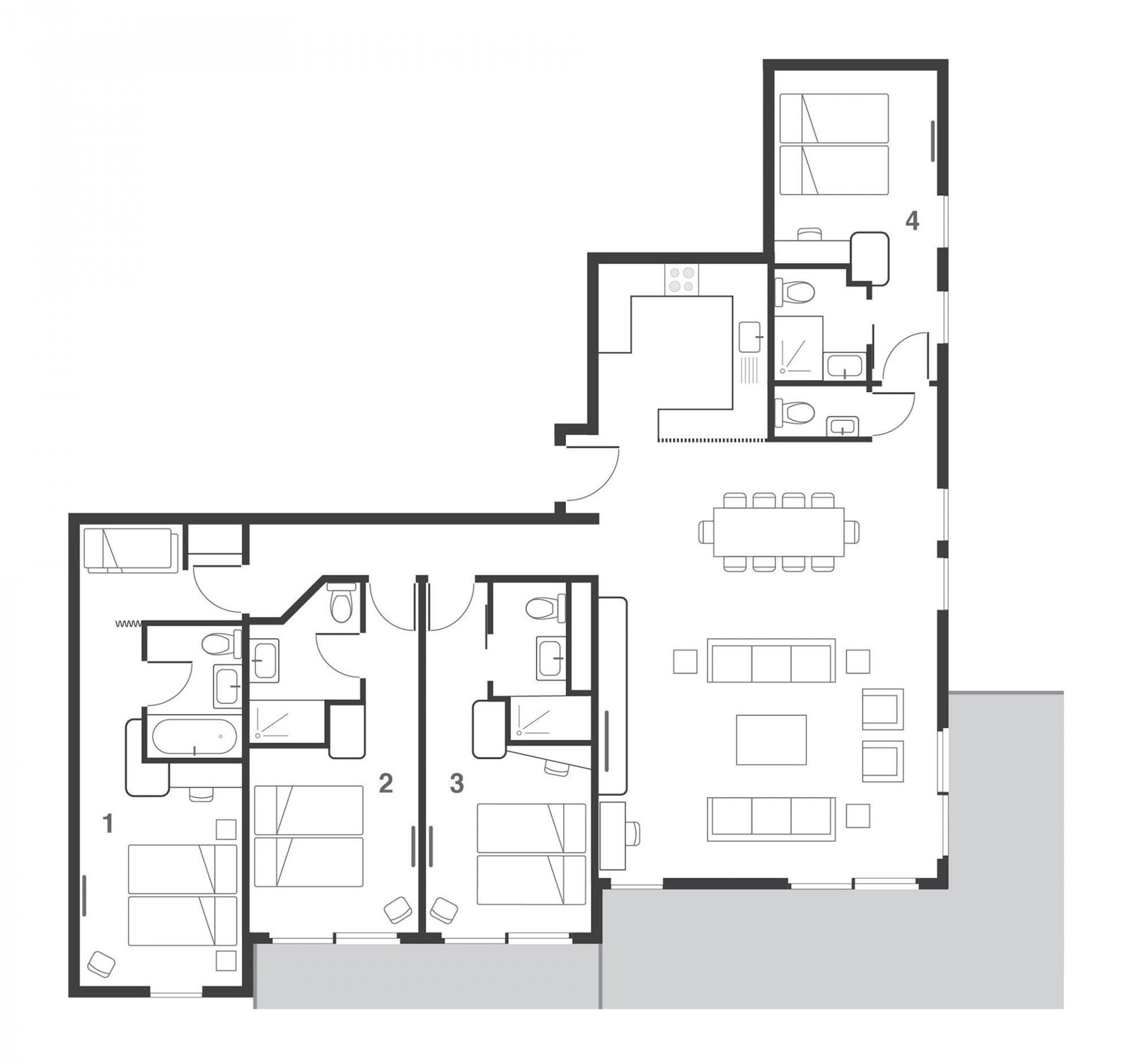 Designed for comfort and sociability, the chalet sleeps 8–10 guests across four elegant en suite bedrooms, including a family-friendly room with additional bunk beds, ideal for groups of friends or two families travelling together.