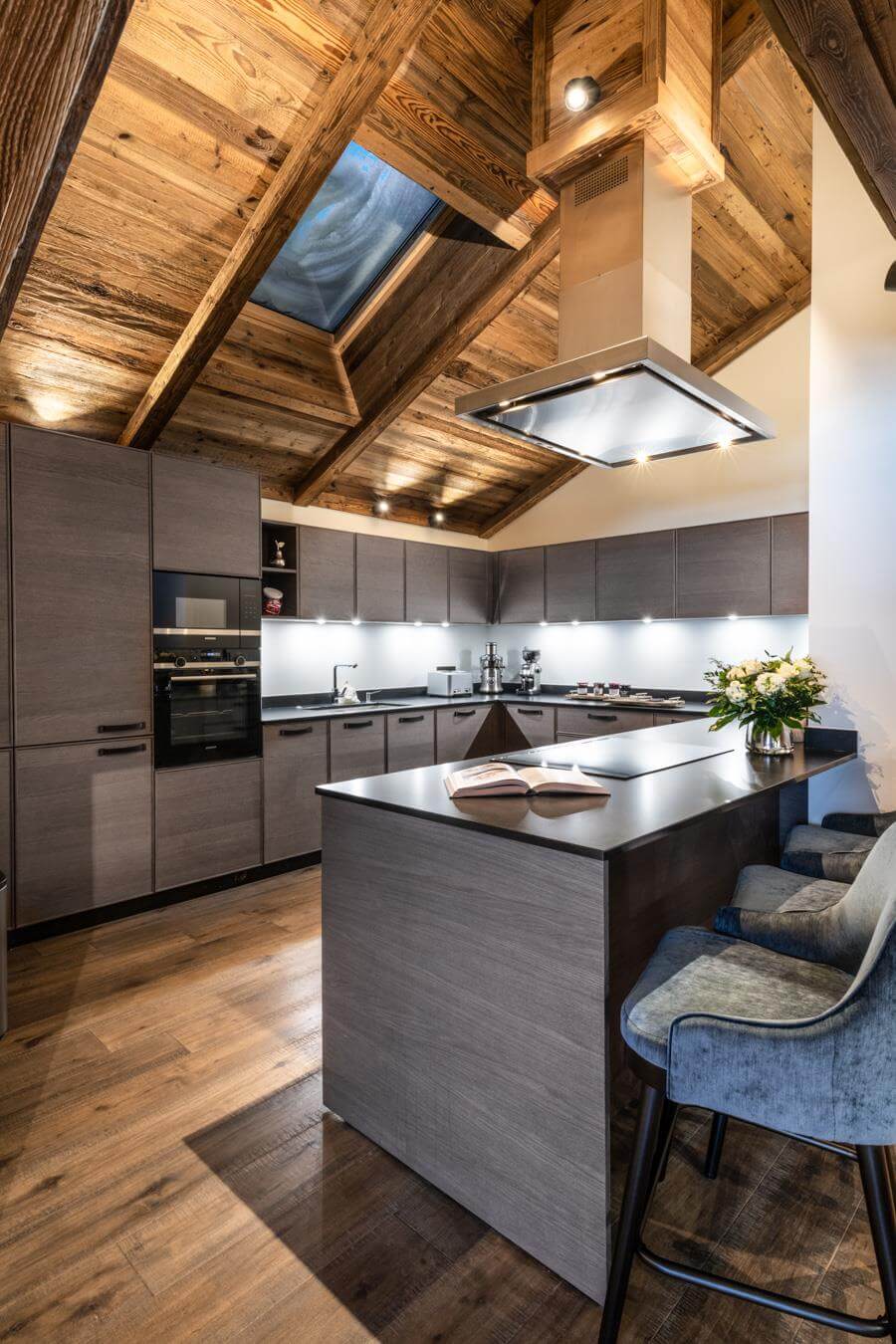 In the evenings, the large wooden dining table comfortably seats the whole group for leisurely dinners, complemented by striking comic book artwork that adds a touch of modern flair to the traditional alpine décor. The adjoining fully equipped kitchen and breakfast bar make home cooking a pleasure, ideal for convivial evenings spent in.