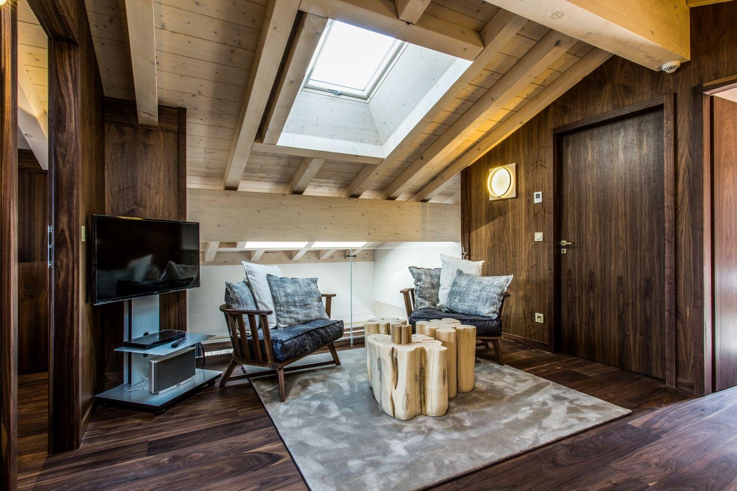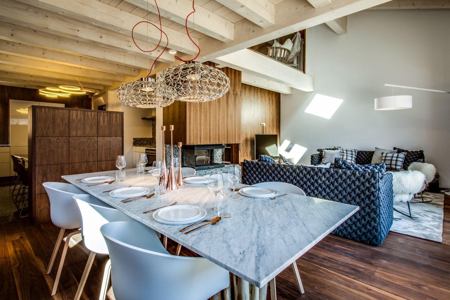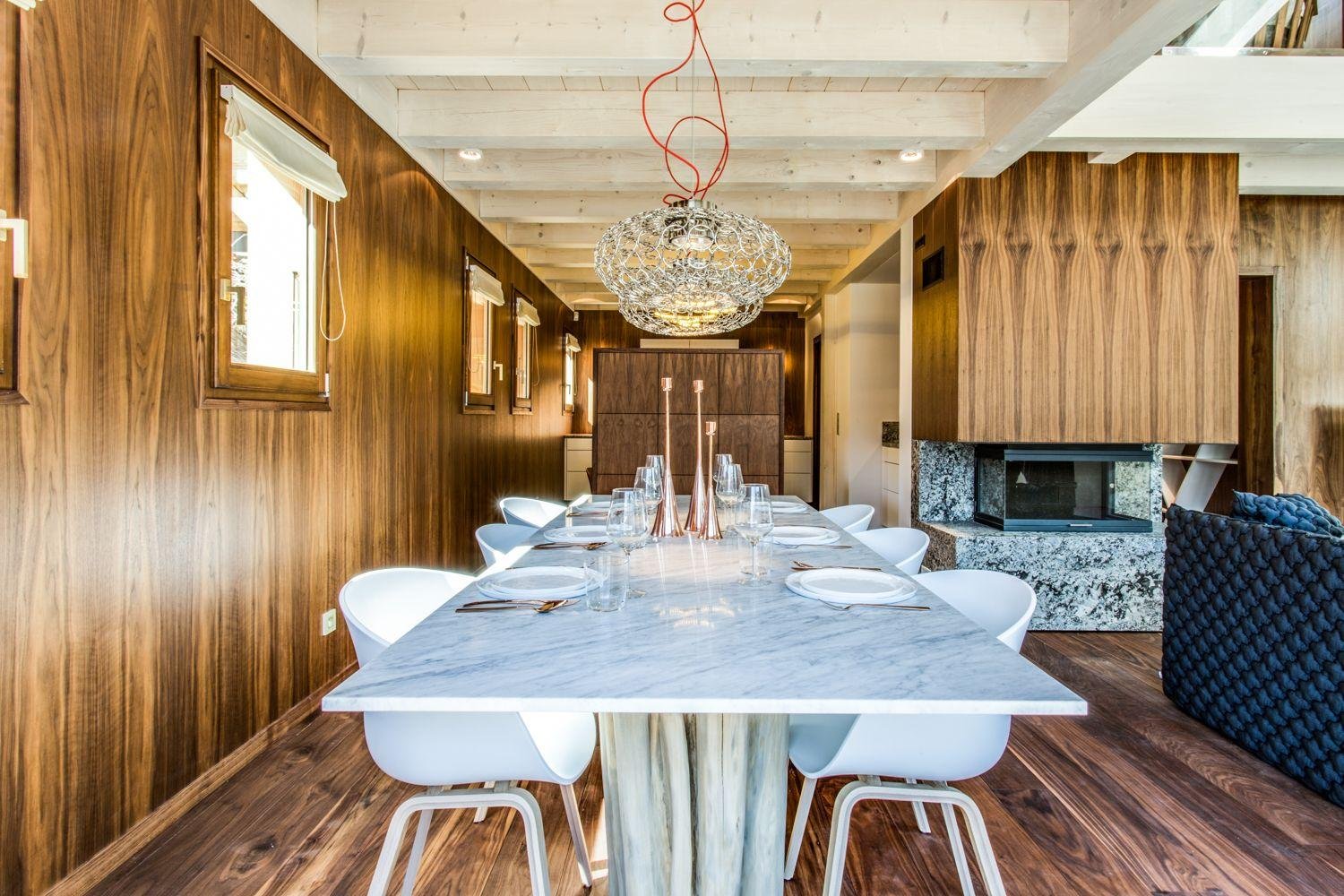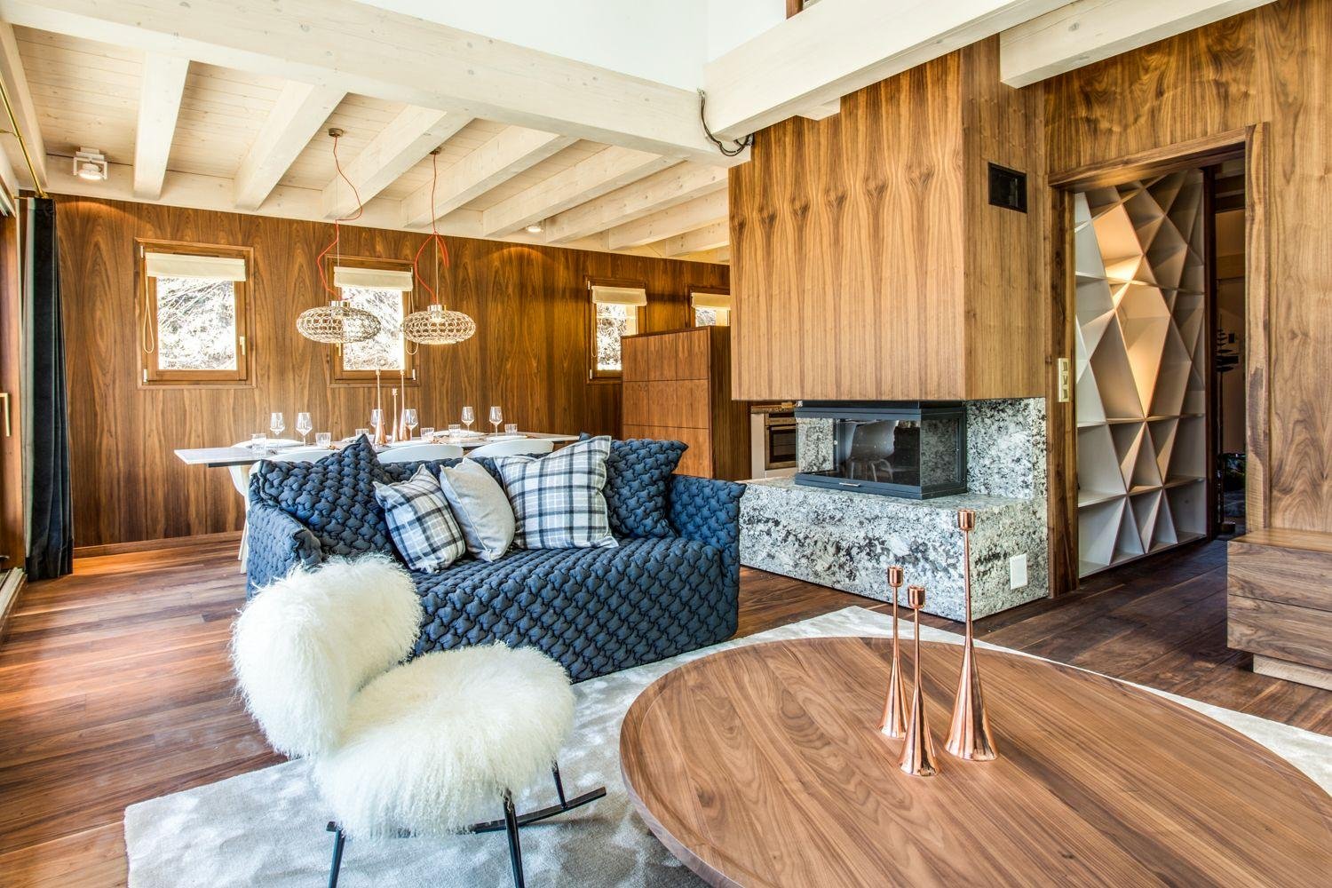 Set over three floors, the chalet features a bright open-plan living space with large windows framing breathtaking mountain views. After a day on the slopes, unwind on plush sofas beside the log-burning fireplace or gather around the dining table for relaxed evenings with friends and family.