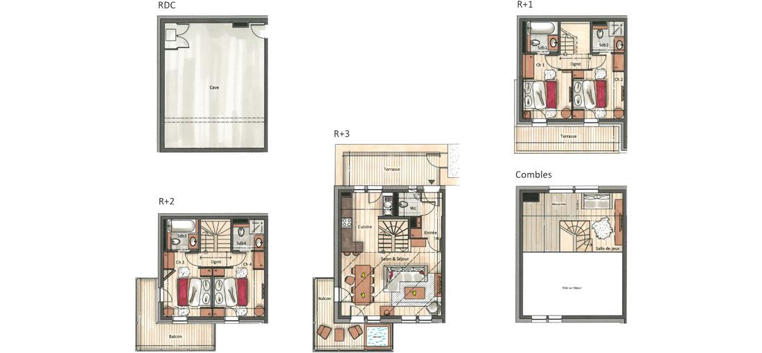 The chalet features 4 en-suite double bedrooms, each designed with warm wooden accents and soft furnishings to evoke traditional alpine charm. Three of the bedrooms open onto balconies, offering serene views of the surrounding forest and snow-covered mountains. For added flexibility, a sofa bed on the mezzanine can sleep 2 extra guests on request.